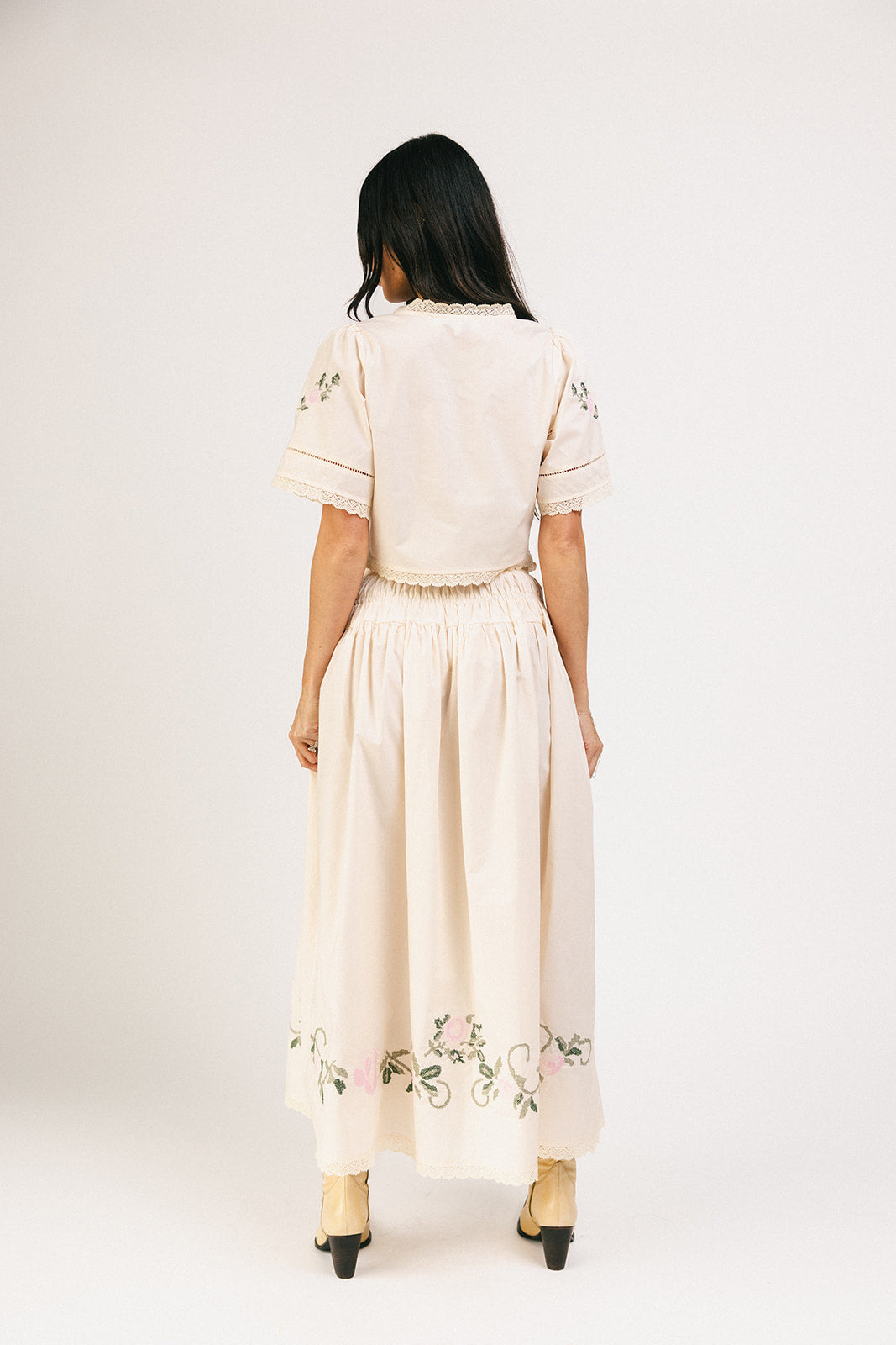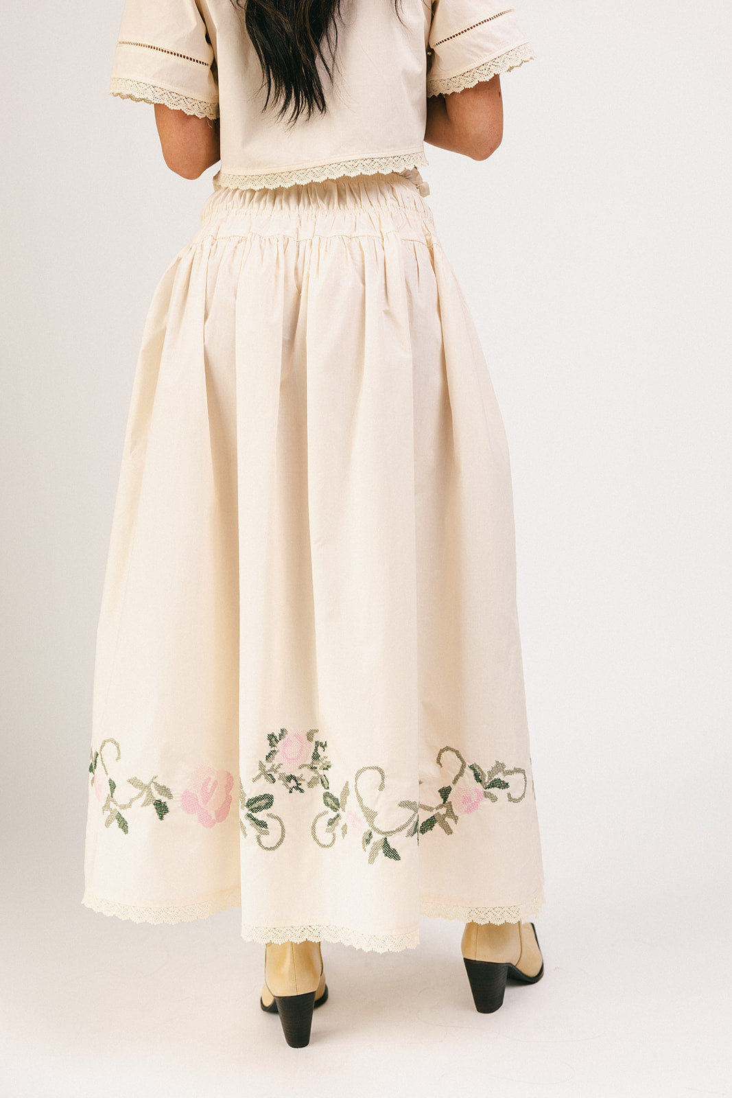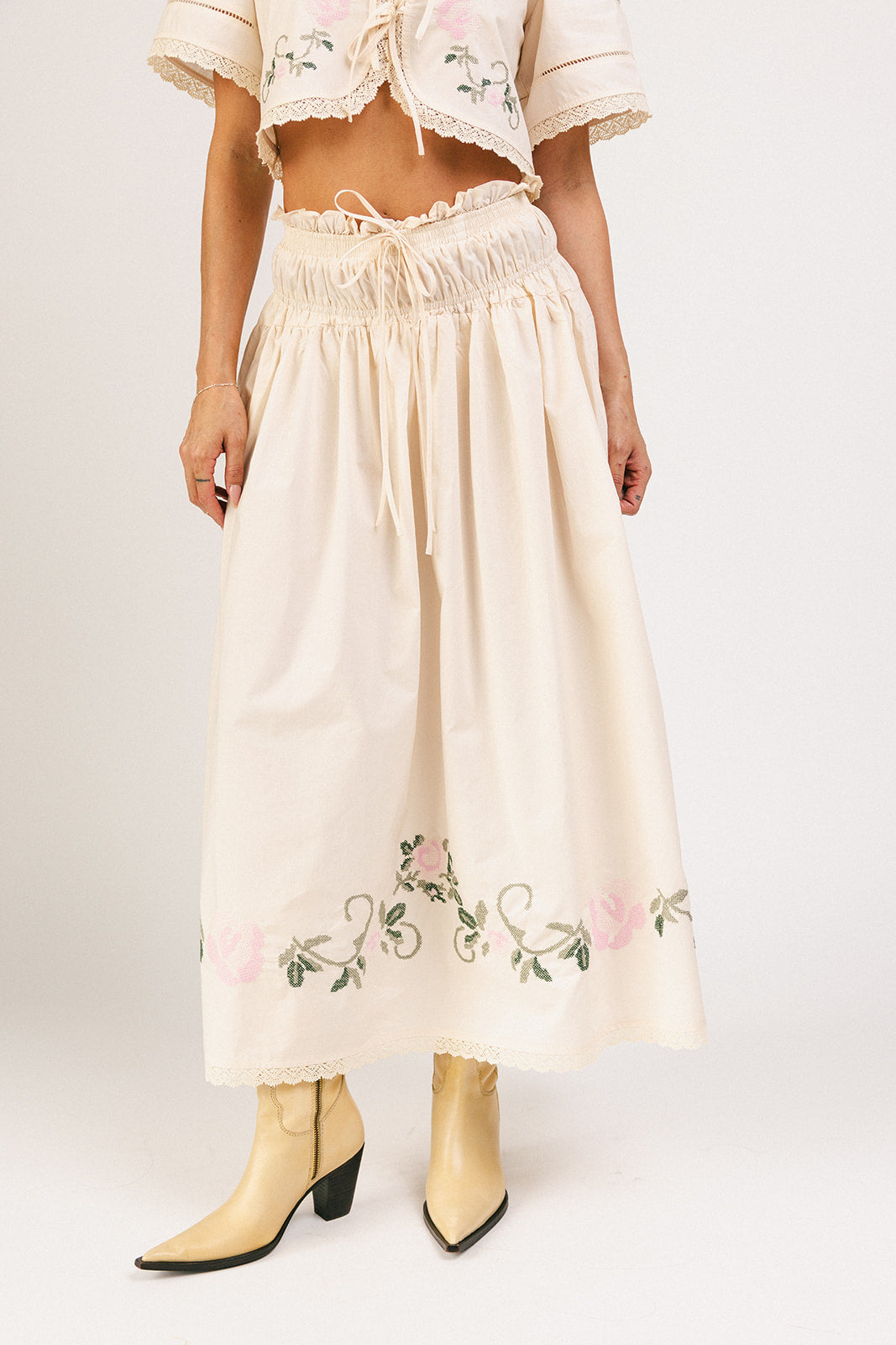 drop jaws + turn heads with this floral embroidered skirt set. a lace-up top + maxi skirt duo, it features dainty lace trim + intricate embroidery. wear the pieces together for an iconic spring // summer ensemble, or separately to elevate any outfit.