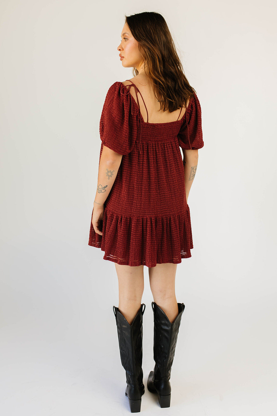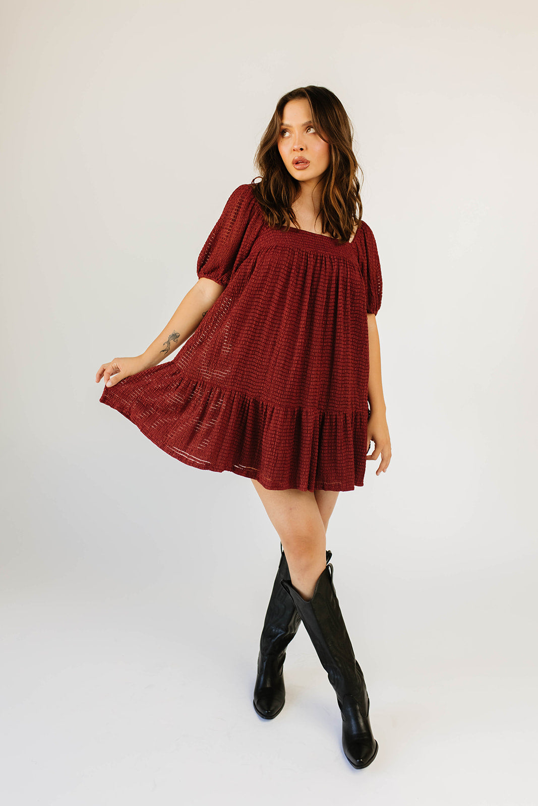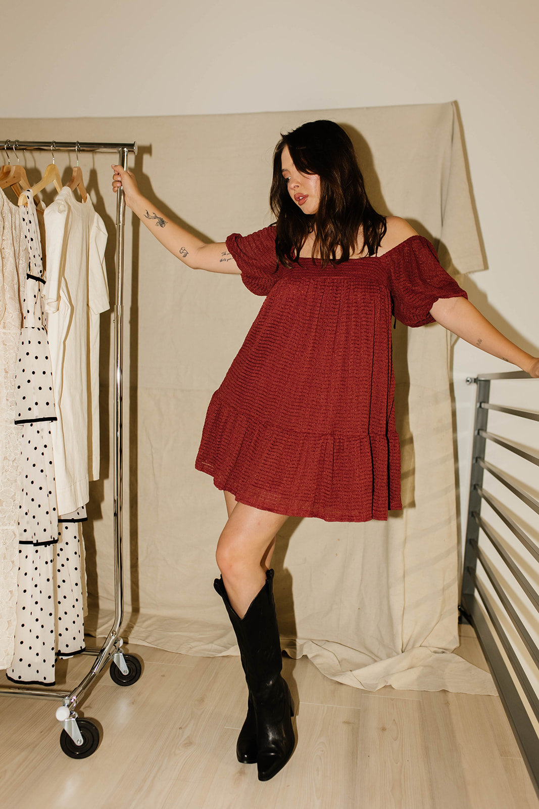 a versatile essential, this spicy mini dress will take you from day to night with ease. the flowy silhouette gives it a casual feel, while the deep red color gives it a moody edge. we love it dressed up with knee high boots, or down with chunky sneakers.