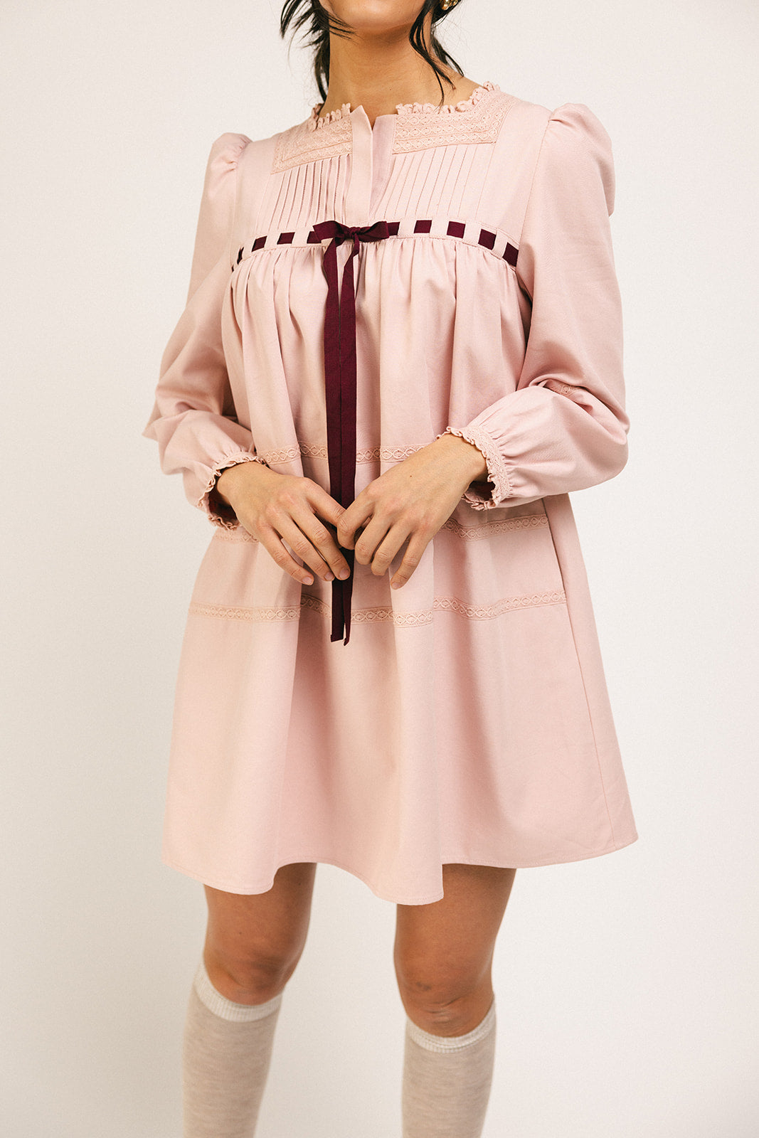 • pink // mini length, high square neckline, adjustable front bow, pockets, lined, pleated detailing, lace trim neckline, back zipper closure, button closure on cuffs