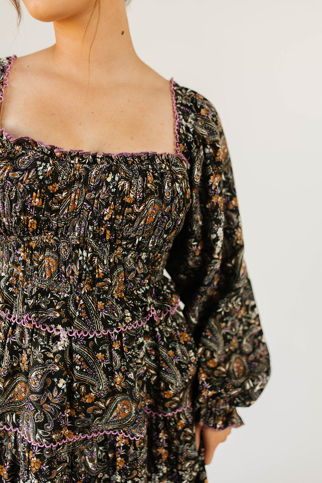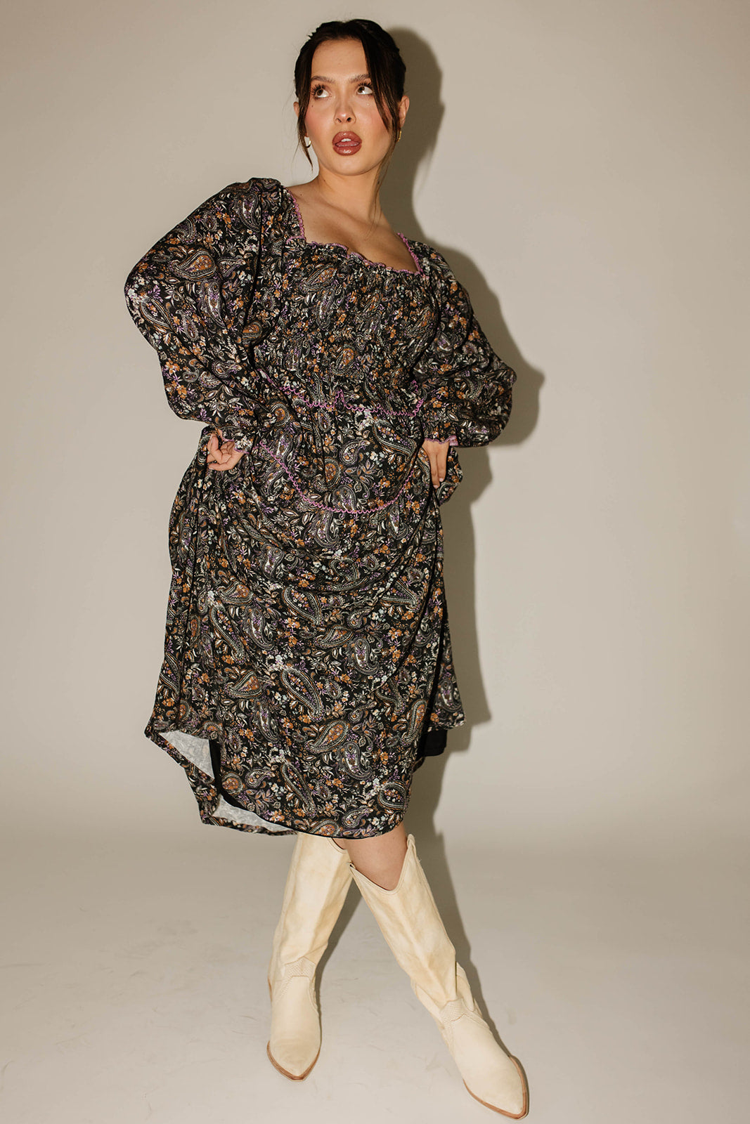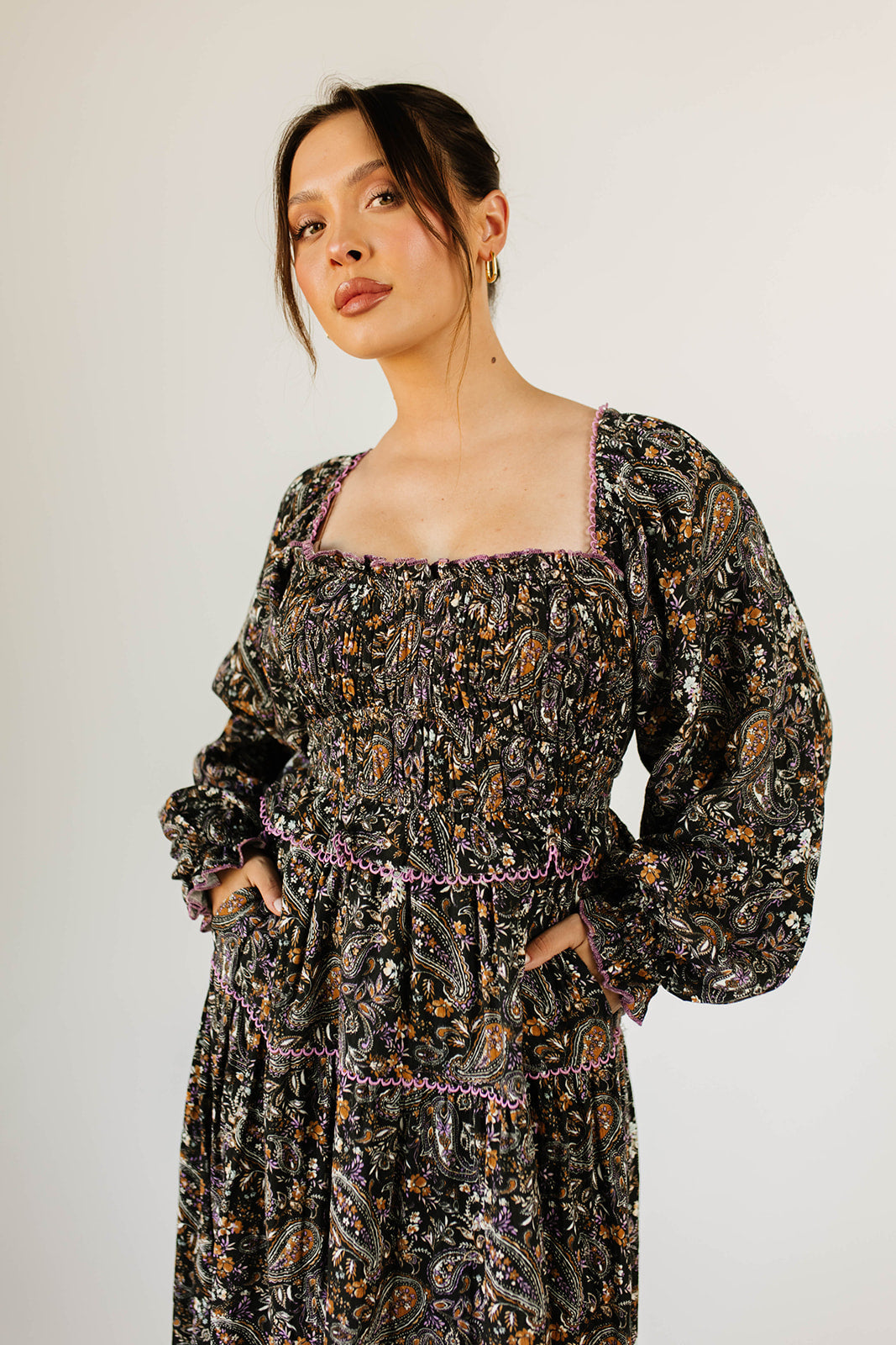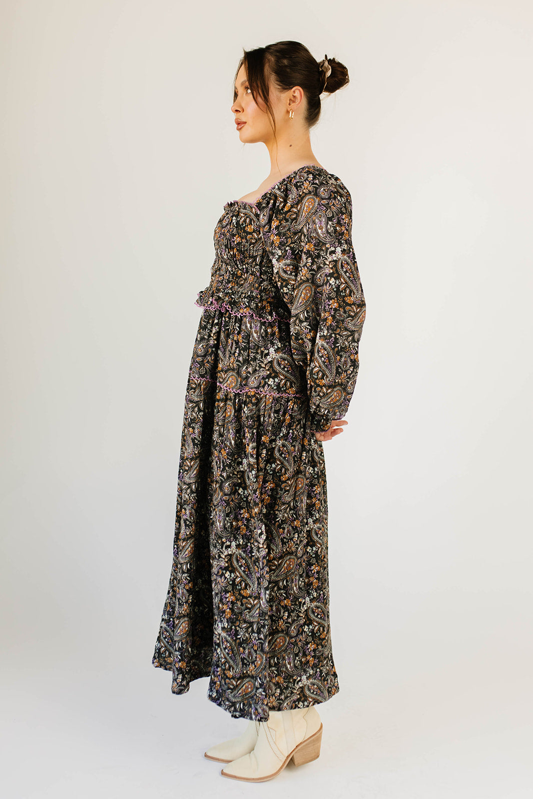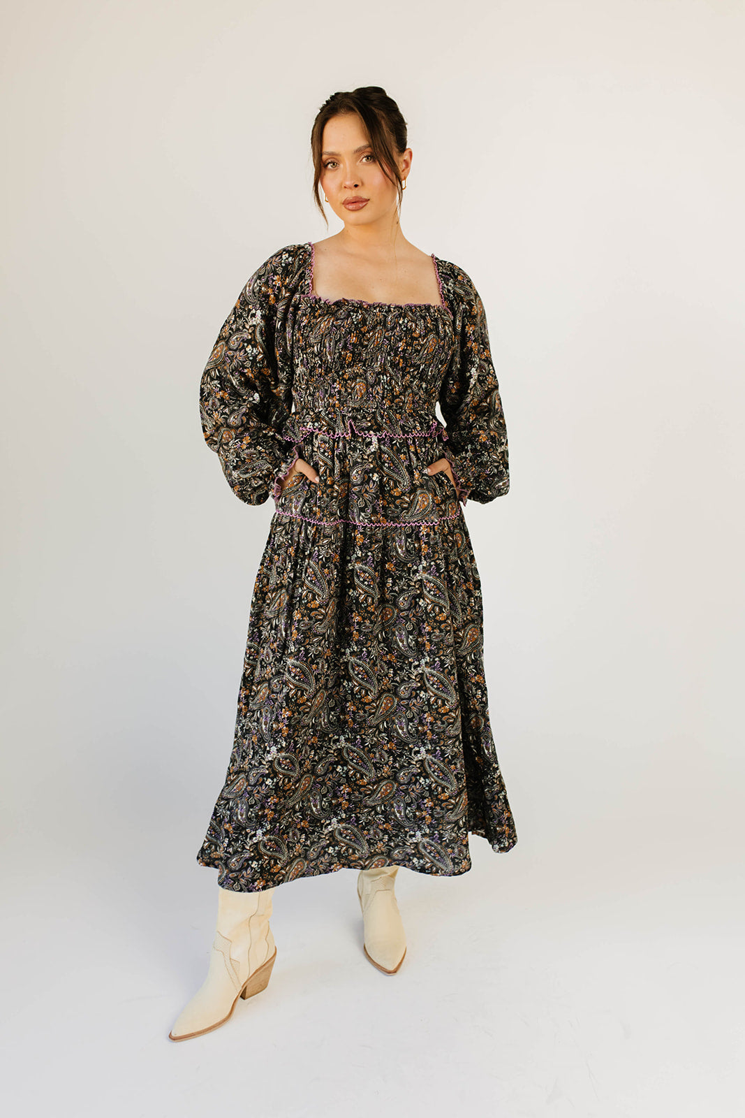 Den inte så enkla drömklänningen, denna paisleymönstrade långärmade maxiklänning, tar dig enkelt från dag till kväll. Med subtila volangdetaljer och lila kanter är den perfekt för att ge din höst-/vintergarderob en färgklick.