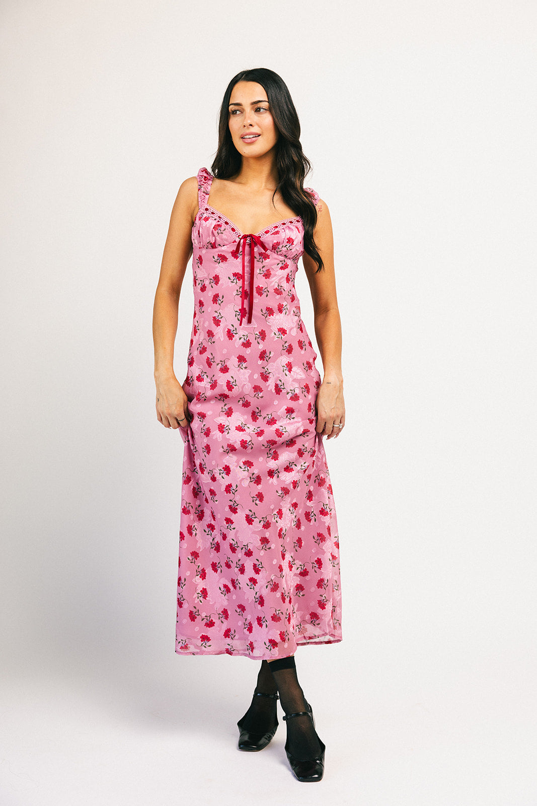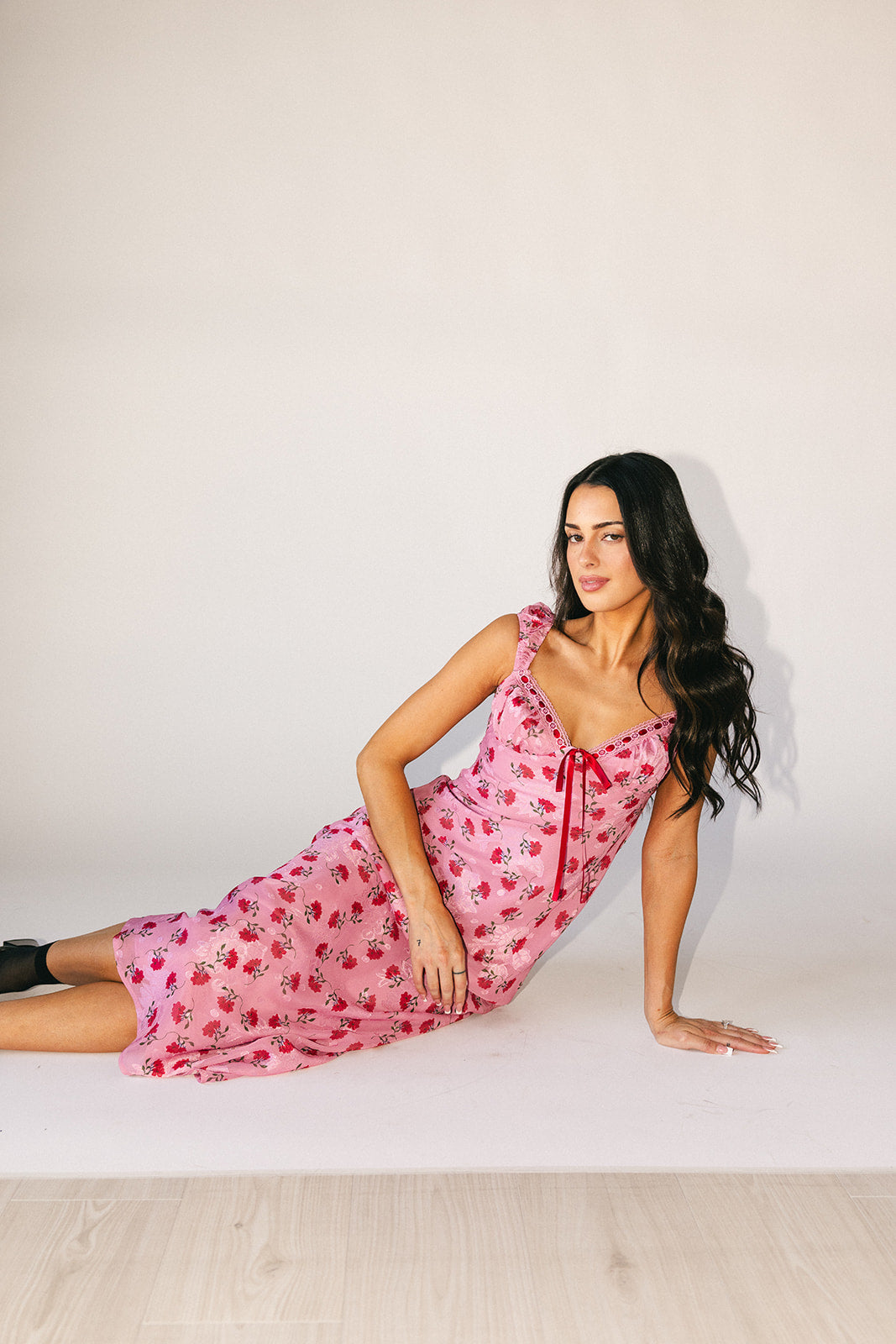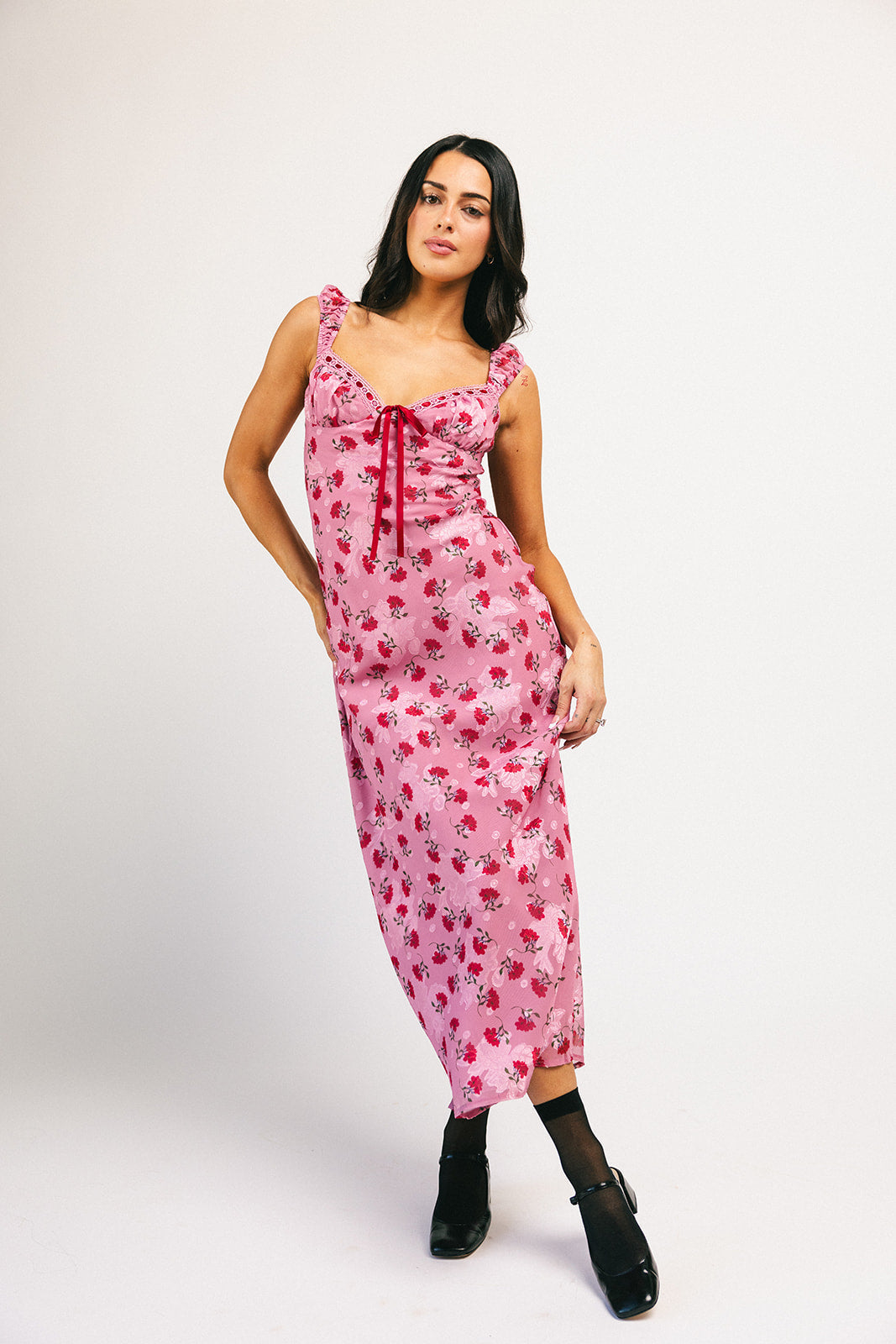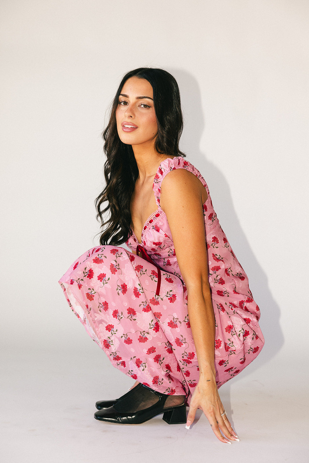 Superromantisk + extra flörtig, denna rosa + röda underklänning garanterar att dra till sig uppmärksamhet. Med sin feminina hjärtformade halsringning + vintageröda blommönster är det en tidlös klänning du kommer att bära om och om igen. Ett måste för middagsdejter, cocktailpartyn och vår- // sommarbröllop.