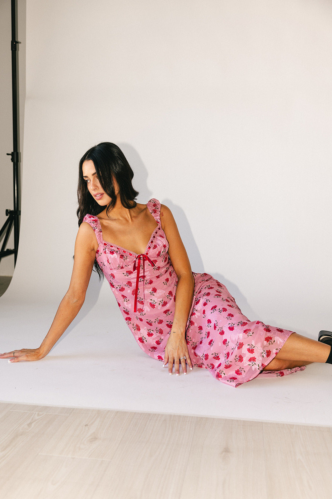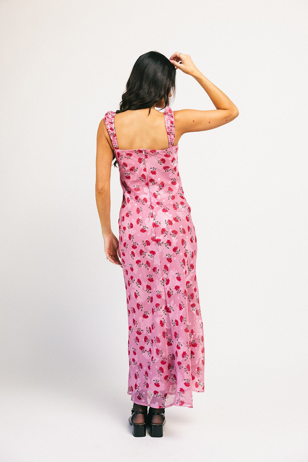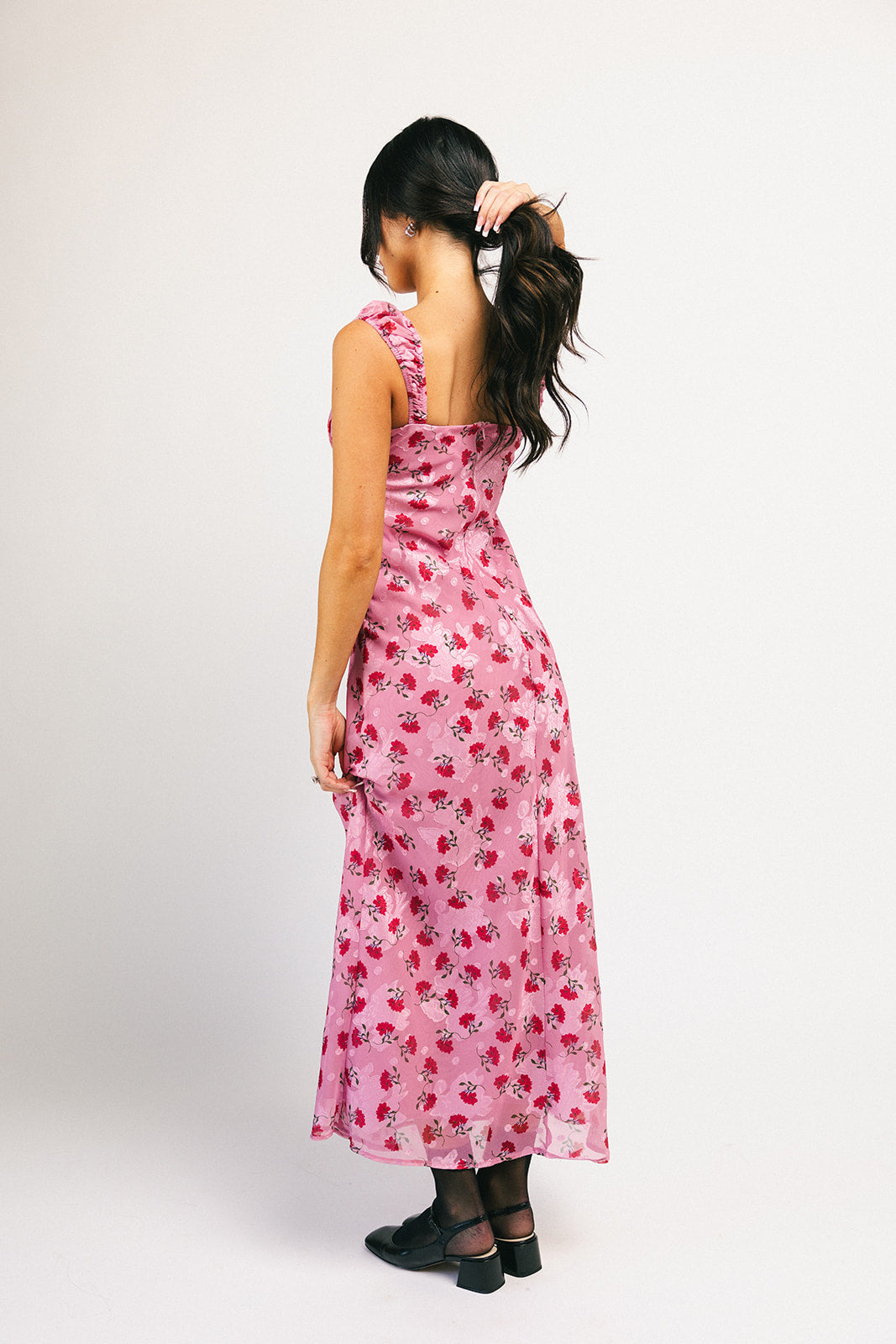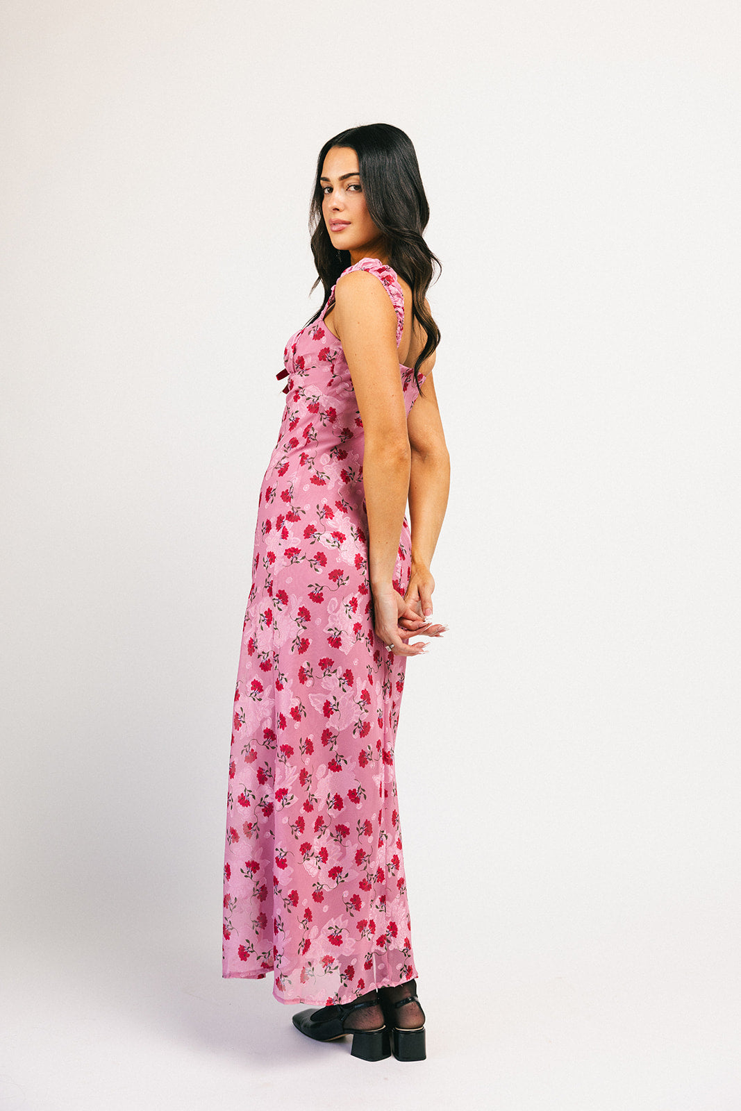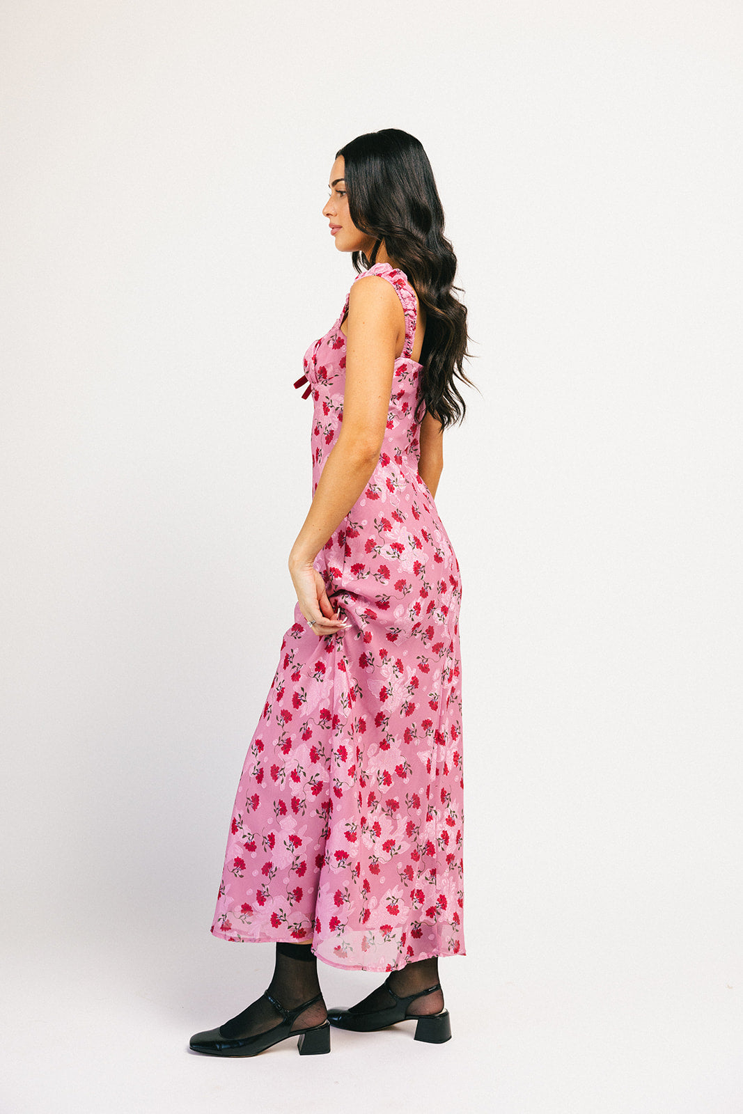 Superromantisk + extra flörtig, denna rosa + röda underklänning garanterar att dra till sig uppmärksamhet. Med sin feminina hjärtformade halsringning + vintageröda blommönster är det en tidlös klänning du kommer att bära om och om igen. Ett måste för middagsdejter, cocktailpartyn och vår- // sommarbröllop.
