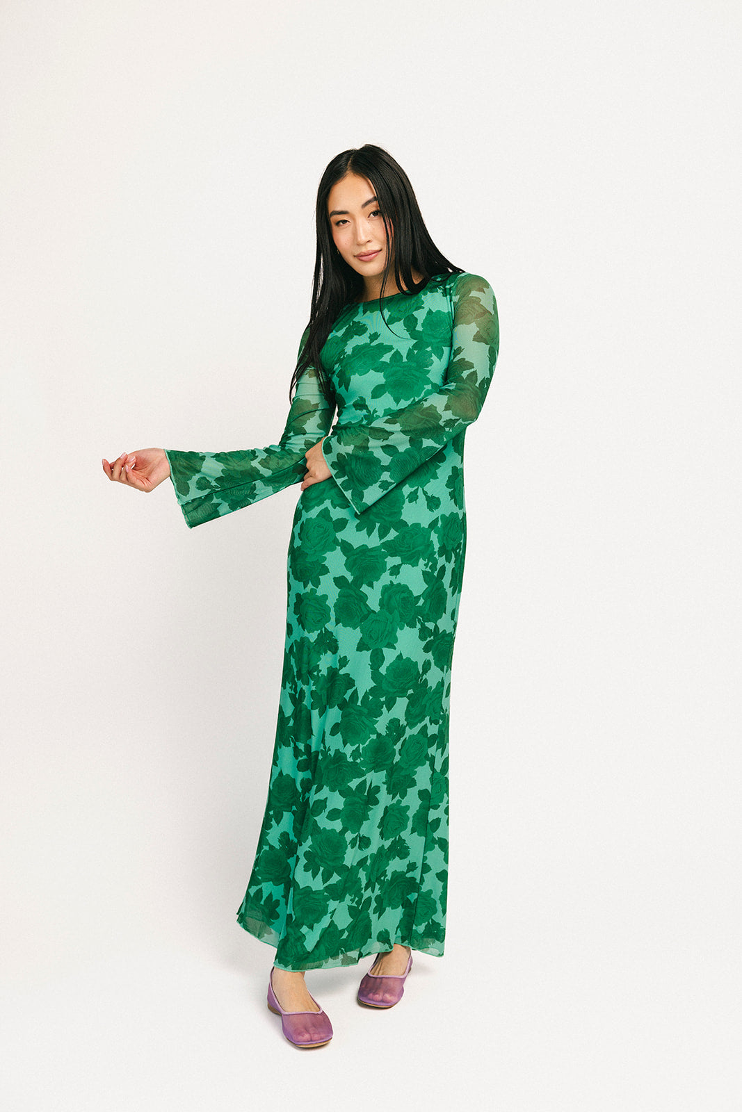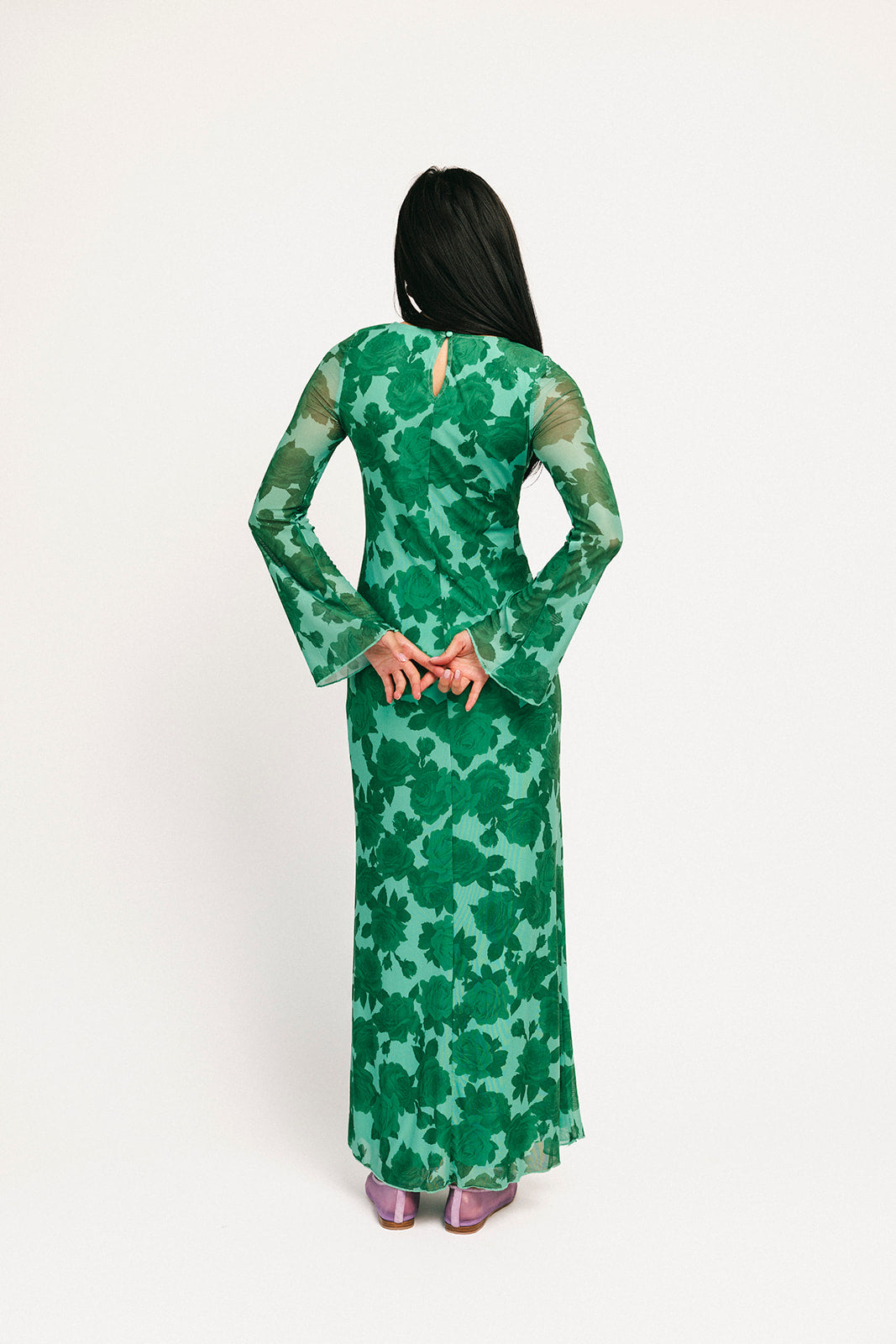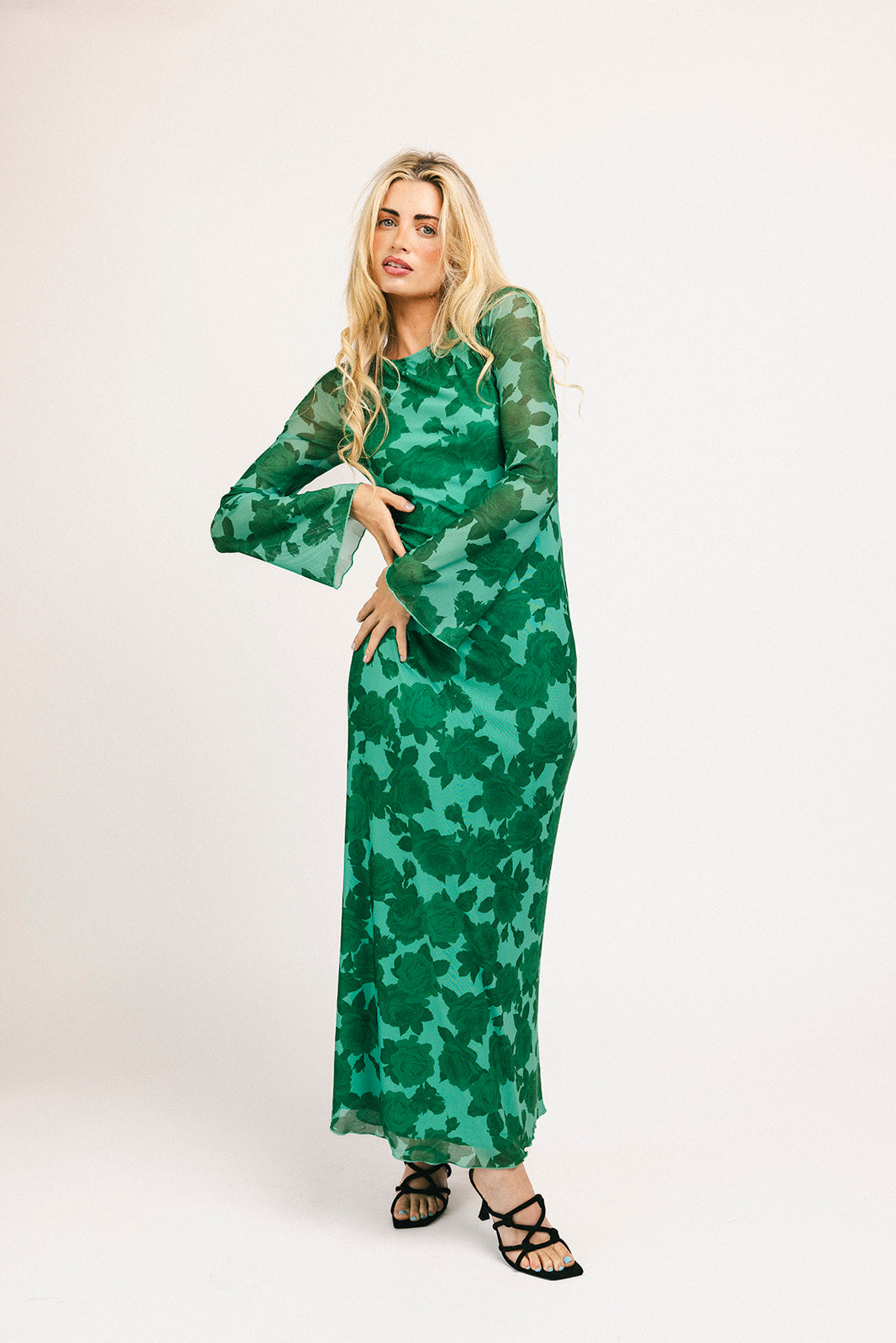 • grön // maxilängd, rund halsringning, blommigt meshöverlägg, helfodrad, transparenta klockärmar, nyckelhålsknappstängning bak, salladsfärgad fåll