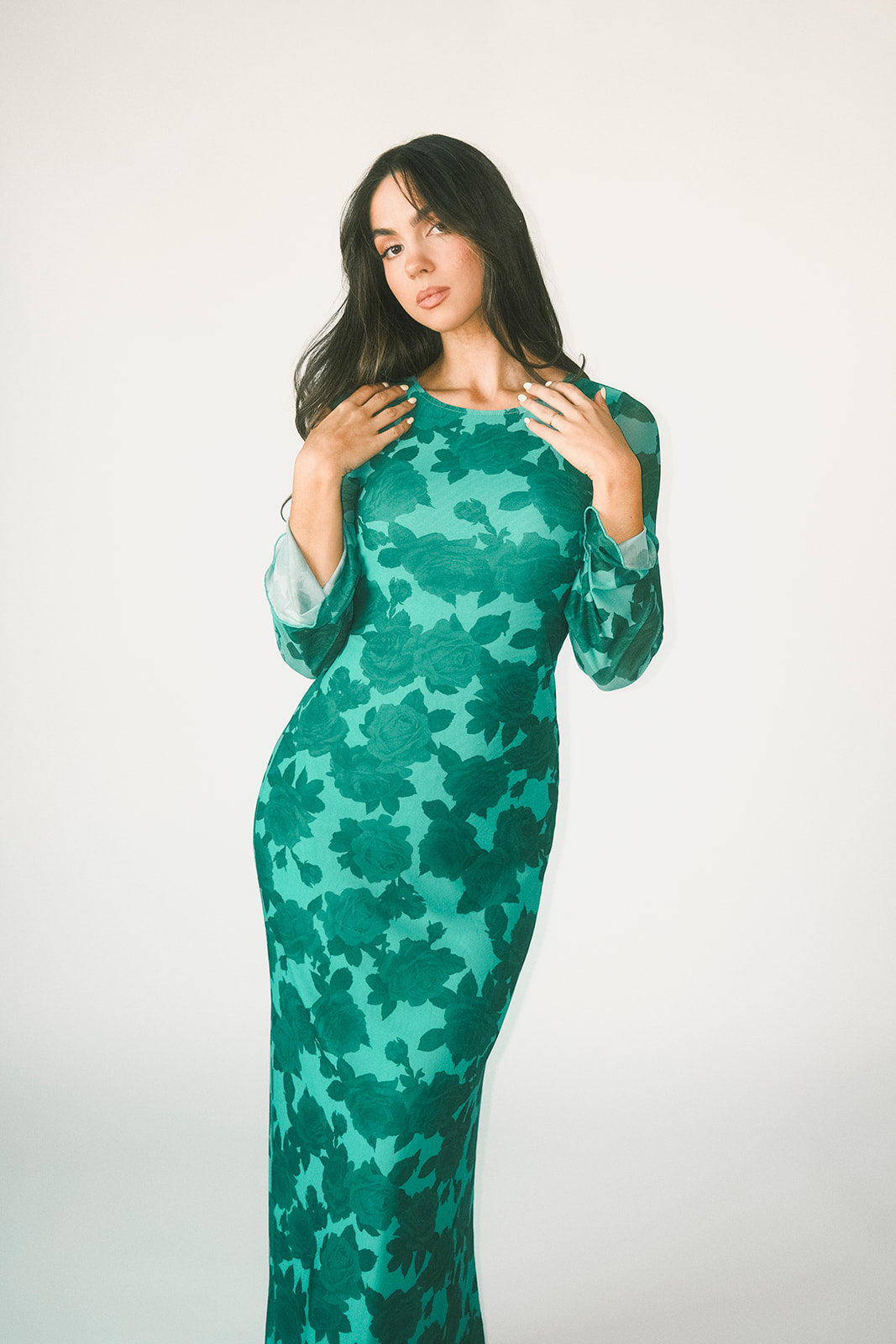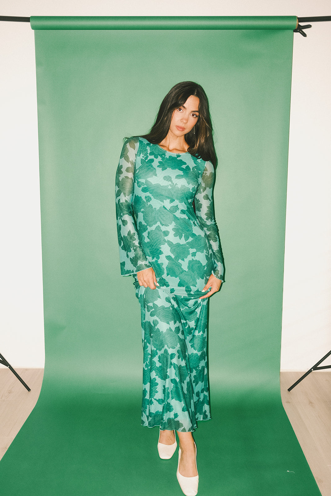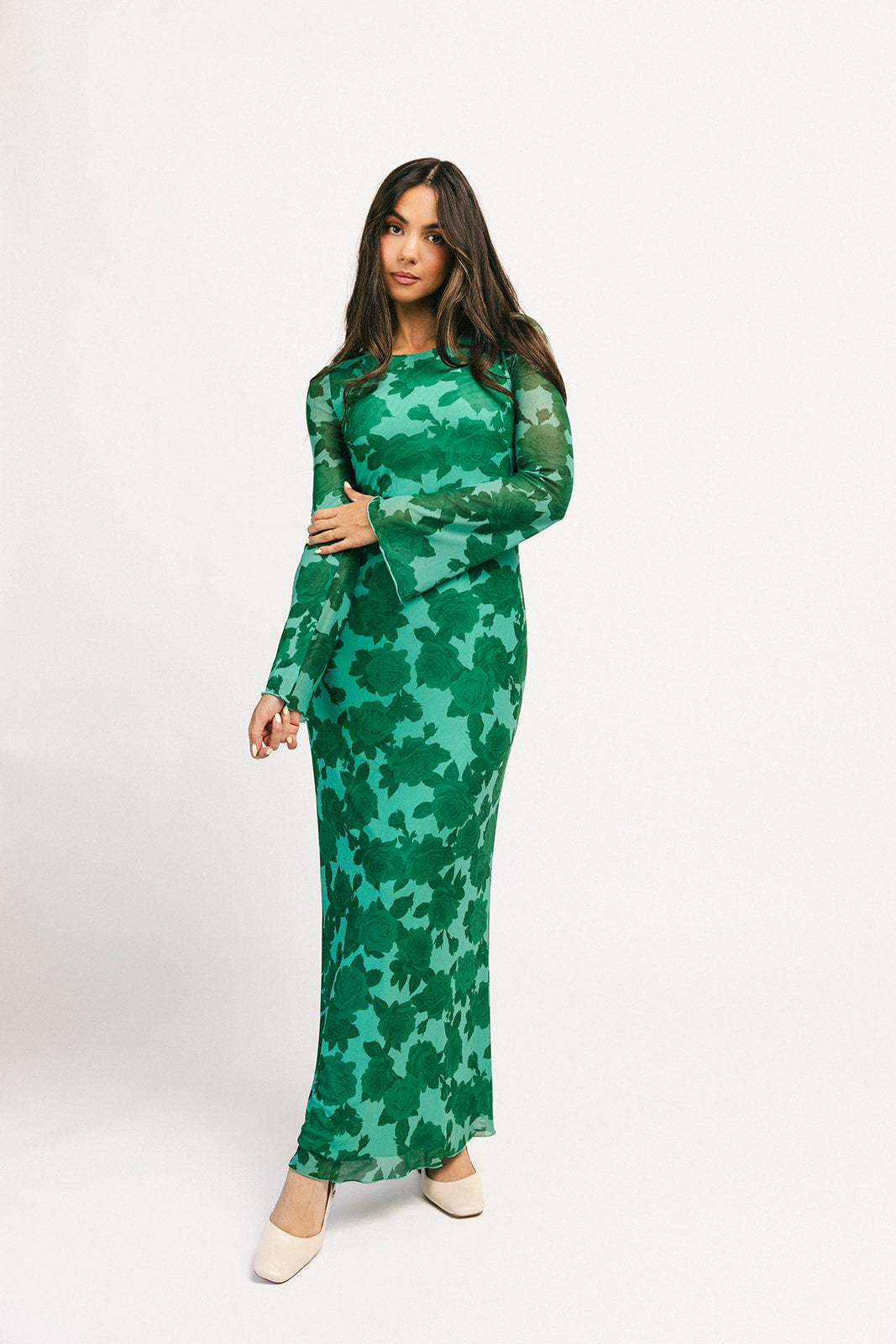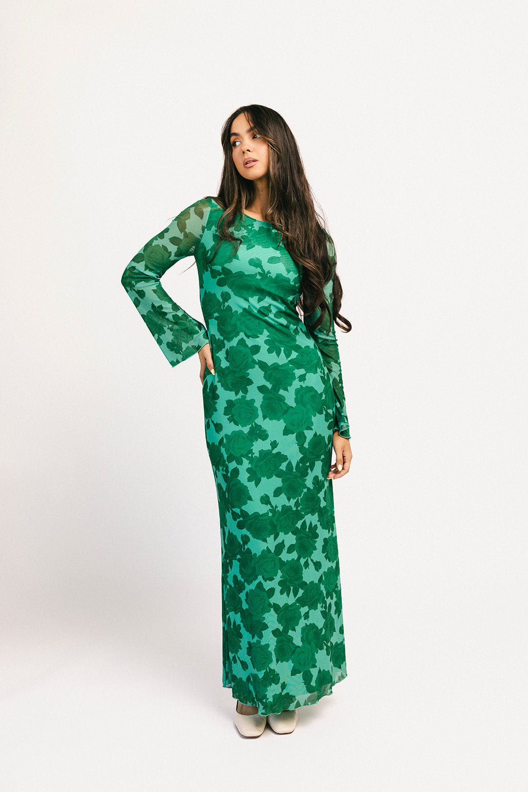 • grön // maxilängd, rund halsringning, blommigt meshöverlägg, helfodrad, transparenta klockärmar, nyckelhålsknappstängning bak, salladsfärgad fåll