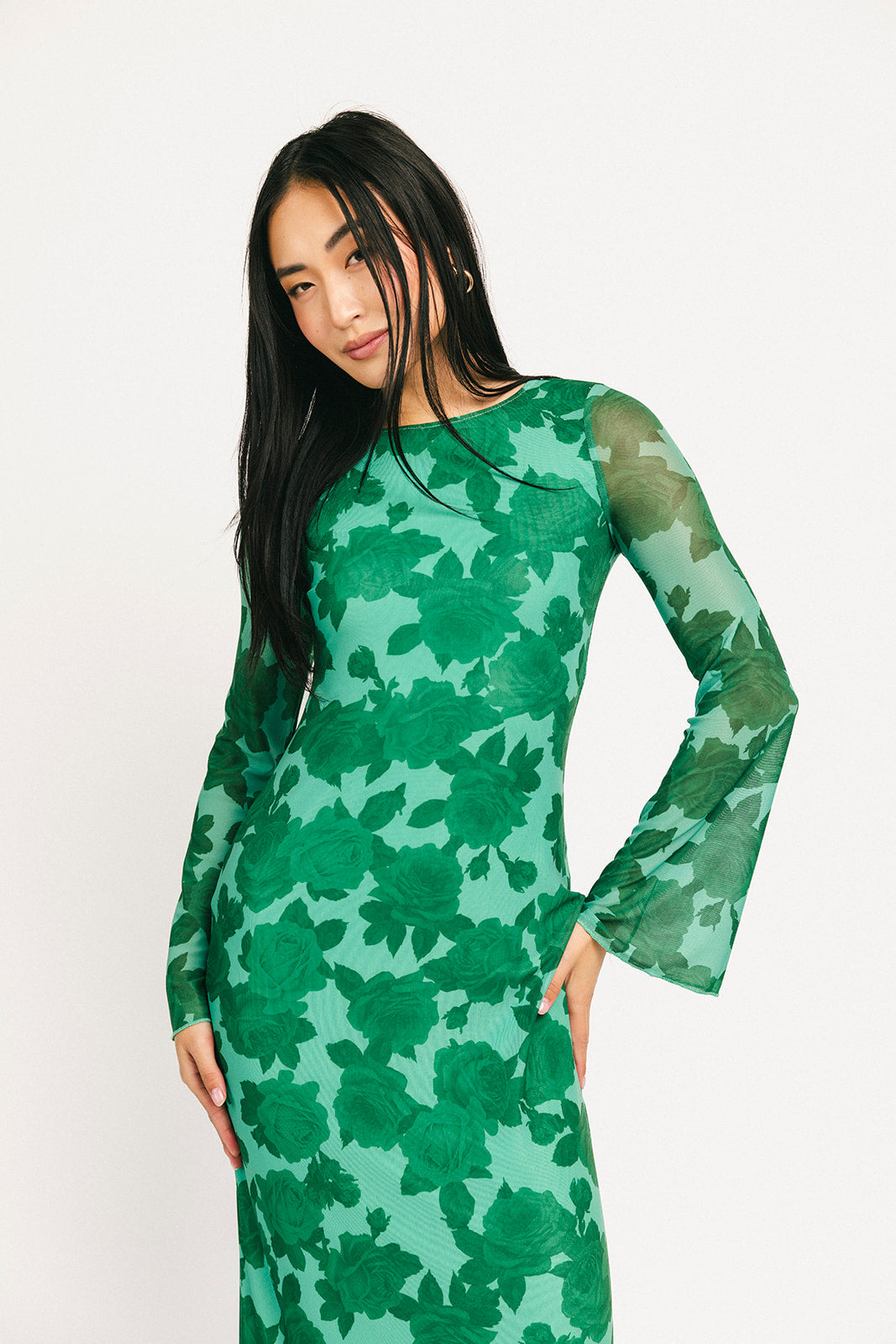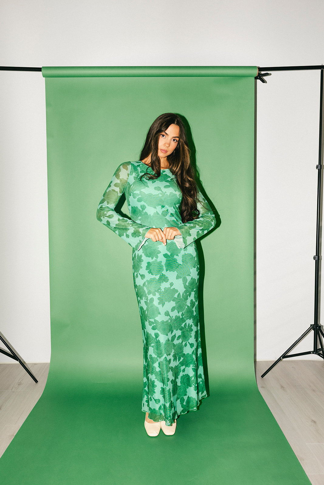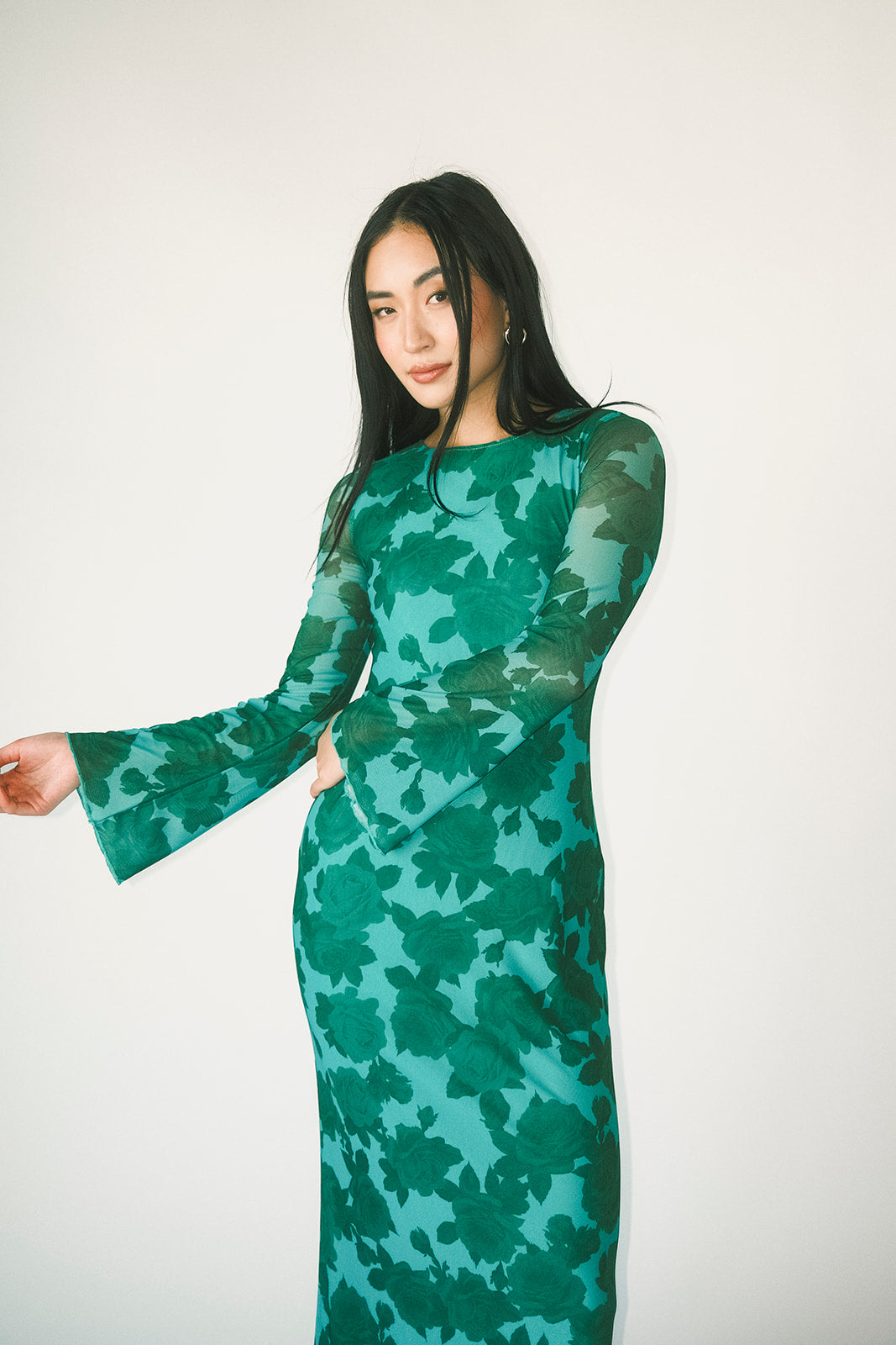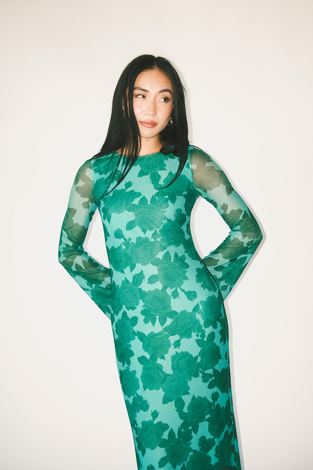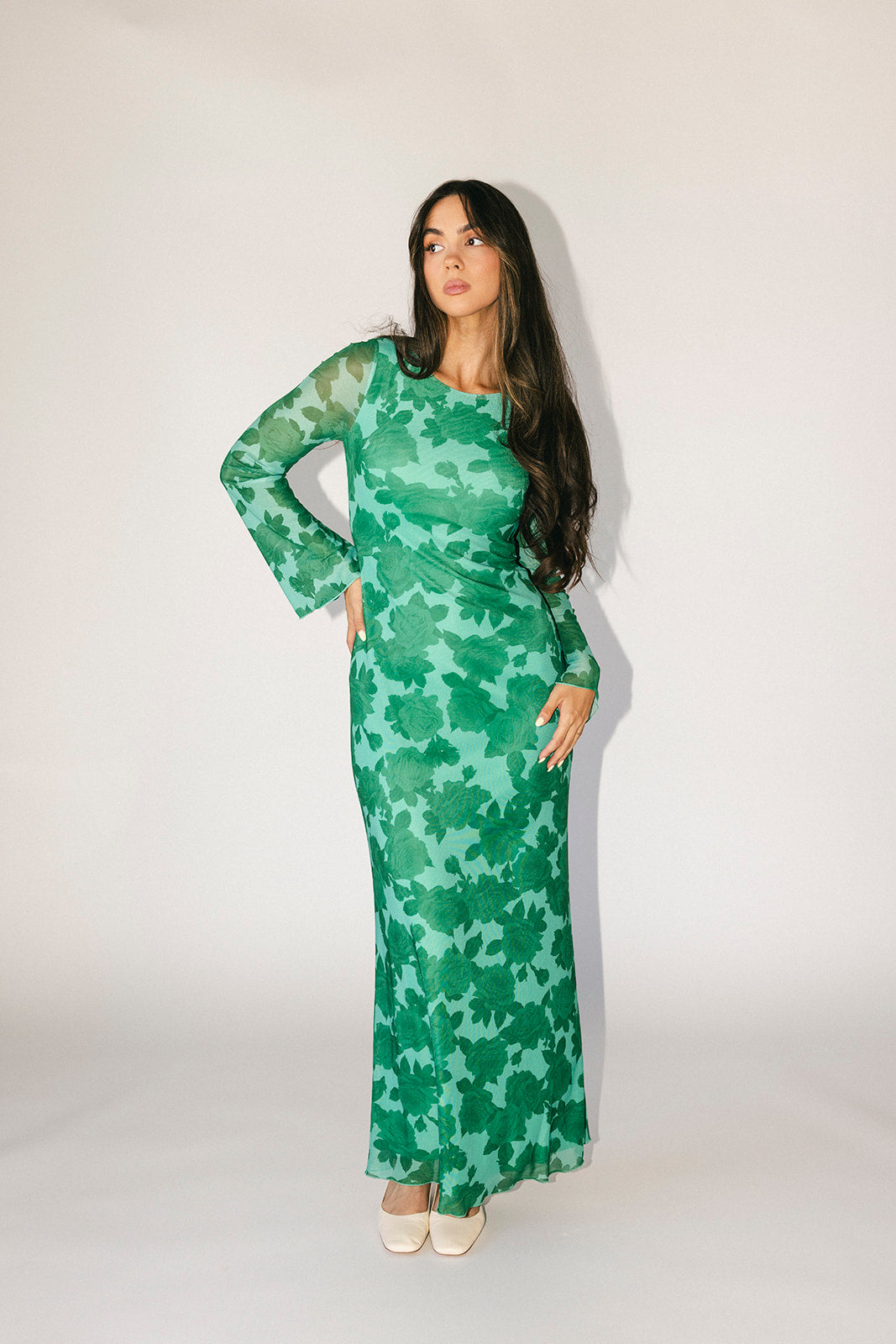 Visa dig djärvaste med vår exklusiva meshklänning "Be Right There" från Zoco. Med sitt stretchiga meshmaterial och utsvängda långa ärmar är denna gröna blommiga maxiklänning, inspirerad av år 2000, perfekt för middagsdejter, cocktailpartyn och tjejkvällar.