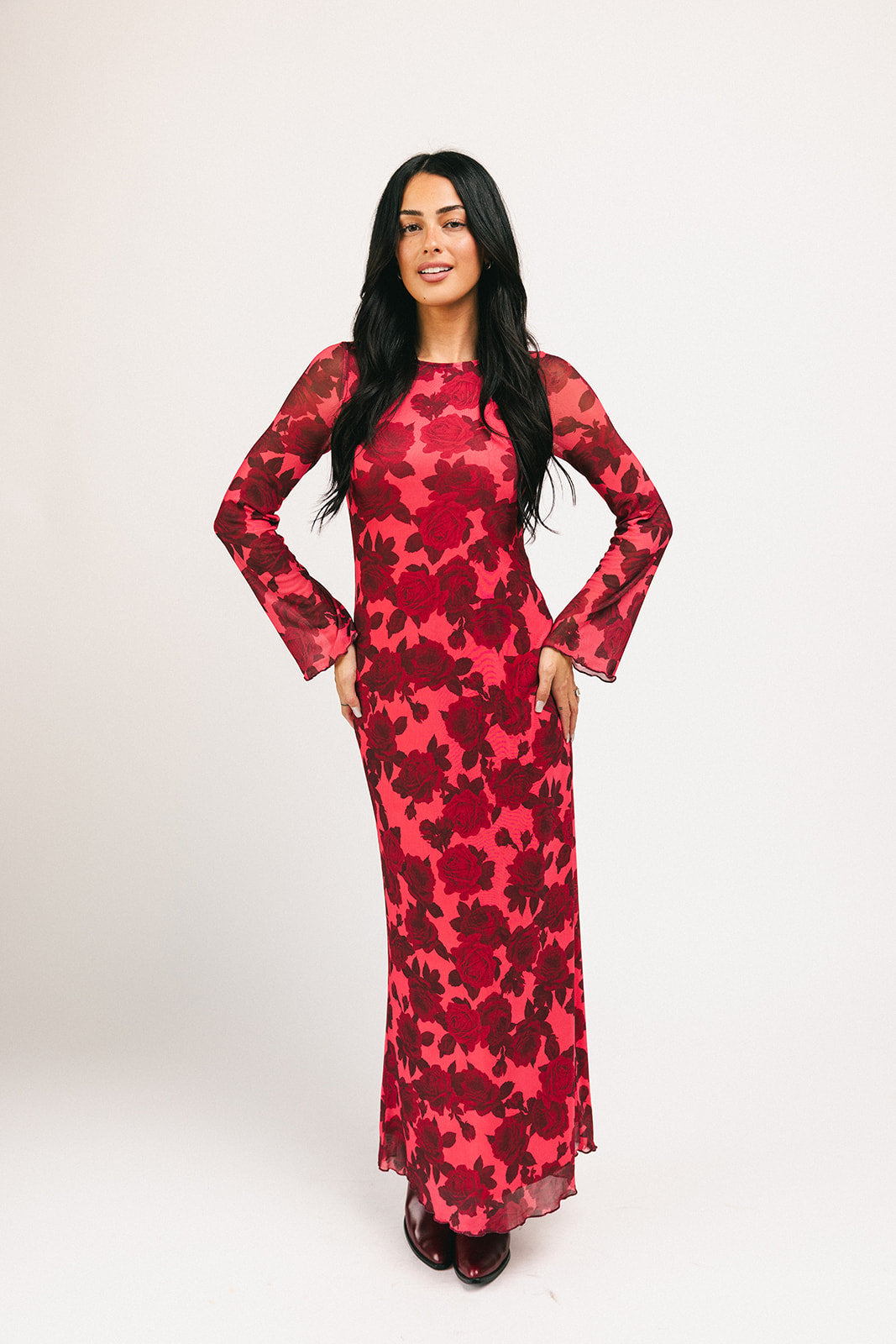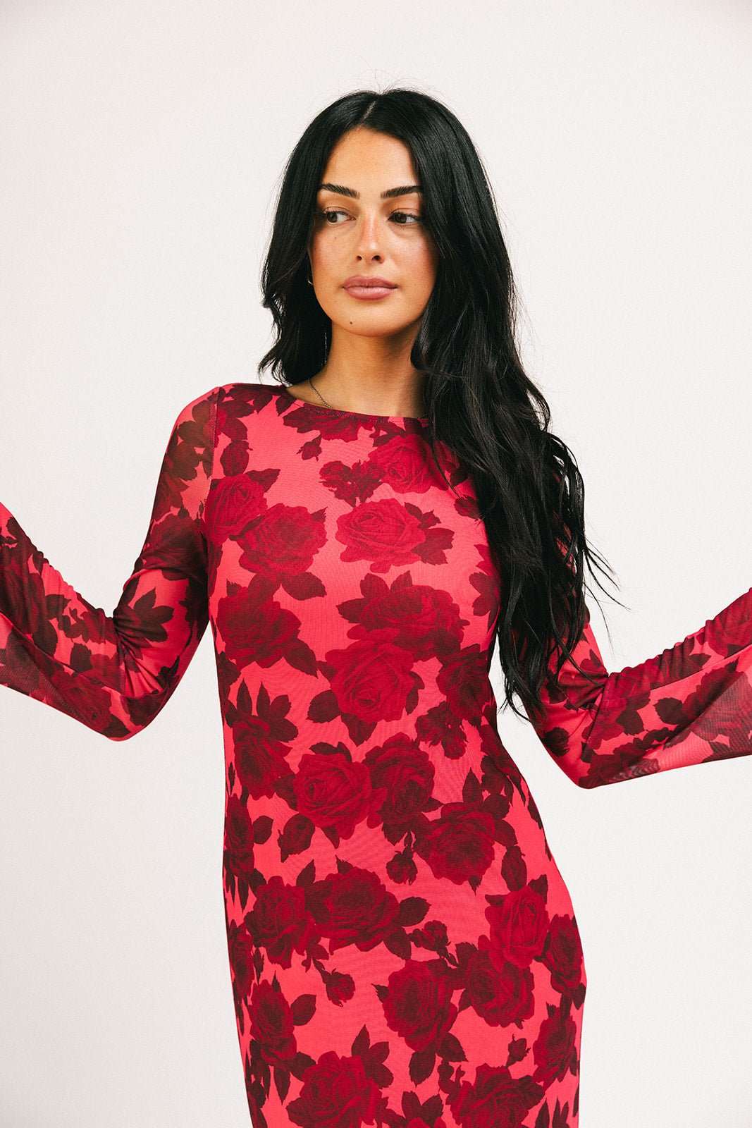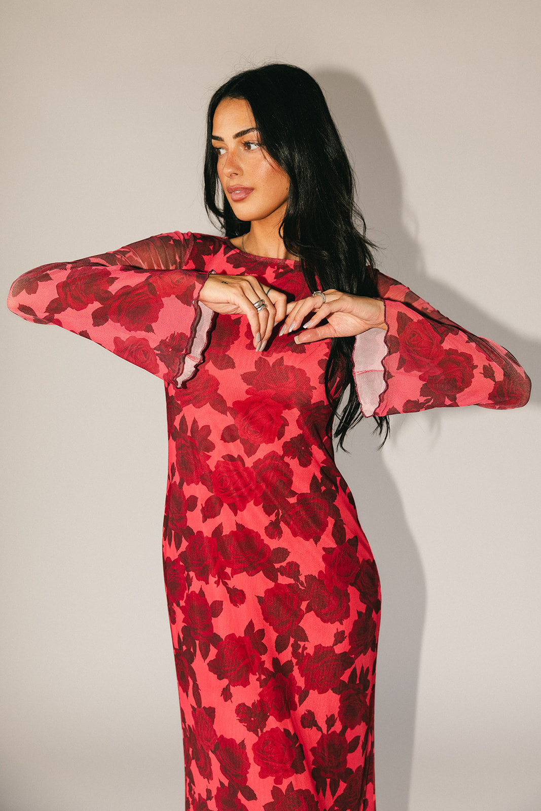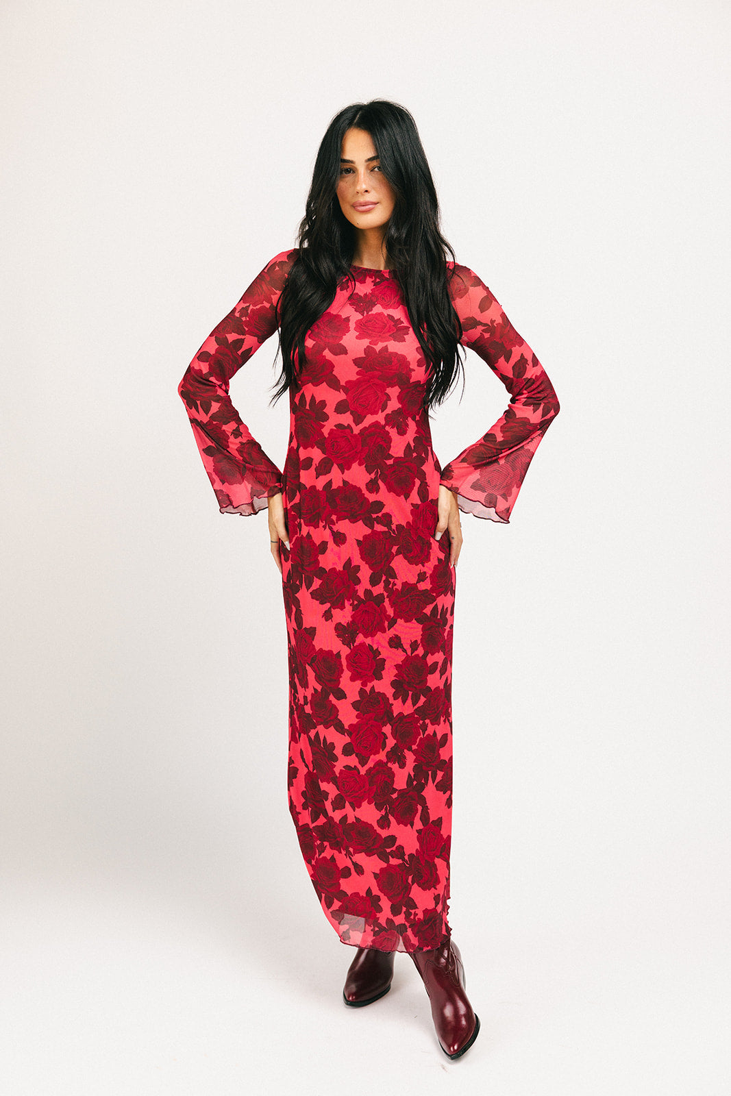 Visa dig djärvaste i denna livfulla maxiklänning med röda roser. Med sitt stretchiga meshmaterial och utsvängda långa ärmar är denna y2k-inspirerade klänning perfekt för middagsdejter, cocktailpartyn och tjejkvällar.