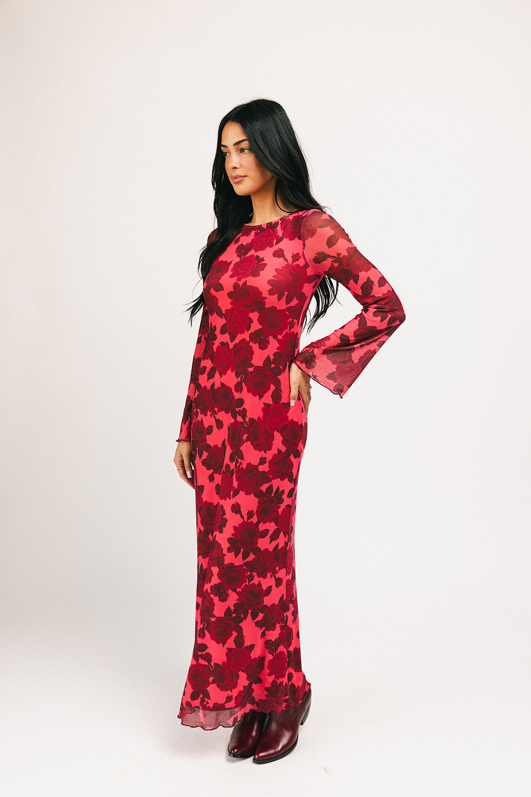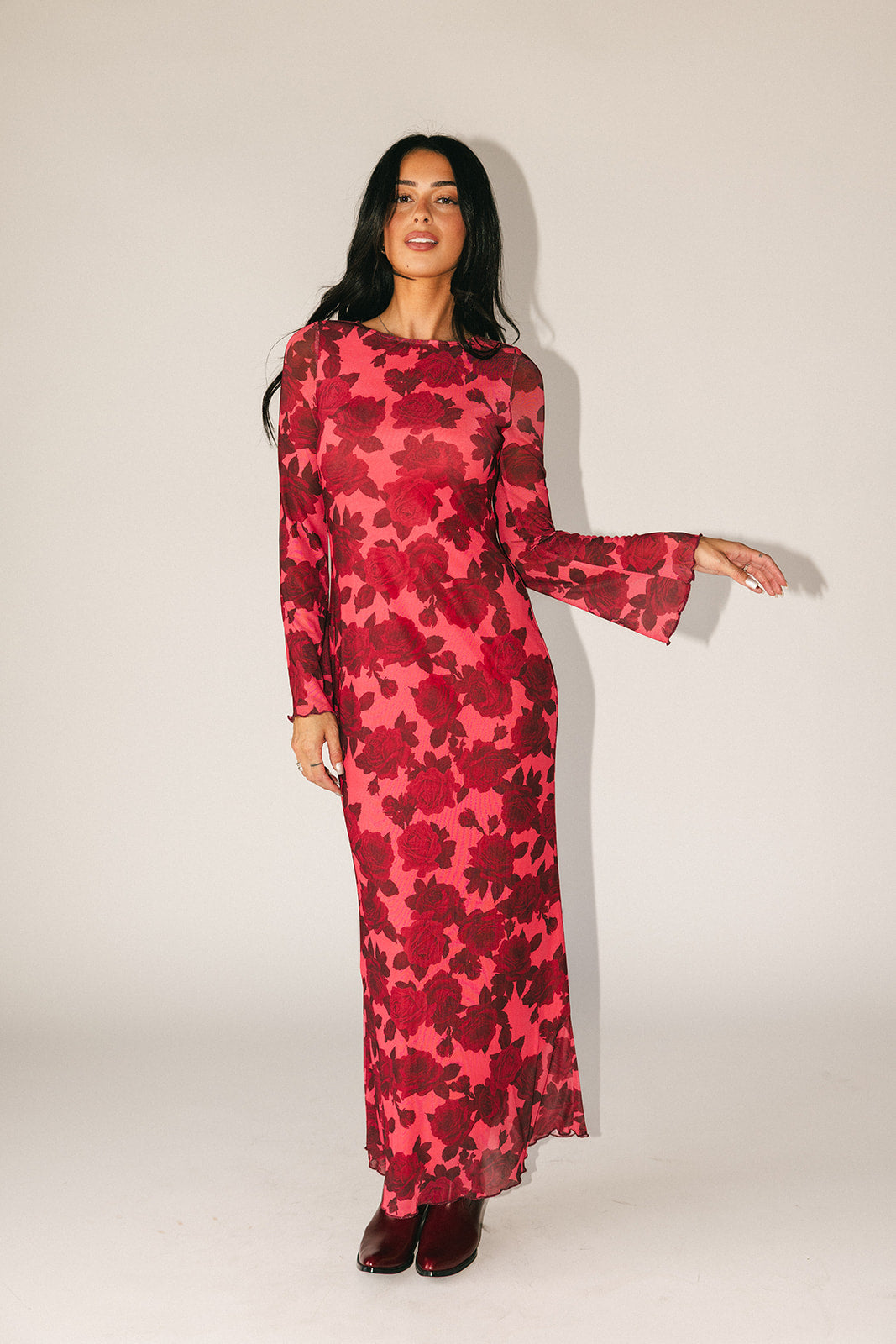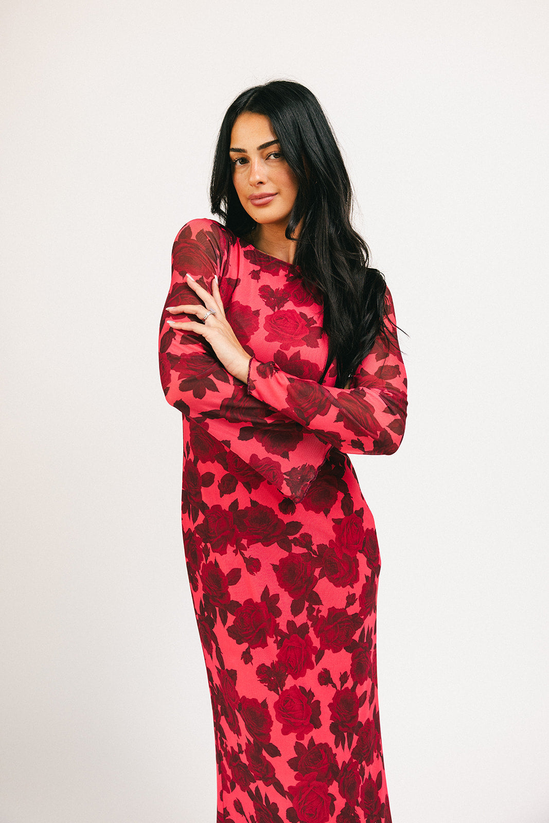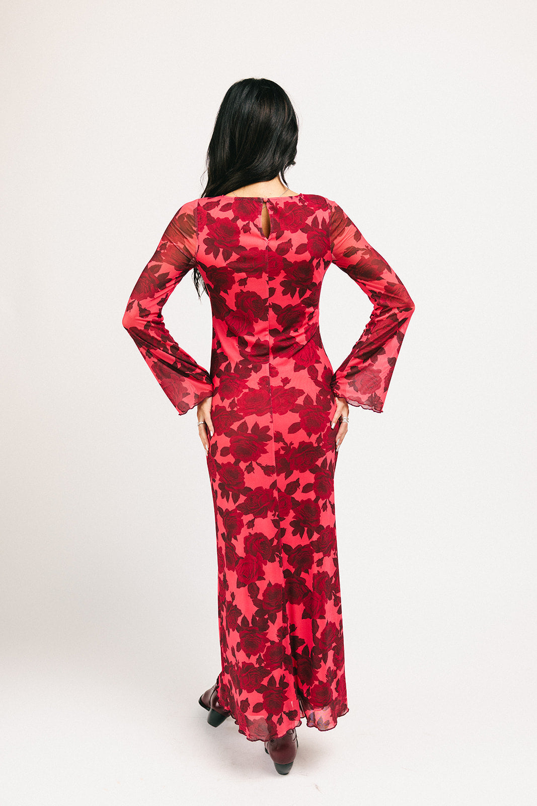 Visa dig djärvaste i denna livfulla maxiklänning med röda roser. Med sitt stretchiga meshmaterial och utsvängda långa ärmar är denna y2k-inspirerade klänning perfekt för middagsdejter, cocktailpartyn och tjejkvällar.