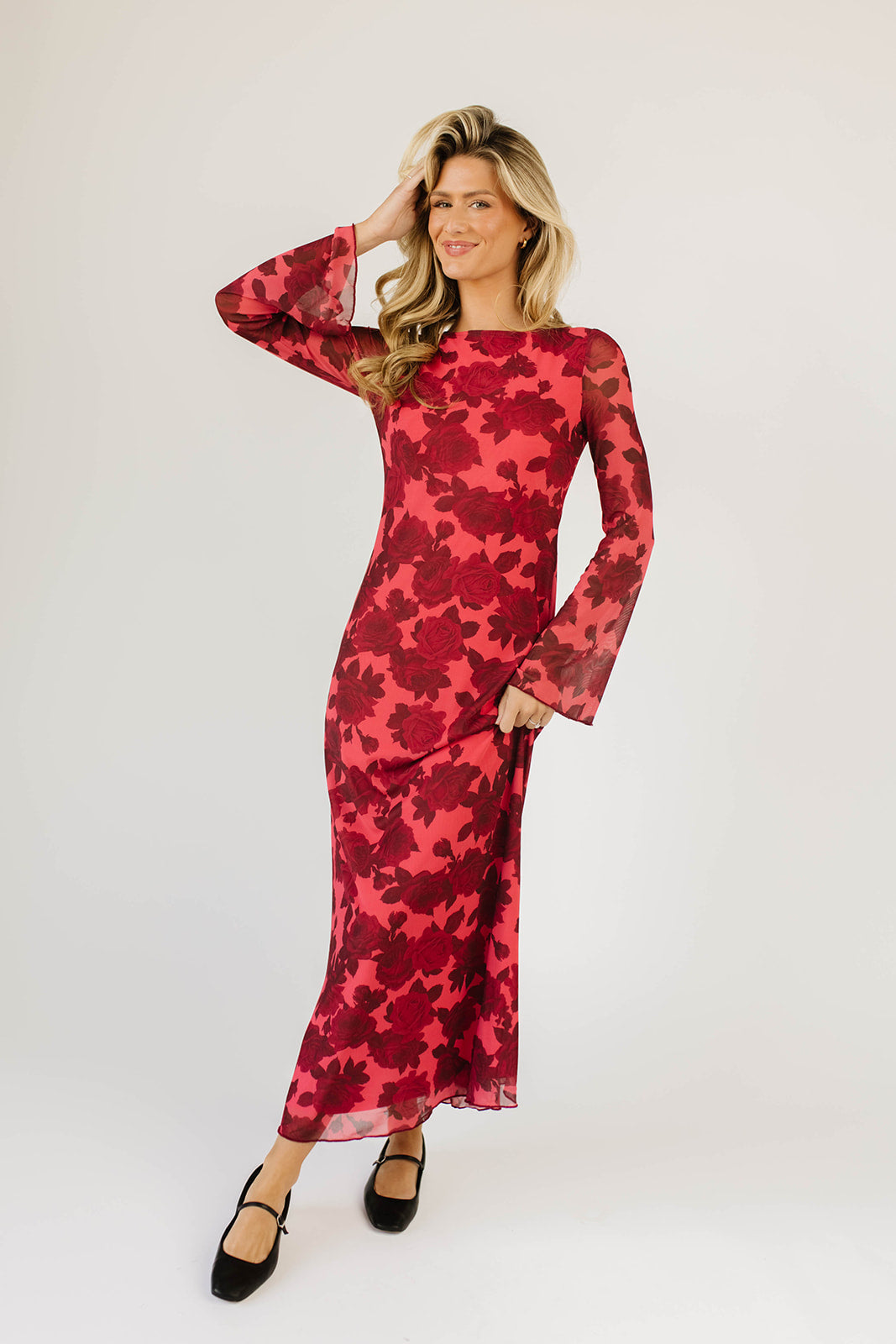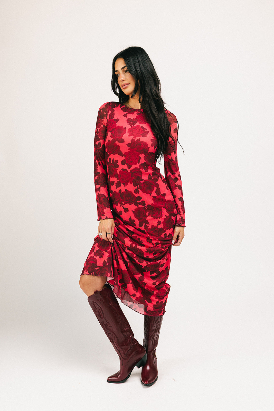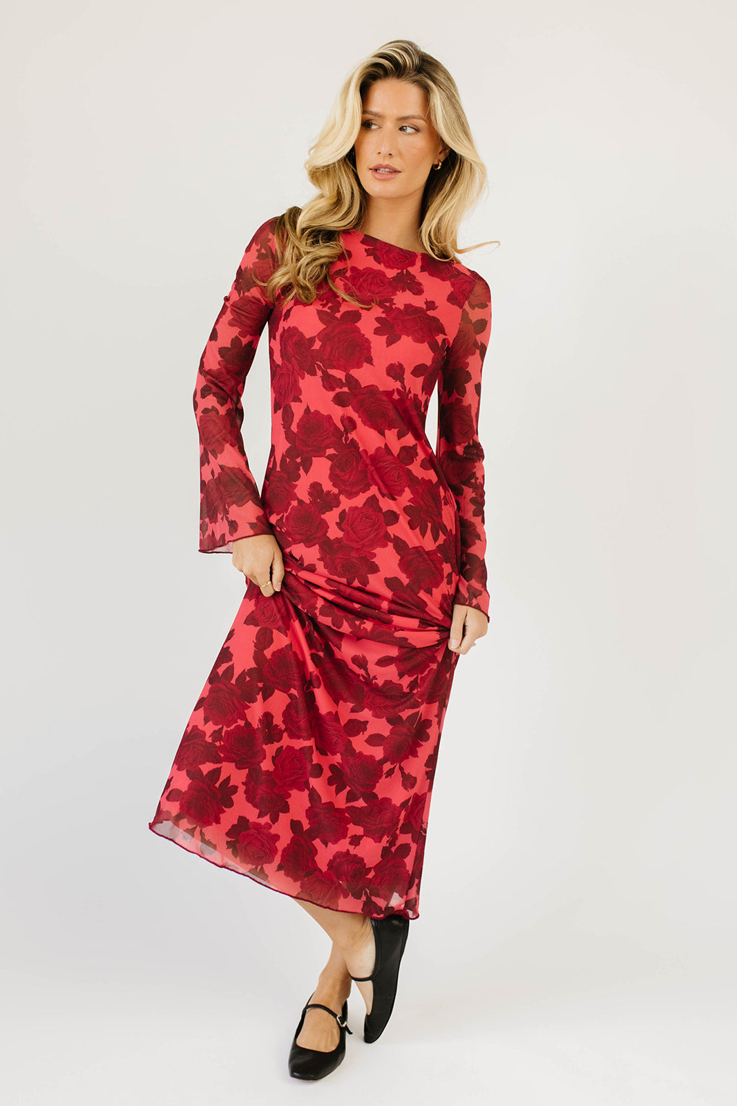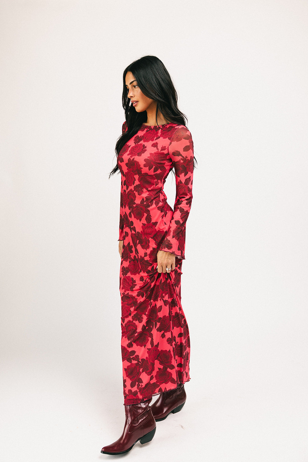 Visa dig djärvaste i denna livfulla maxiklänning med röda roser. Med sitt stretchiga meshmaterial och utsvängda långa ärmar är denna y2k-inspirerade klänning perfekt för middagsdejter, cocktailpartyn och tjejkvällar.