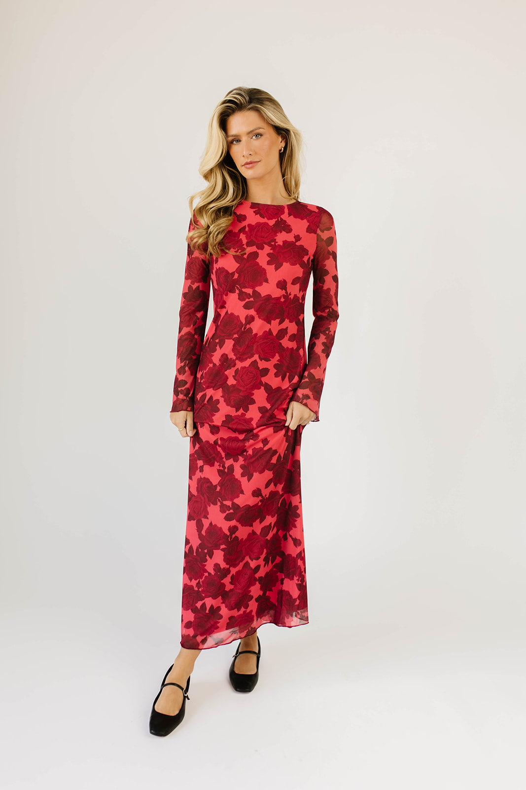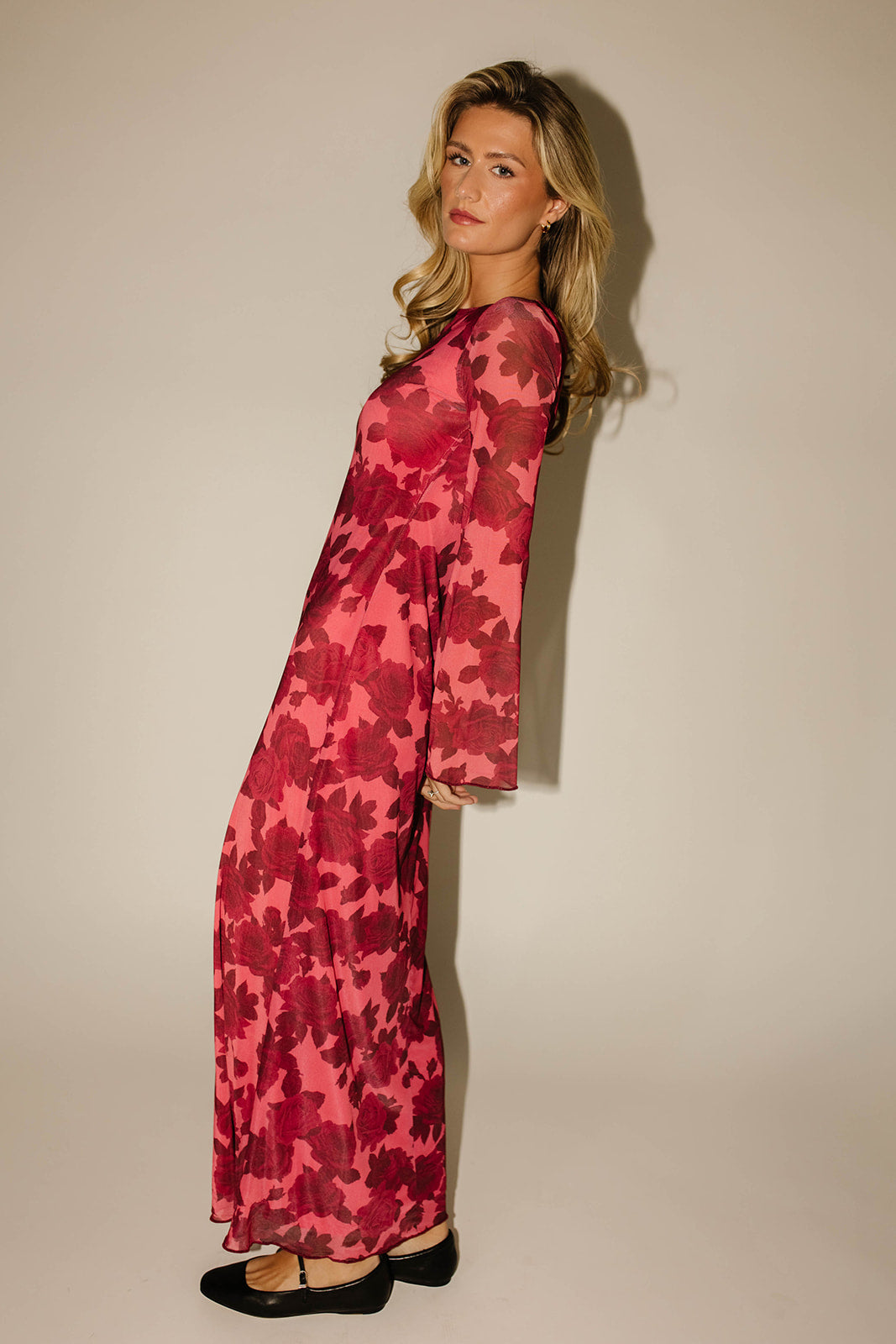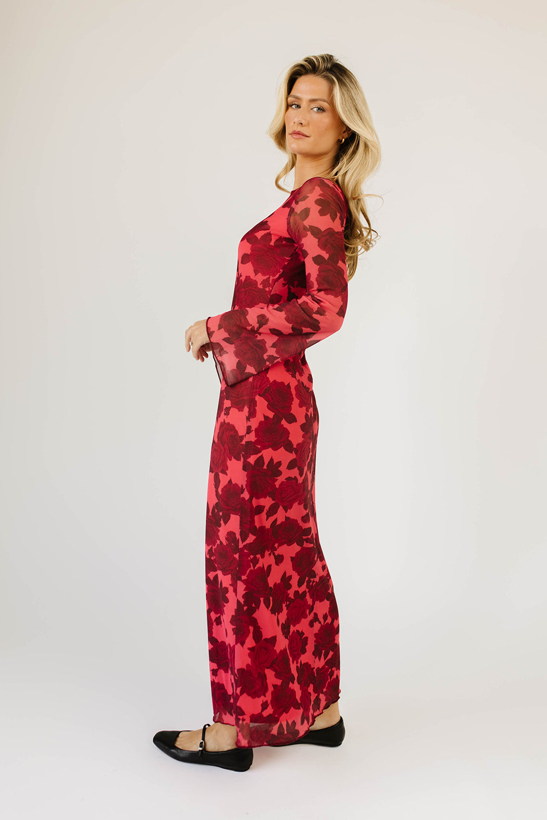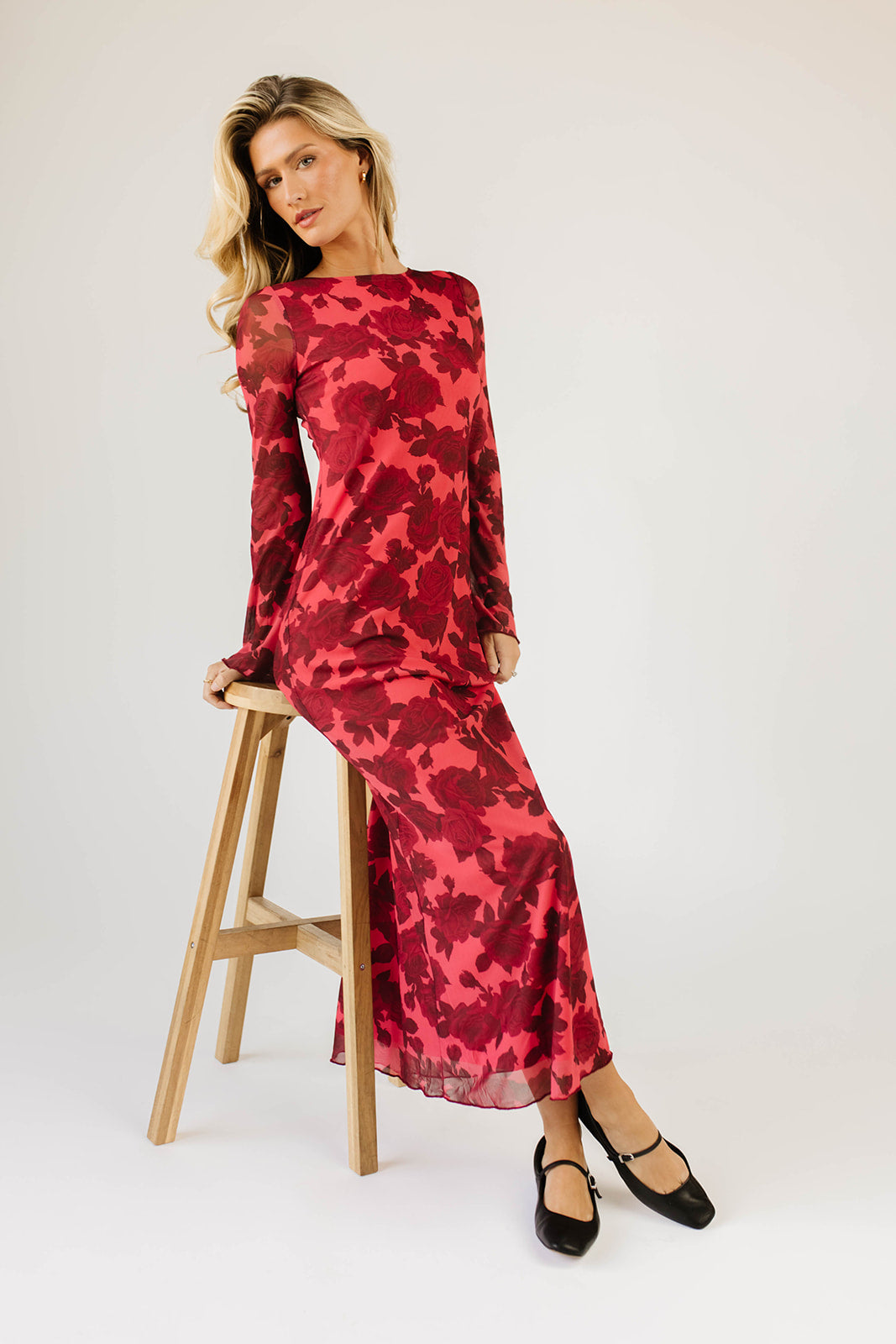 Visa dig djärvaste i denna livfulla maxiklänning med röda roser. Med sitt stretchiga meshmaterial och utsvängda långa ärmar är denna y2k-inspirerade klänning perfekt för middagsdejter, cocktailpartyn och tjejkvällar.