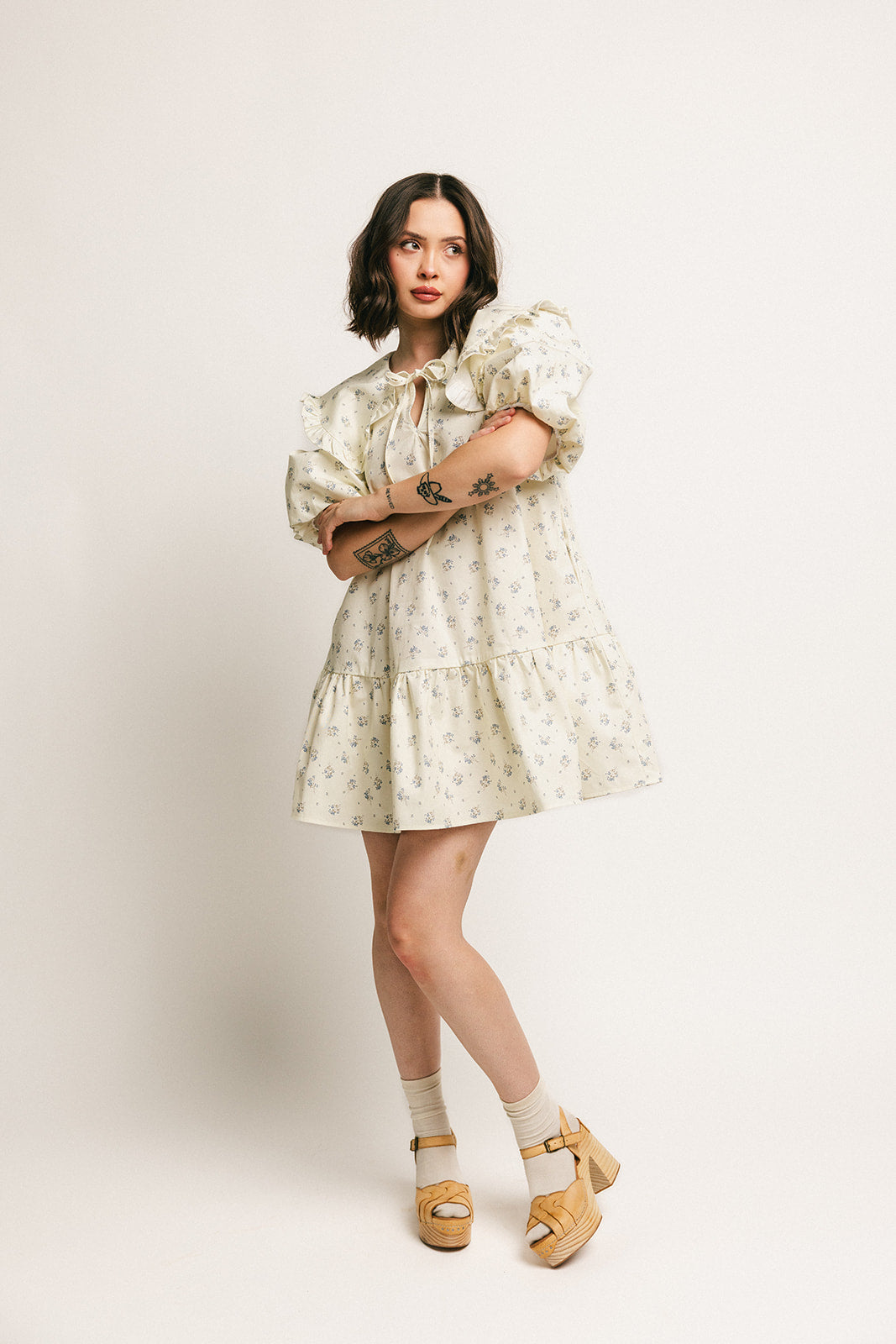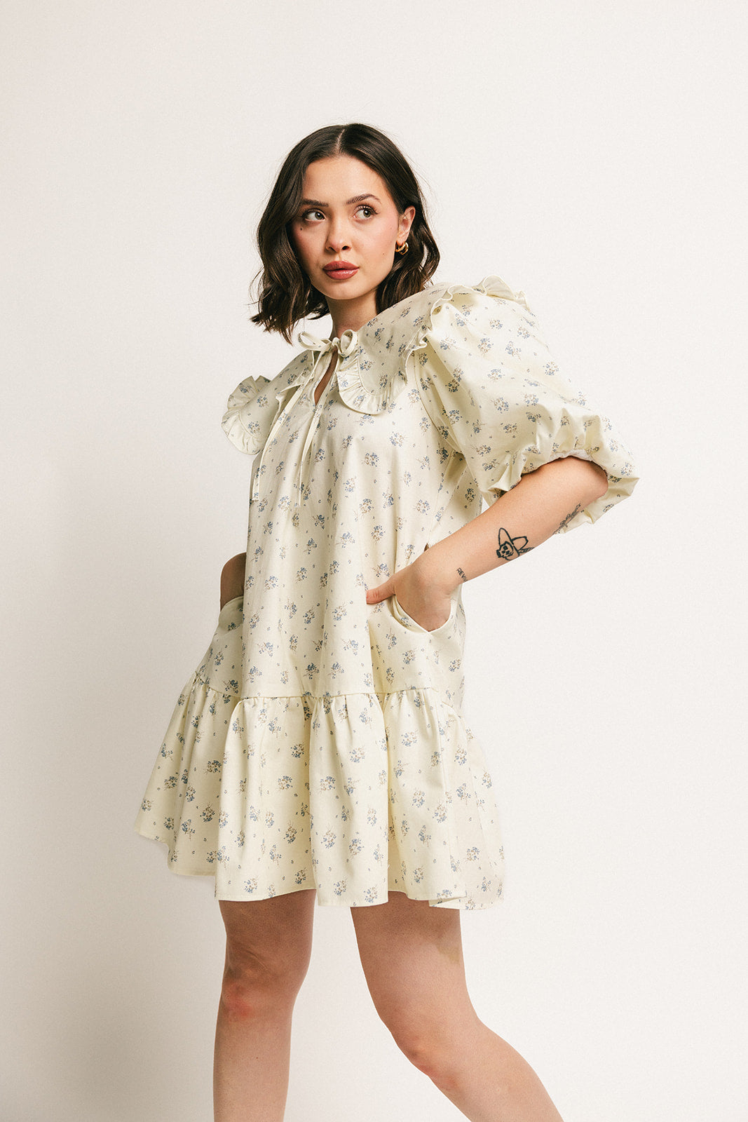 • blå blommig // minilängd, hög halsringning, Peter Pan-krage, knytband framtill, fickor, puffärmar, elastiska manschetter