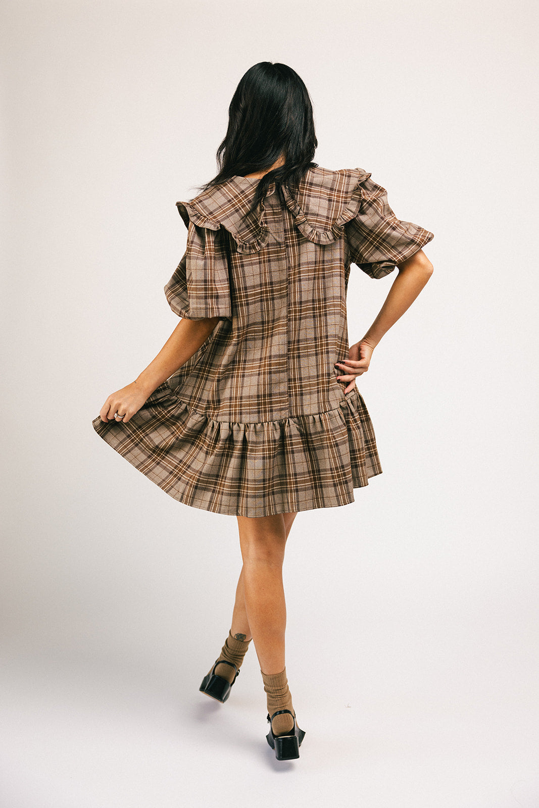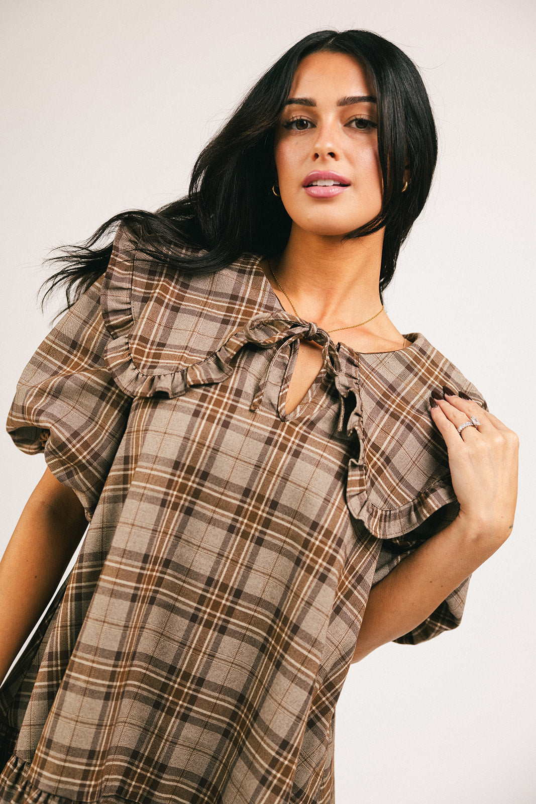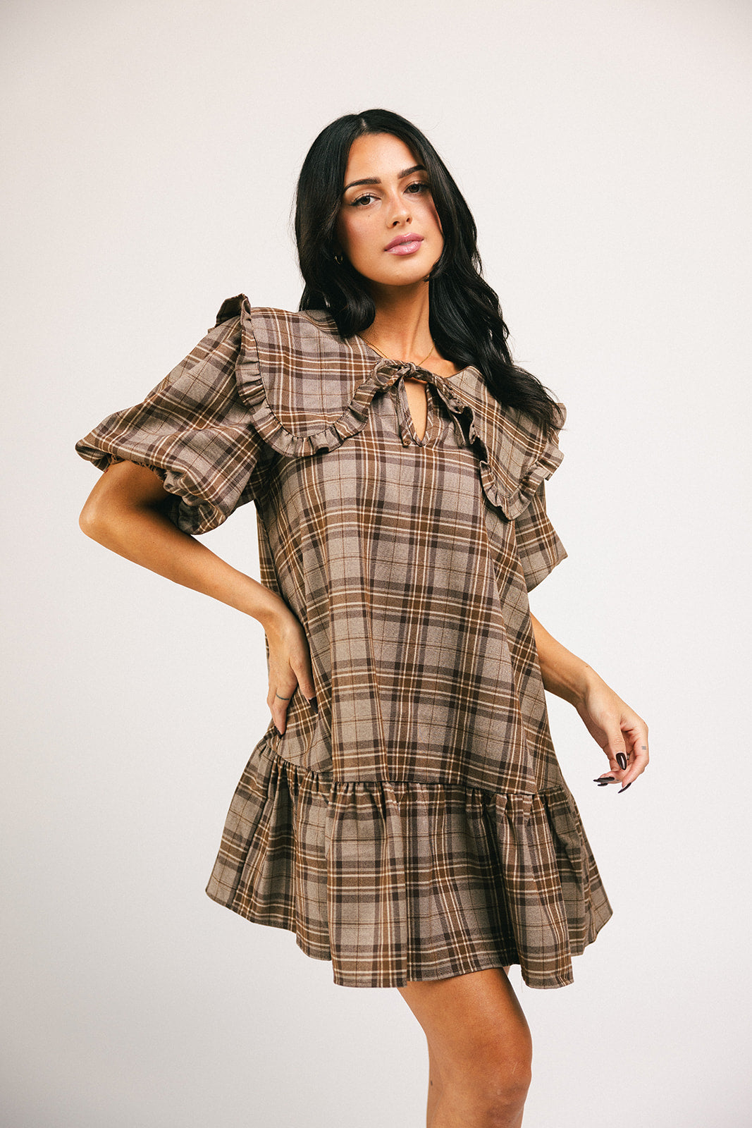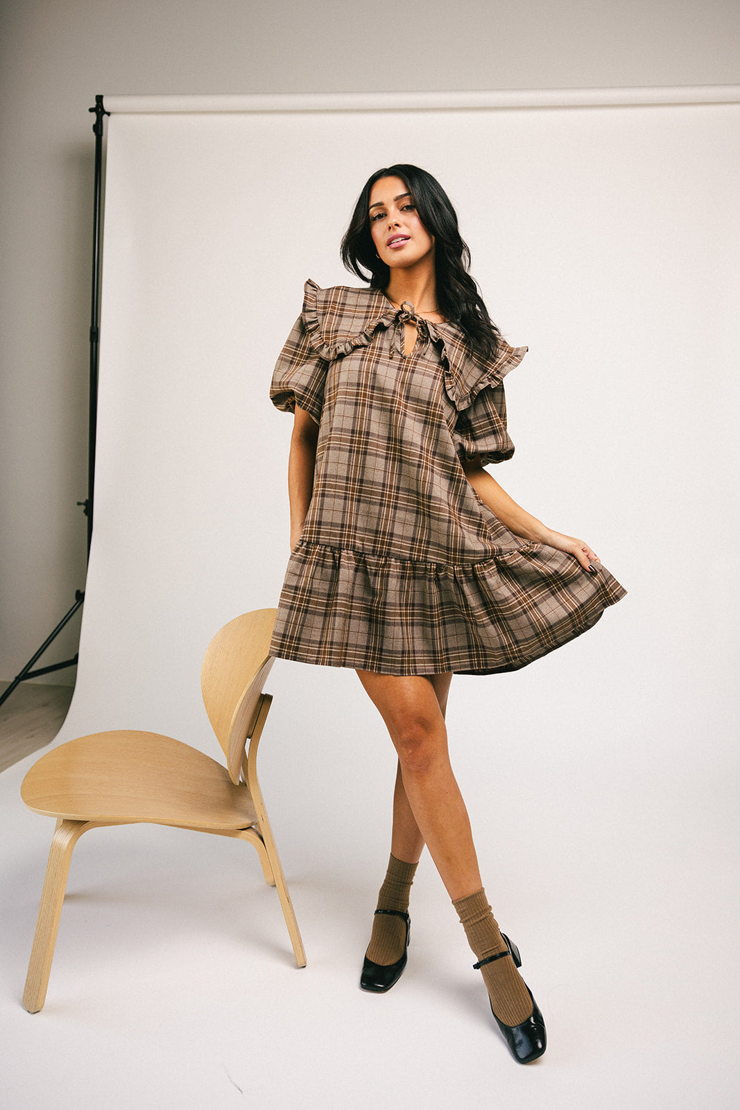 Det är säsong för söta rutiga miniklänningar. Med fina puffärmar och en elegant Peter Pan-krage är denna vintageinspirerade miniklänning perfekt för vinterdejter, familjebilder och julmiddagar. Vi älskar den uppklädd med knähöga stövlar eller nere med ballerinaskor.