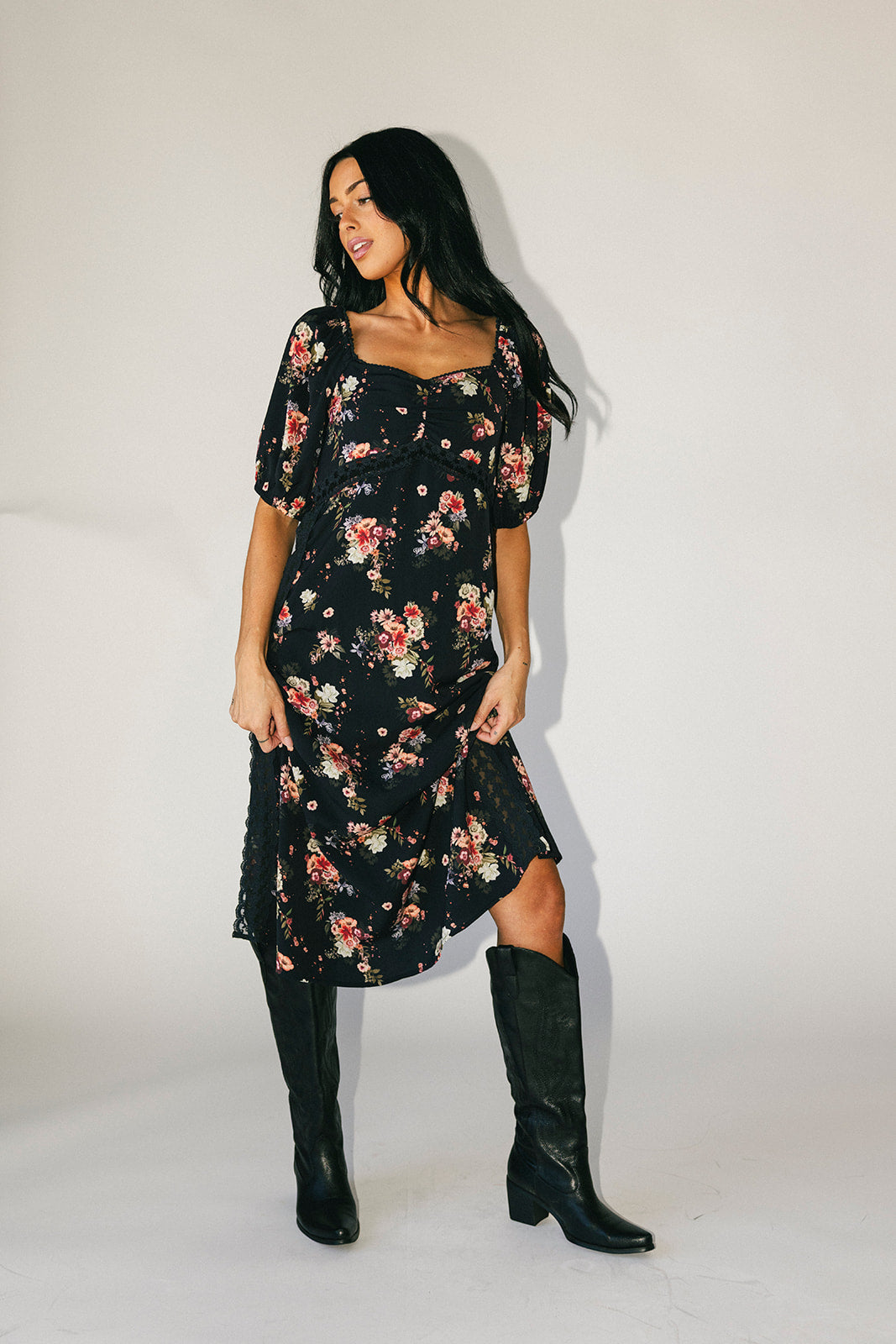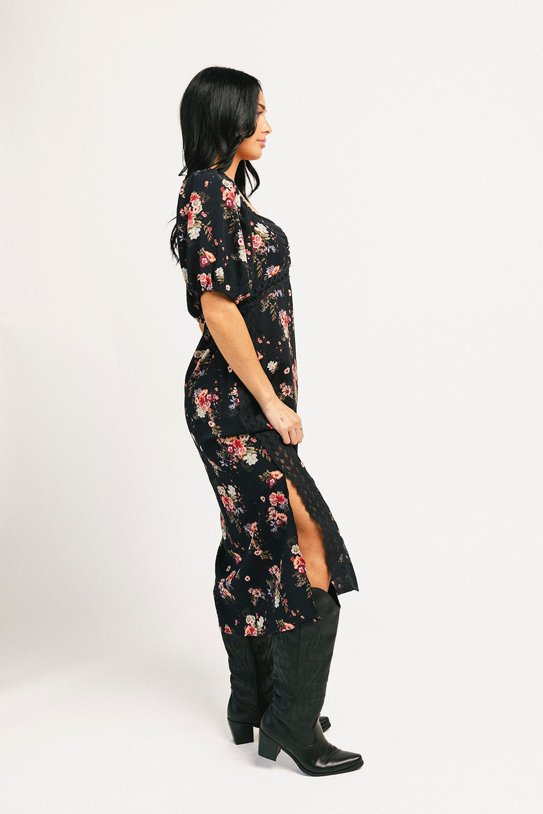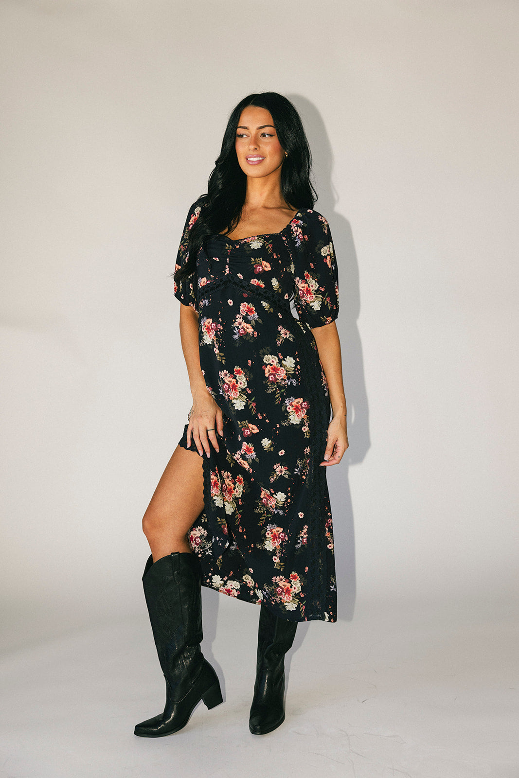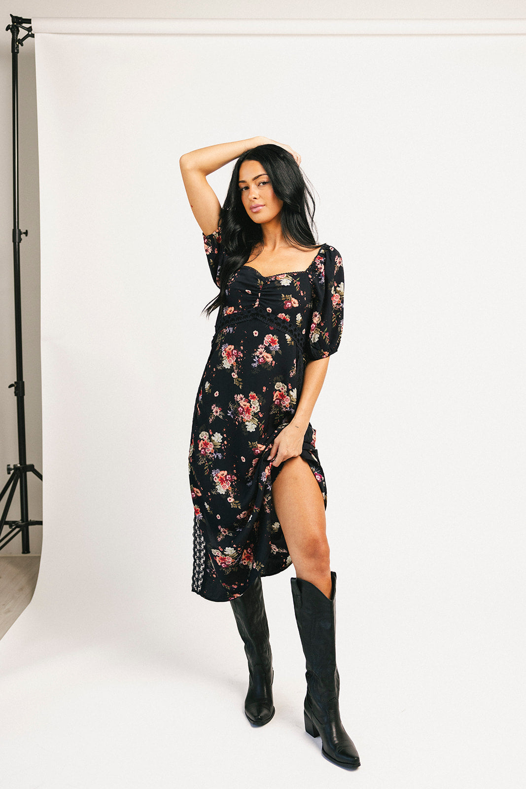 Supersöt + lite flörtig, den här svarta blommiga midiklänningen tar dig från höstens dejter till vinterbröllop. Med sina fina spetsdetaljer + tuffa sidoslitsar är det den perfekta klänningen att para ihop med knähöga stövlar, klackskor med remmar + allt däremellan.