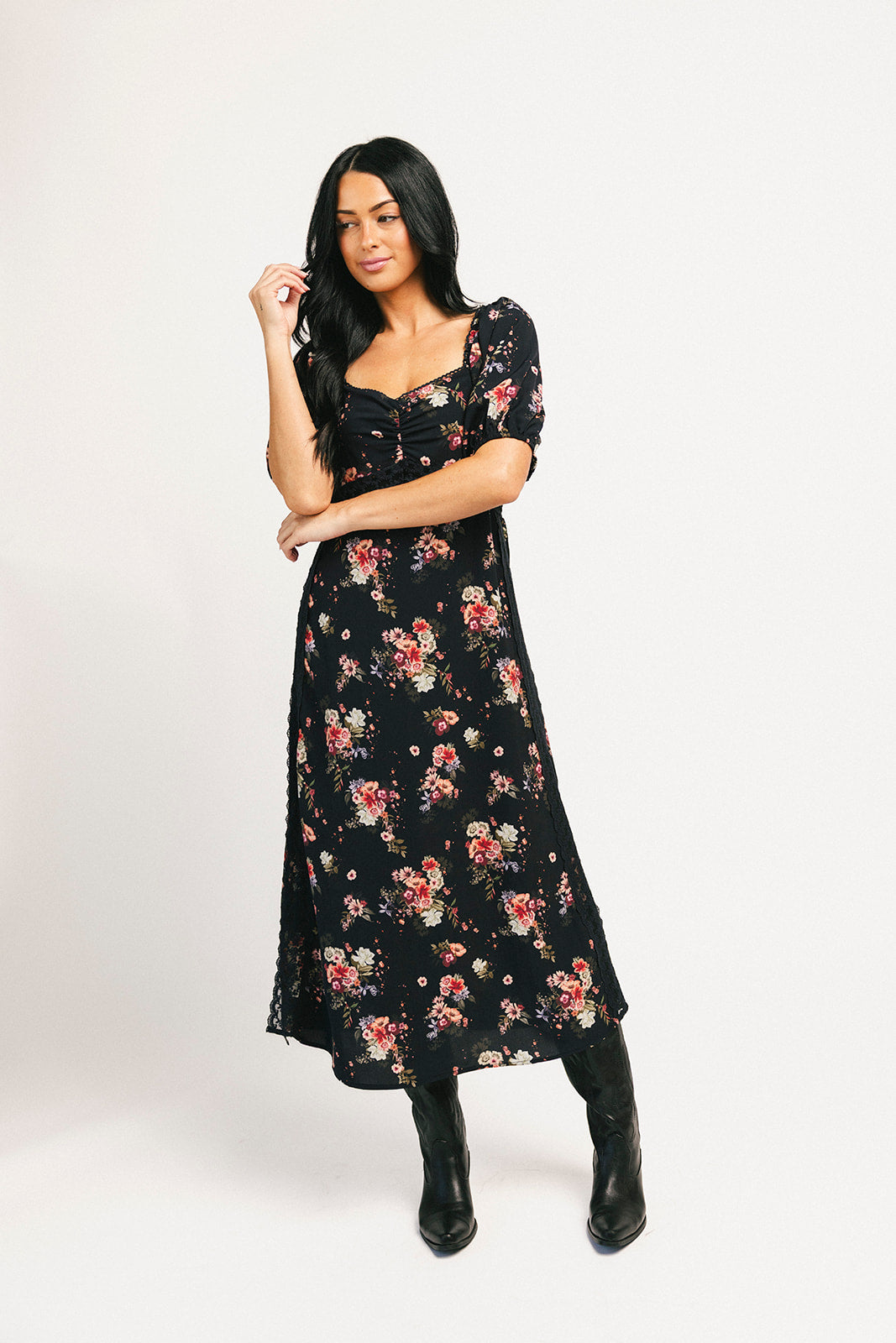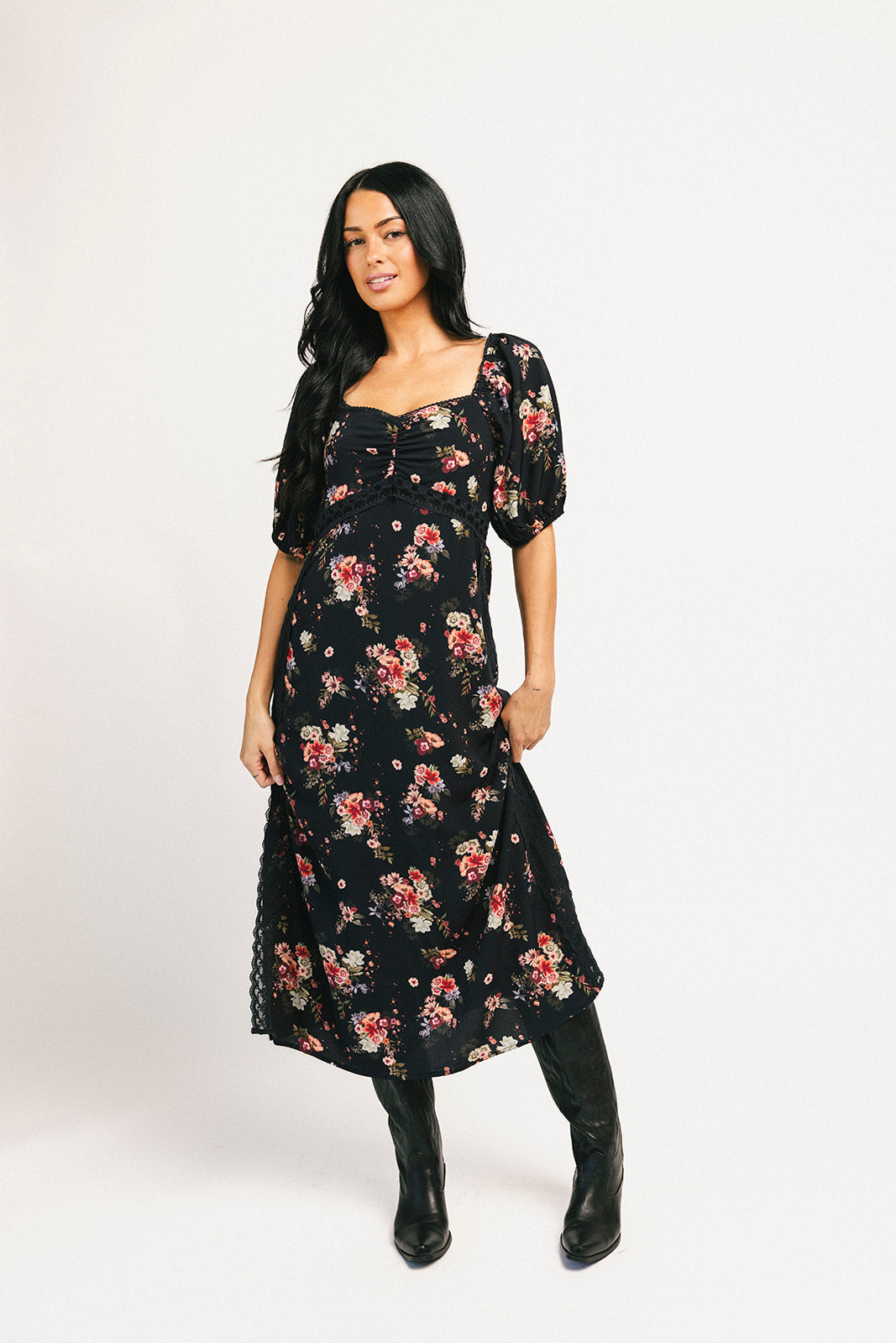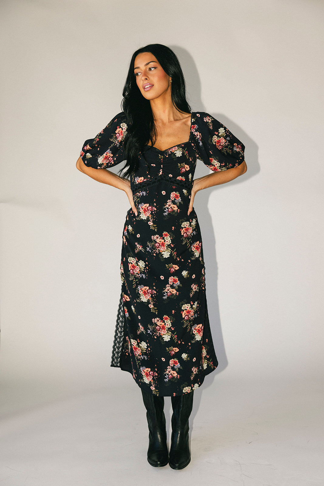 Supersöt + lite flörtig, den här svarta blommiga midiklänningen tar dig från höstens dejter till vinterbröllop. Med sina fina spetsdetaljer + tuffa sidoslitsar är det den perfekta klänningen att para ihop med knähöga stövlar, klackskor med remmar + allt däremellan.