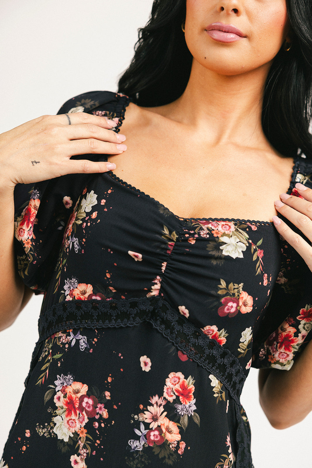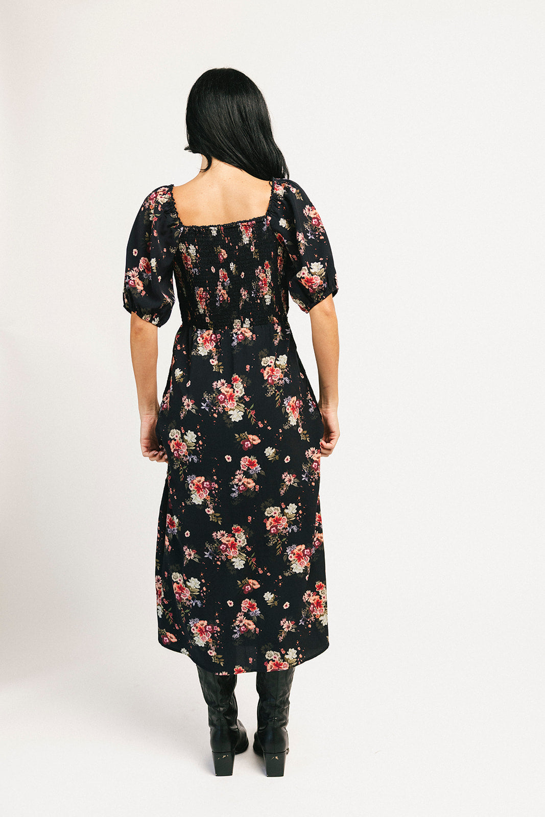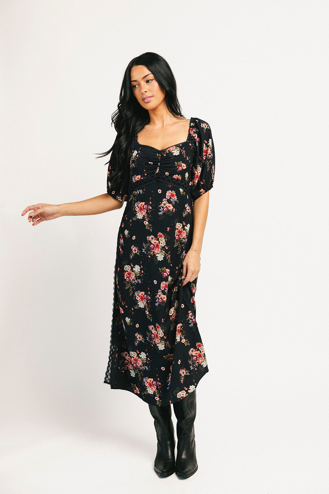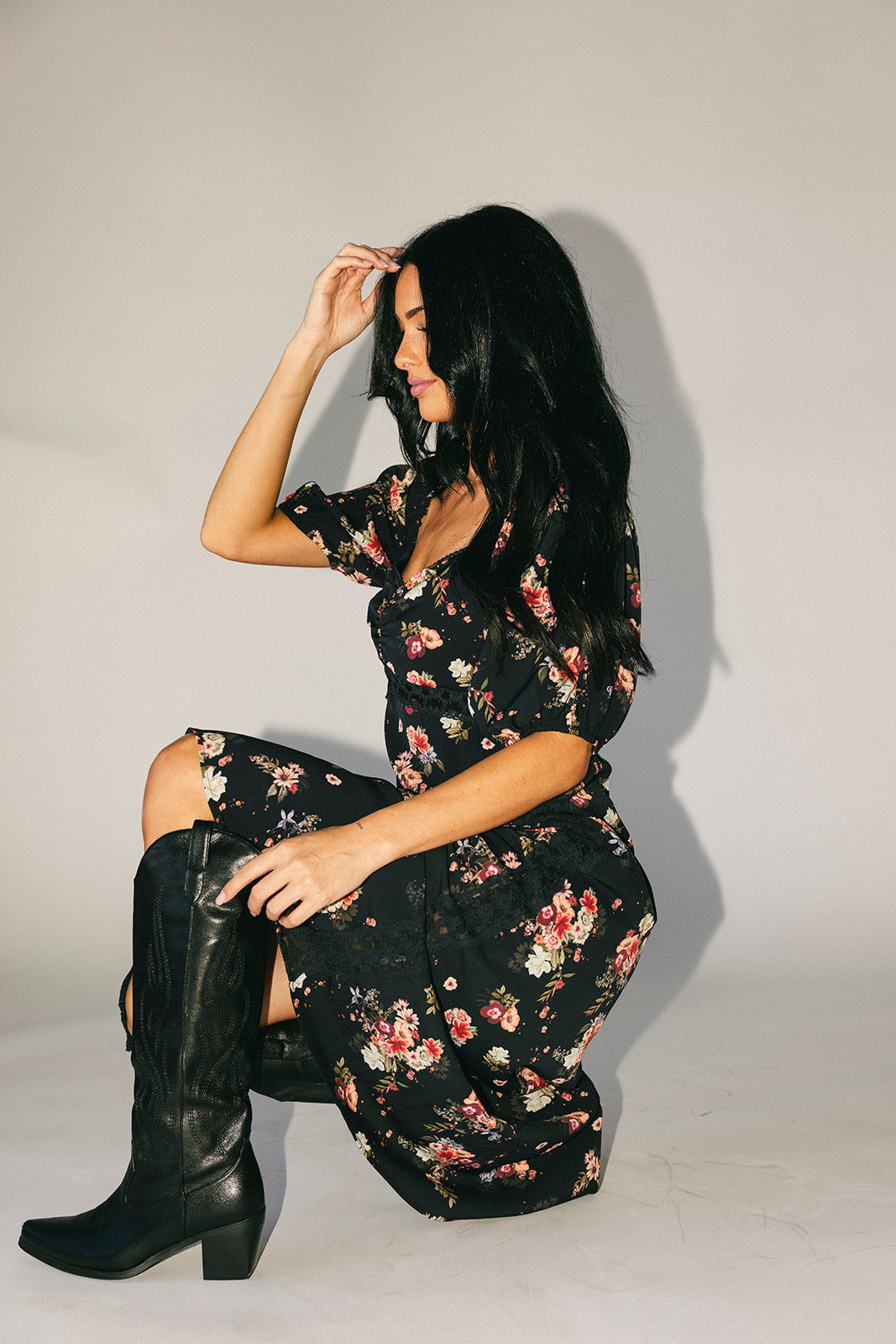 Supersöt + lite flörtig, den här svarta blommiga midiklänningen tar dig från höstens dejter till vinterbröllop. Med sina fina spetsdetaljer + tuffa sidoslitsar är det den perfekta klänningen att para ihop med knähöga stövlar, klackskor med remmar + allt däremellan.