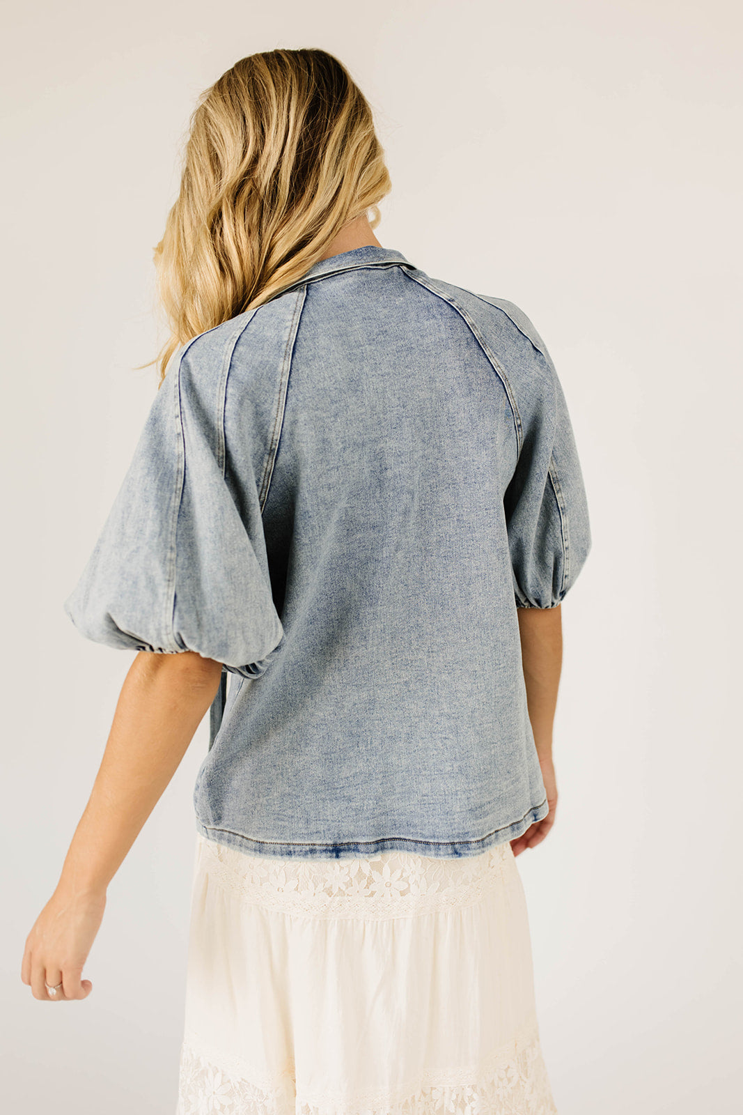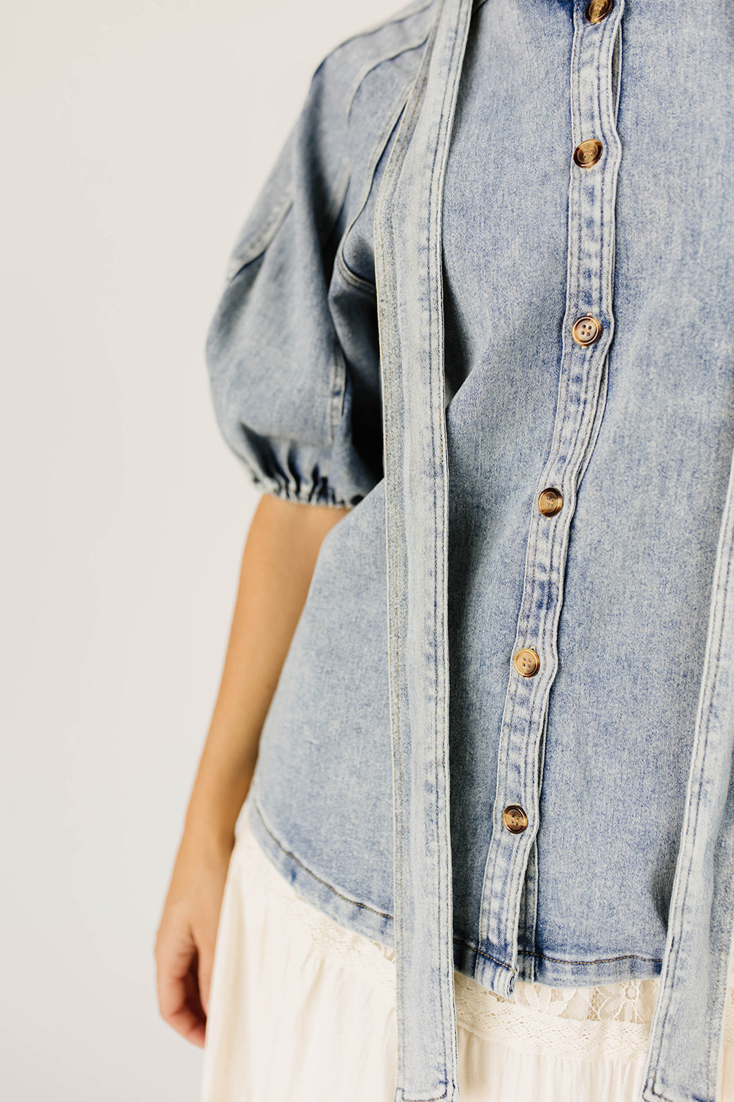 En puffärmad denimtopp som ingen annan, denna vintageinspirerade knäppning har eleganta sömdetaljer + långa krage i halsen. Full av stylingmöjligheter, den tar dig från höstens familjebilder till vårens brunchdejter. Den perfekta knytkragetoppen att klä upp med en maxikjol + klackar, eller ner med böljande shorts + lågskor.