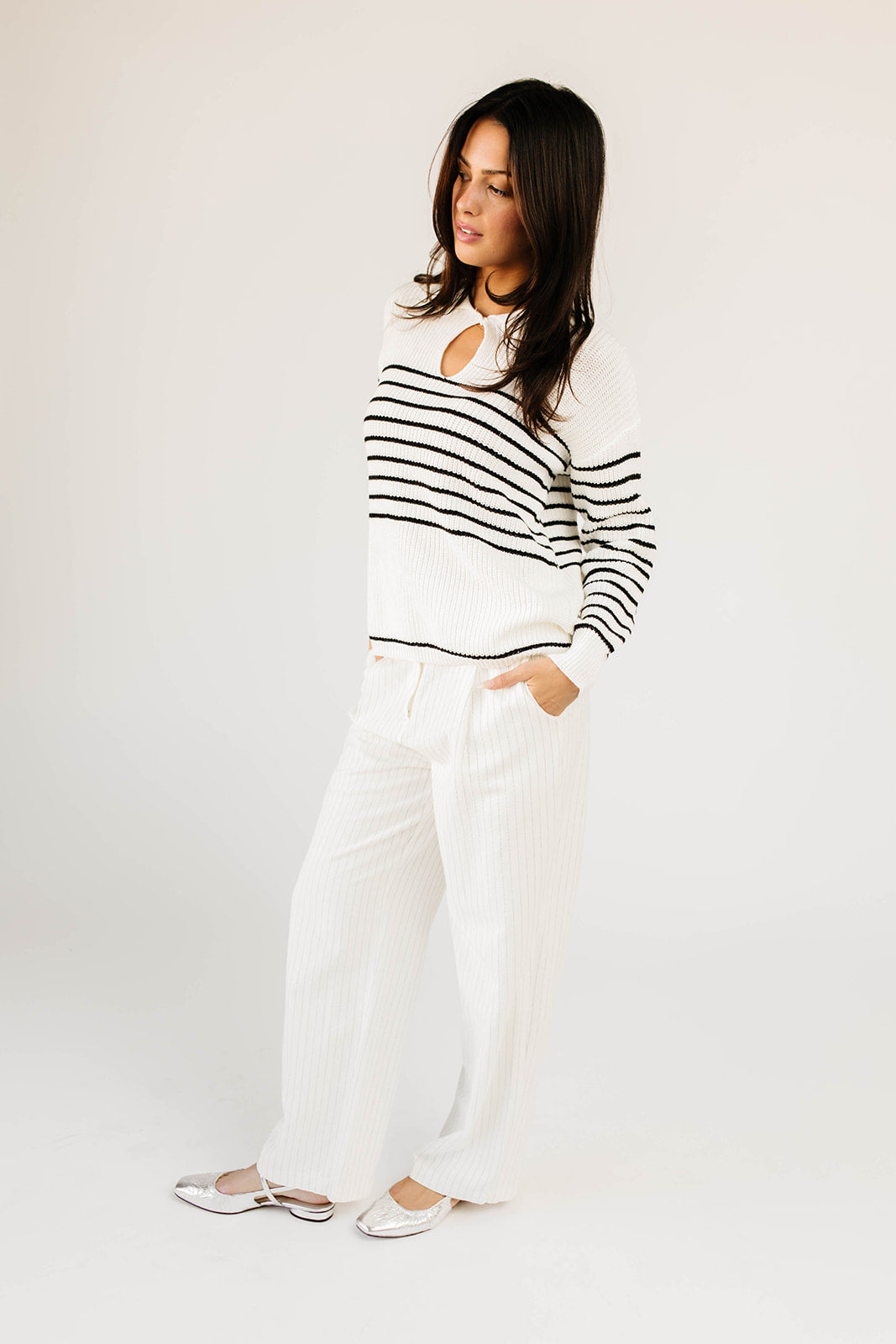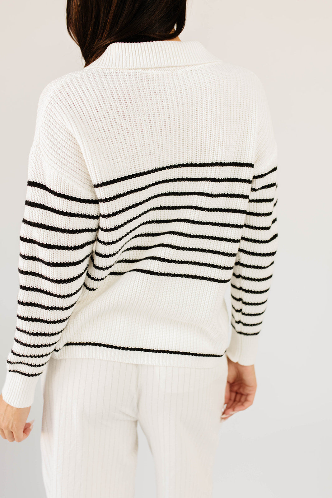 En lyxig randig tröja – men gör den extra elegant. Denna svartvitrandiga tröja har en elegant krage med en fantastisk nyckelhålsöppning. Den perfekta, upphöjda basen som tar dig från avslappnade utflykter till eleganta dejtkvällar.