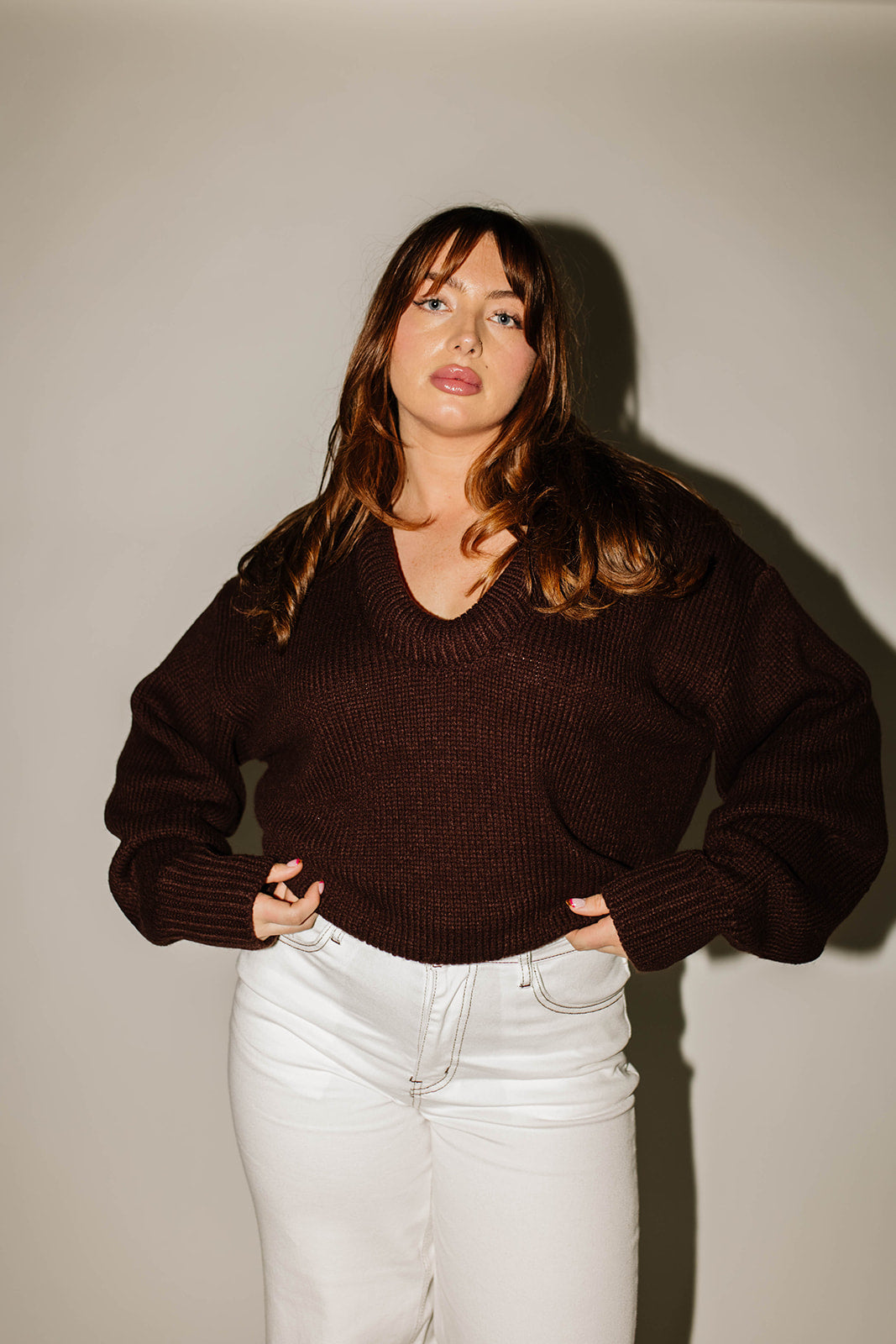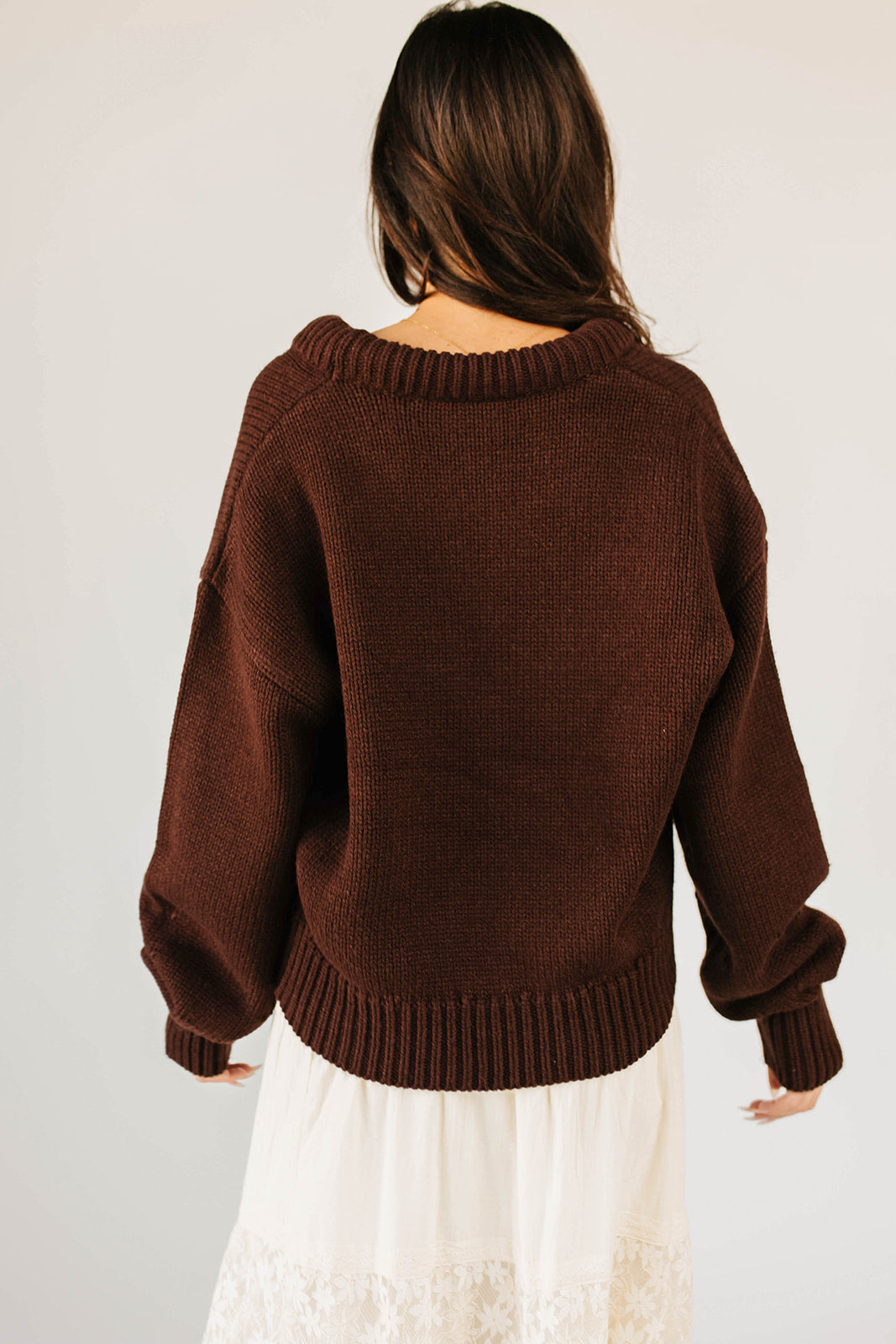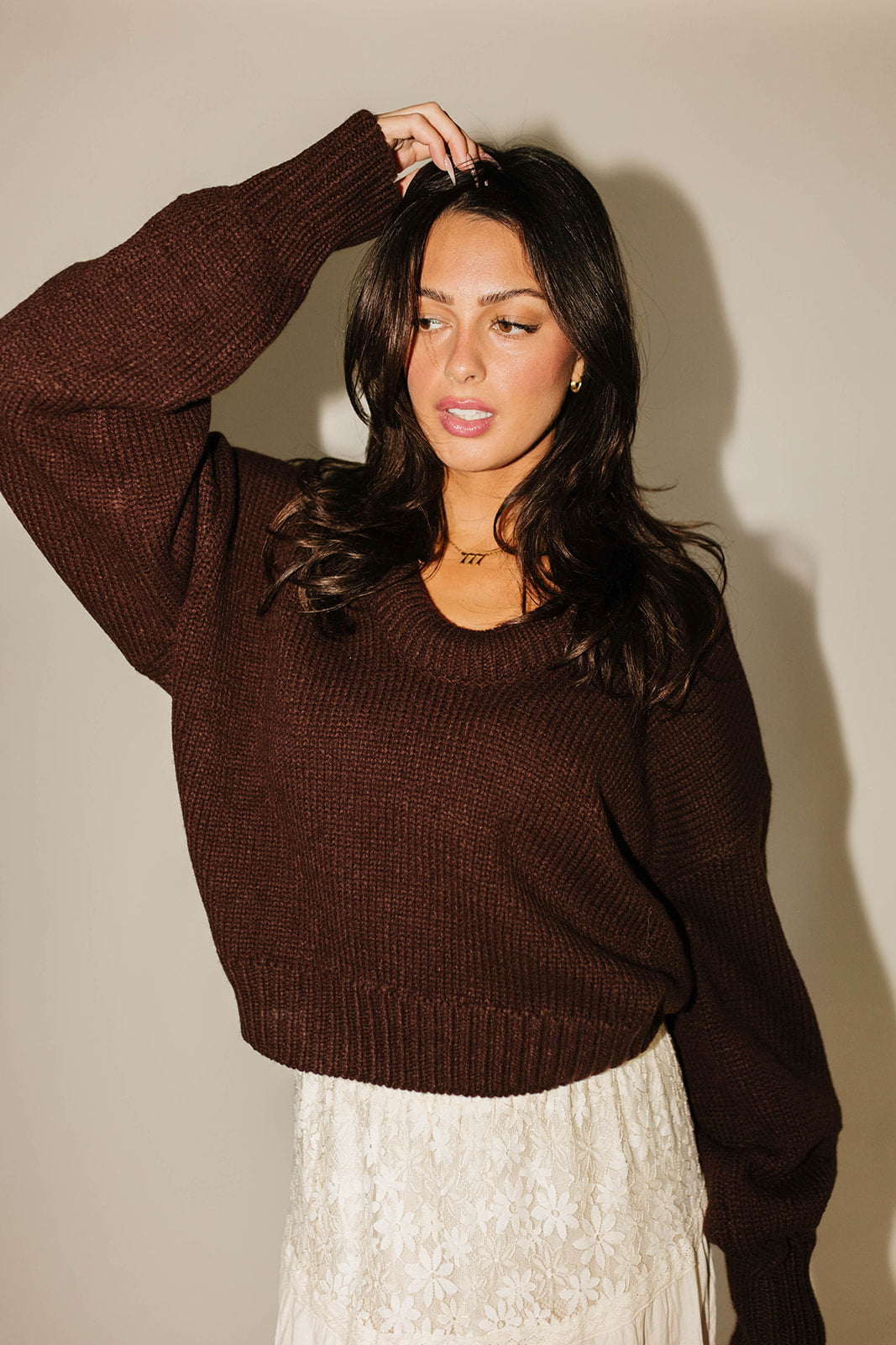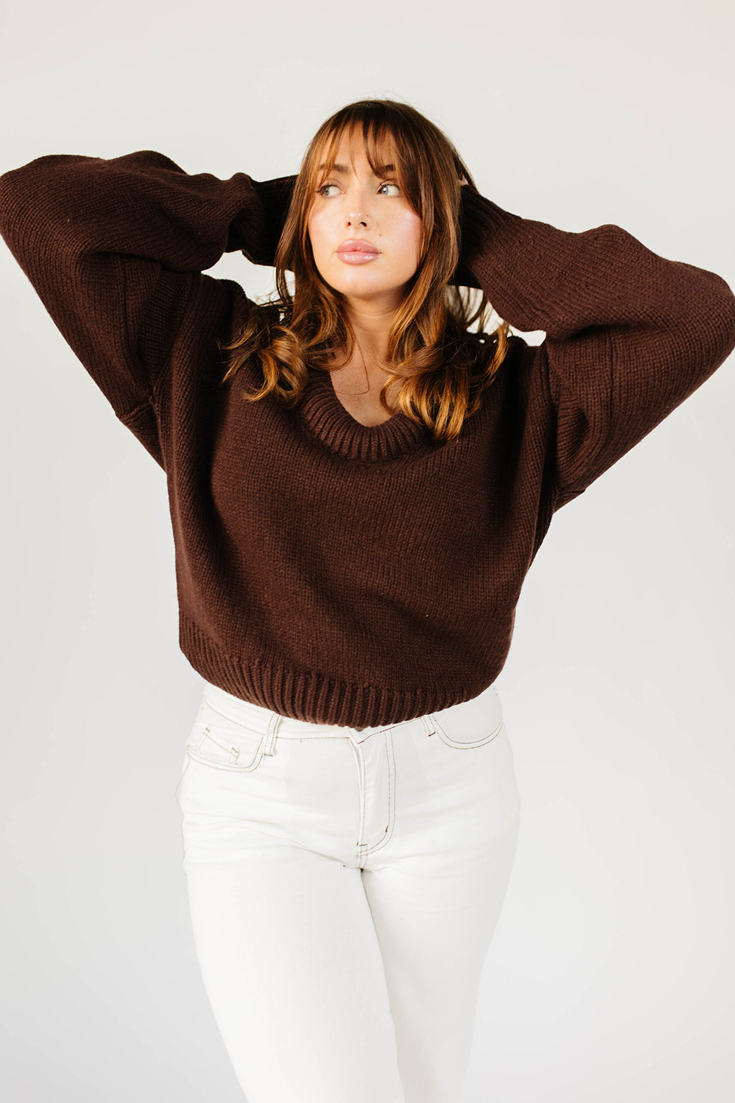 Själva sinnebilden av söt + mysig, denna slappnade tröja med rund halsringning är allt du någonsin önskat dig + mer. Lyxigt mjuk + tjock, den har en oversized silhuett med långa ballongärmar. Oavsett om du bär den över t-shirts + klänningar eller stylar den som den är, är denna chokladbruna tröja gjord för att bäras om, + om, (+ om) igen.