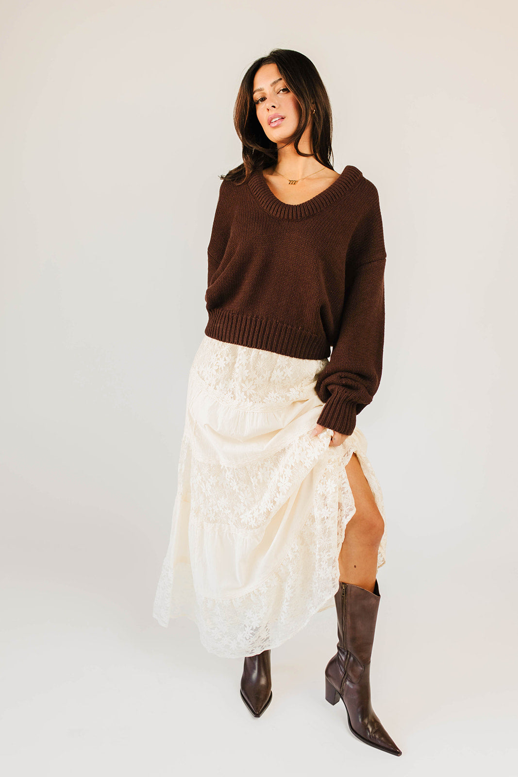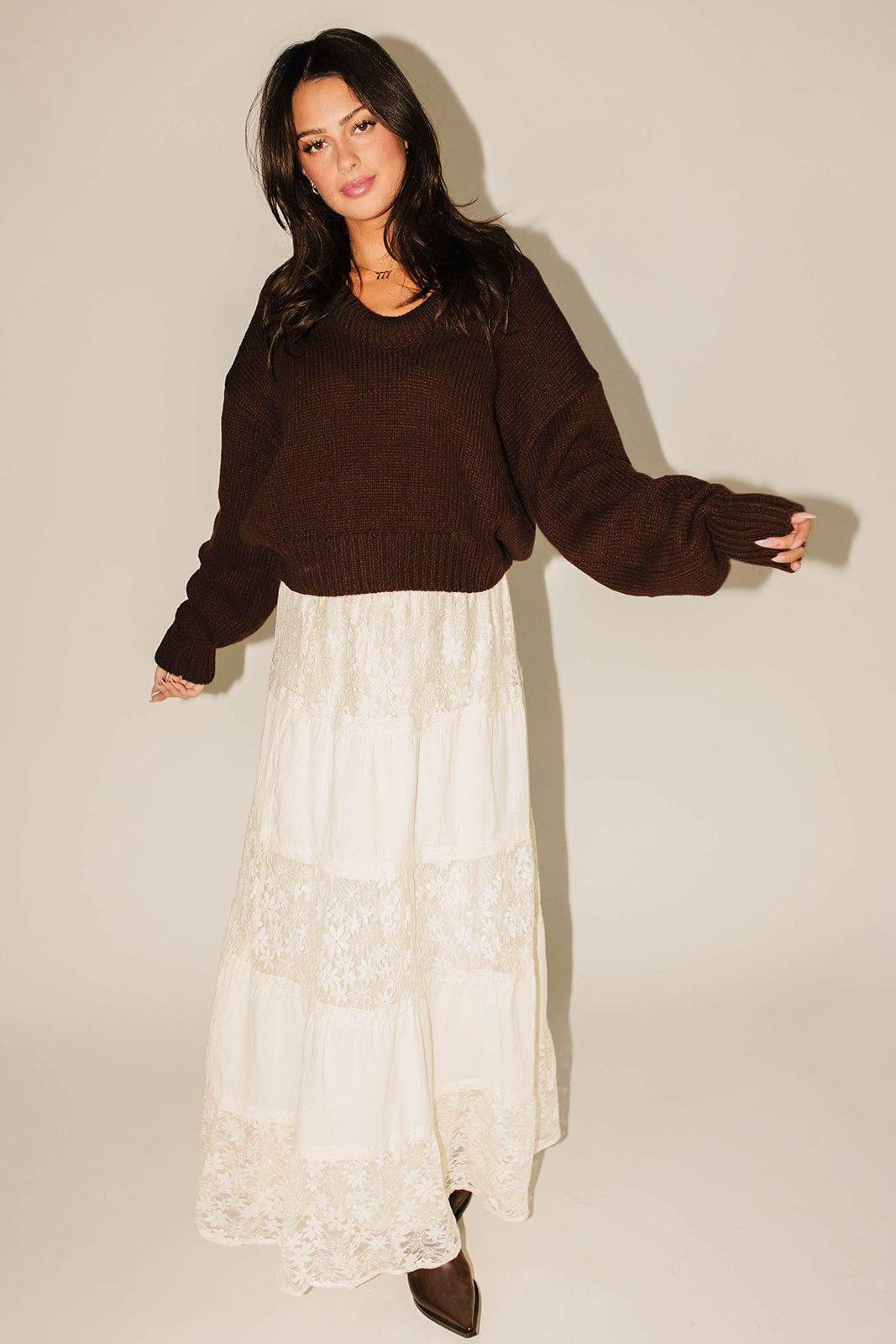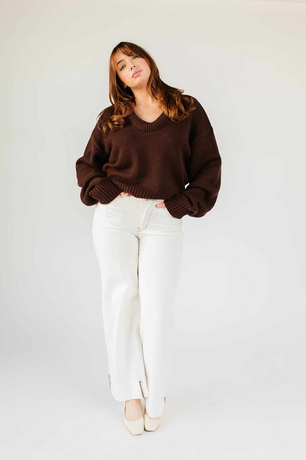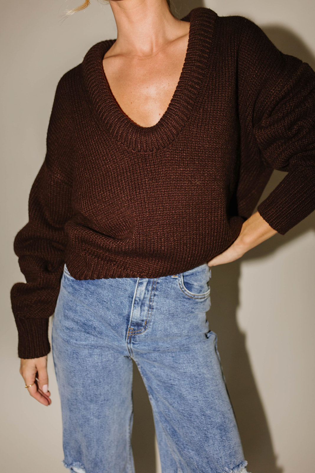 Själva sinnebilden av söt + mysig, denna slappnade tröja med rund halsringning är allt du någonsin önskat dig + mer. Lyxigt mjuk + tjock, den har en oversized silhuett med långa ballongärmar. Oavsett om du bär den över t-shirts + klänningar eller stylar den som den är, är denna chokladbruna tröja gjord för att bäras om, + om, (+ om) igen.