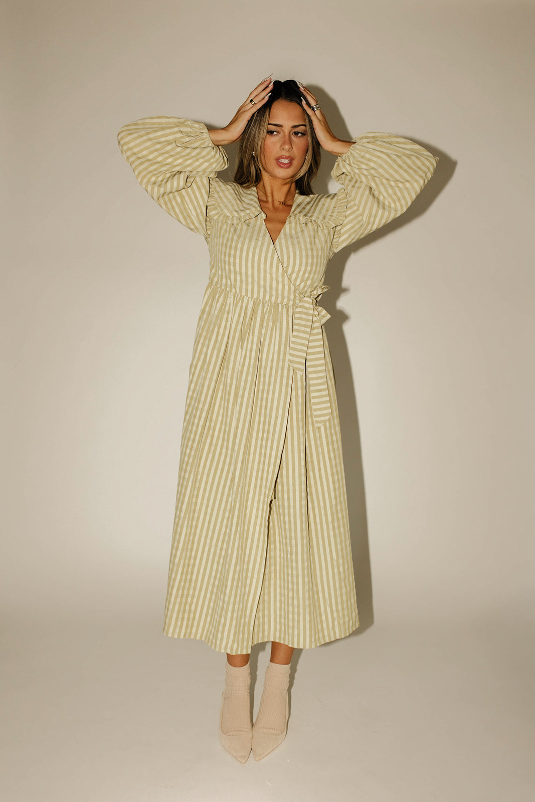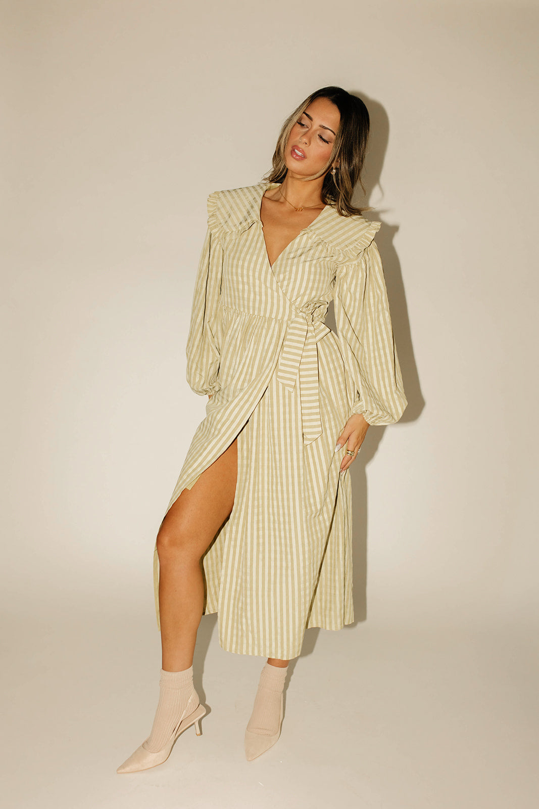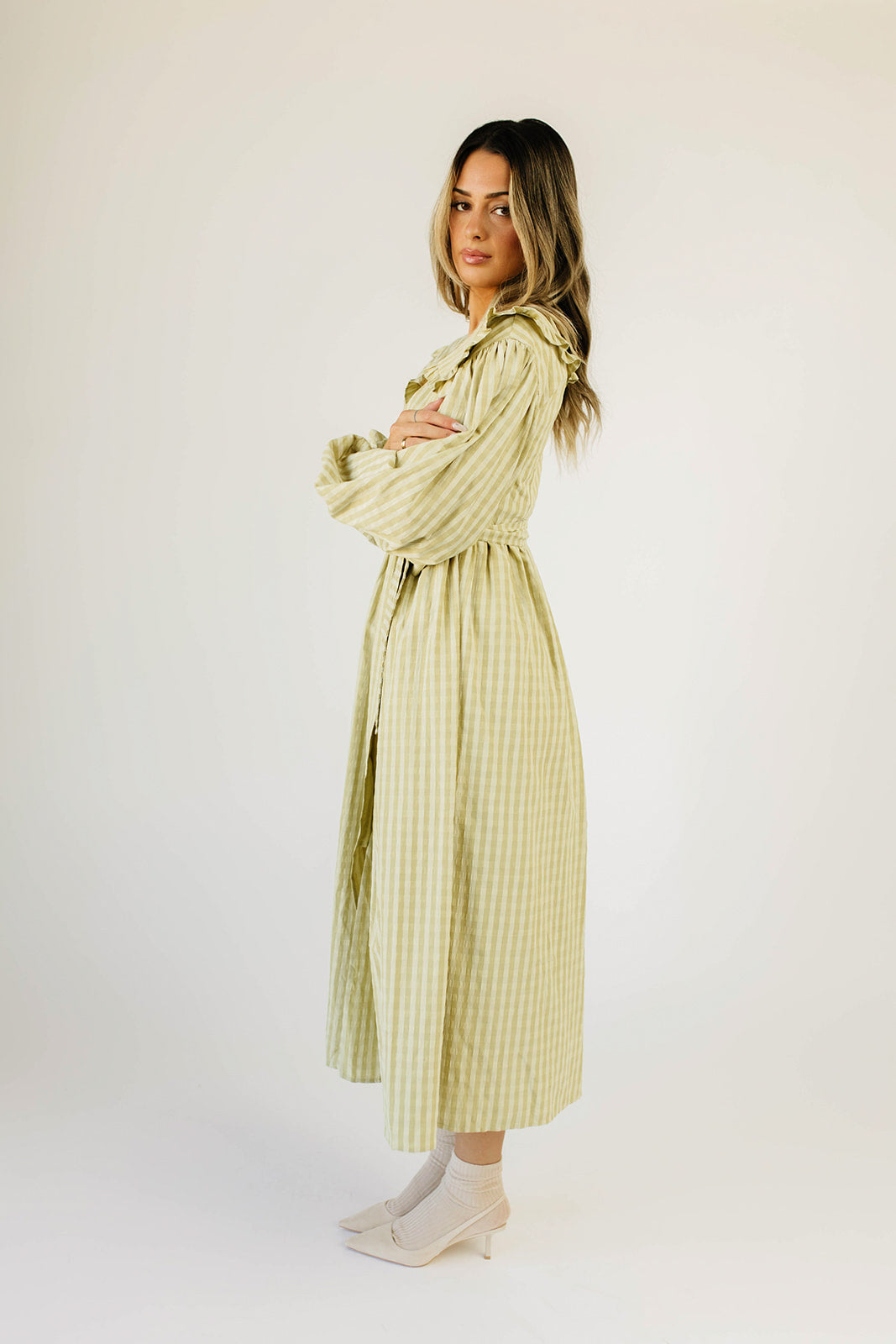 En maxiklänning gjord för varje säsong, denna gröna ginghammönstrade omlottklänning är ett tidlöst must-have. Med en äkta omlottsilhuett och en volangkrage är denna långärmade maxiklänning en total blickmagnet. Ett måste för familjebilder, möhippor + allt däremellan, vi älskar den i kombination med knähöga stövlar på hösten // vintern + fina klackar på våren // sommaren.
