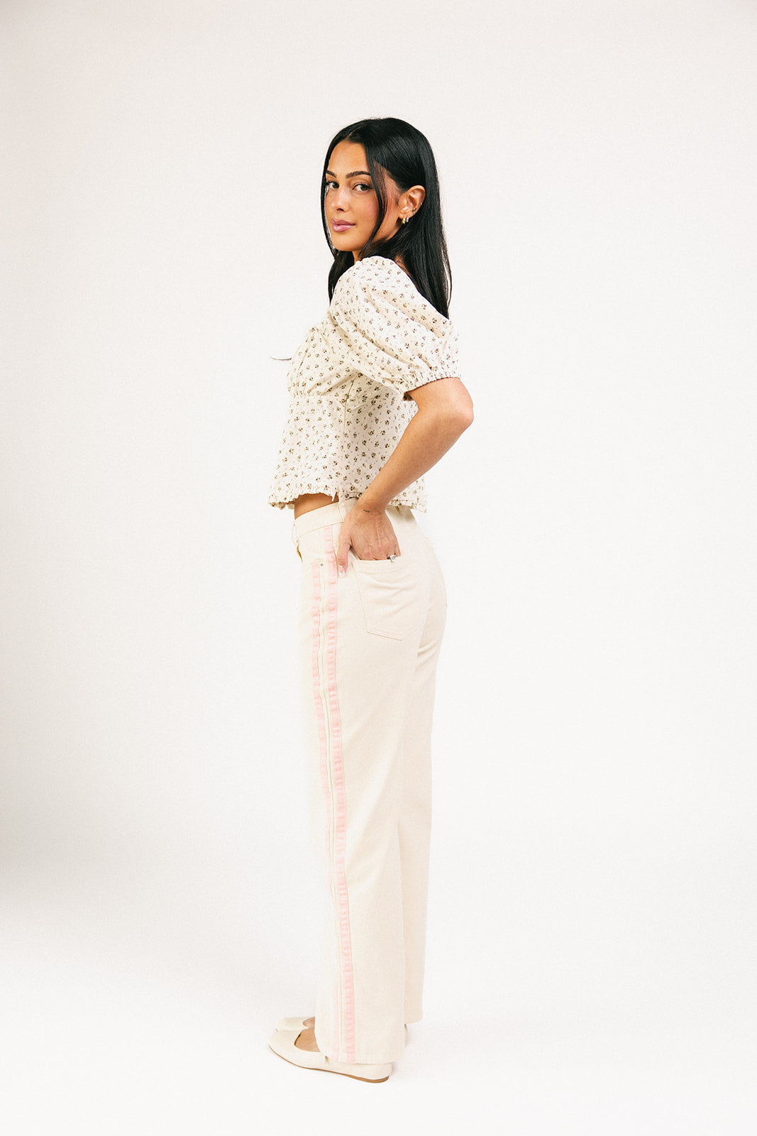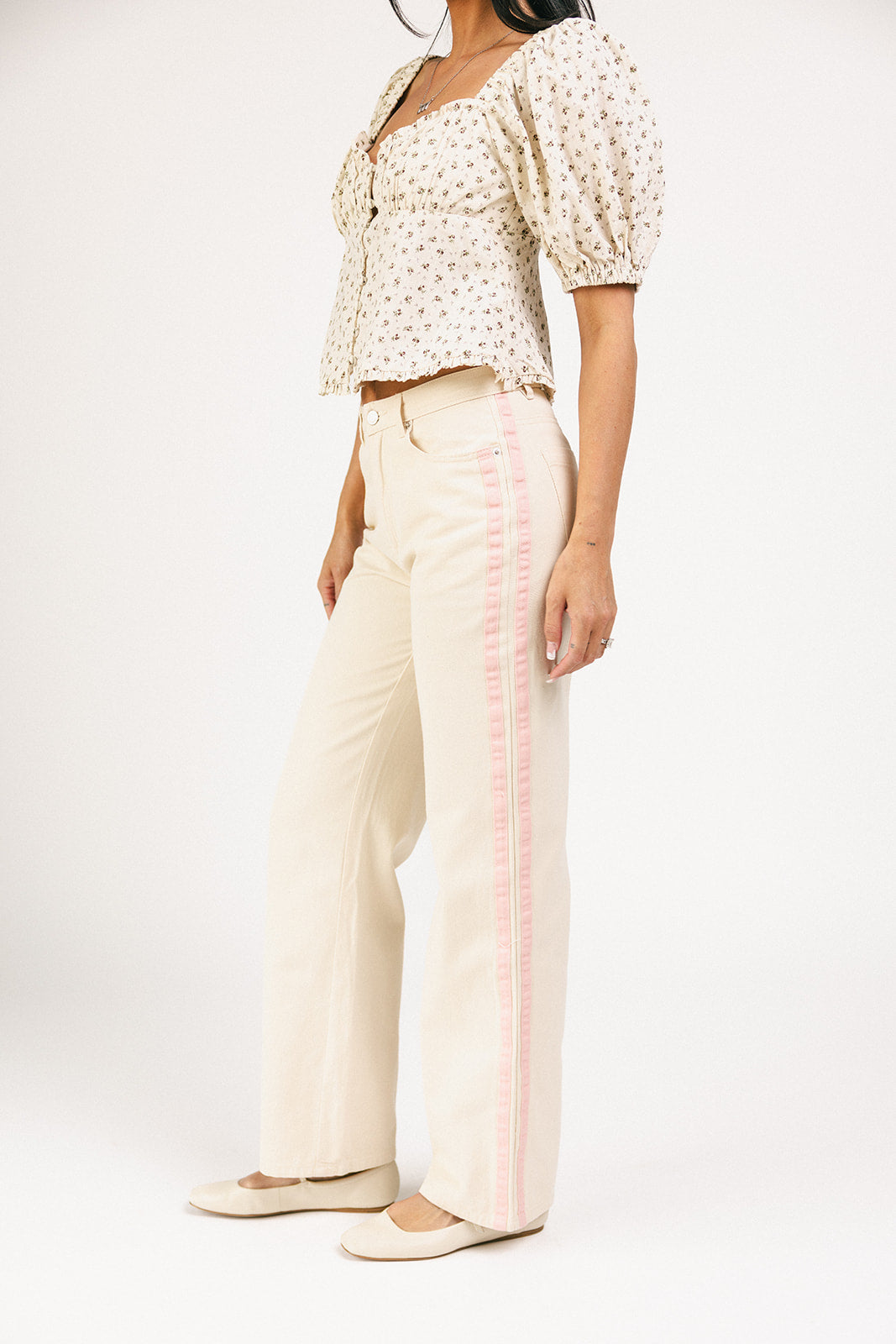 De perfekta raka jeansen för vilken it-girl-outfit som helst, de har en neutral bas med trendiga rosa randiga detaljer. Oavsett om du spelar upp en färgklick eller låter dem göra ett uttalande på egen hand, kommer de att ta vilken outfit som helst till nästa nivå.