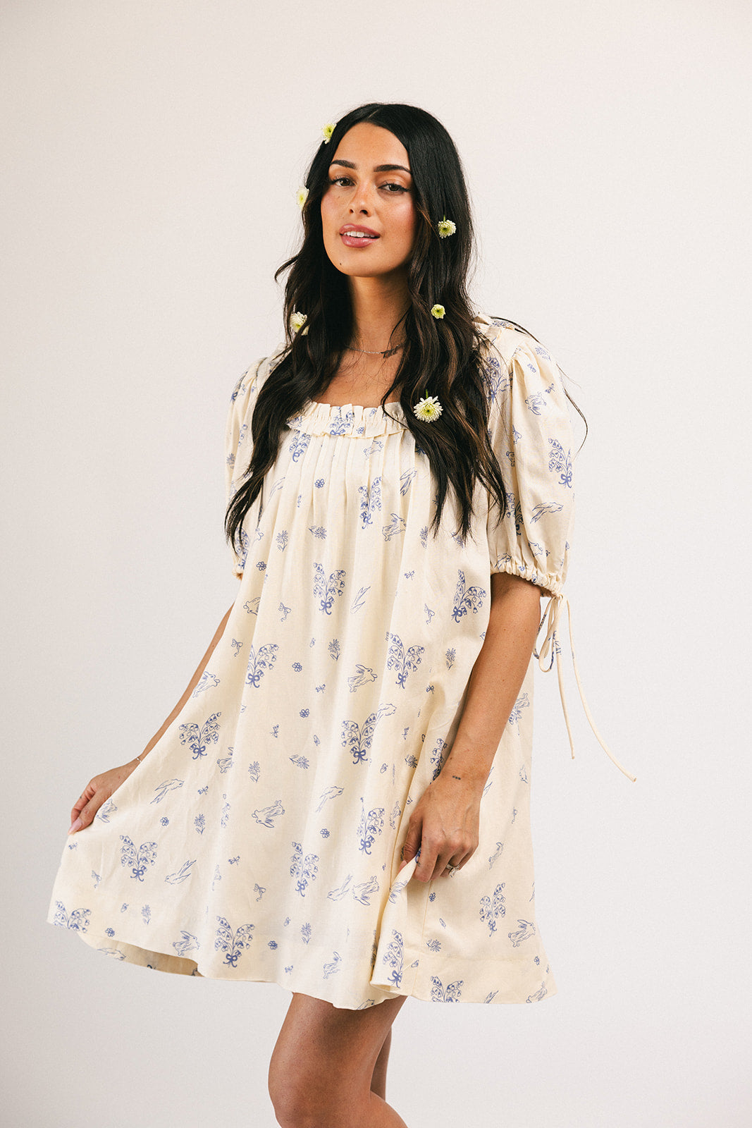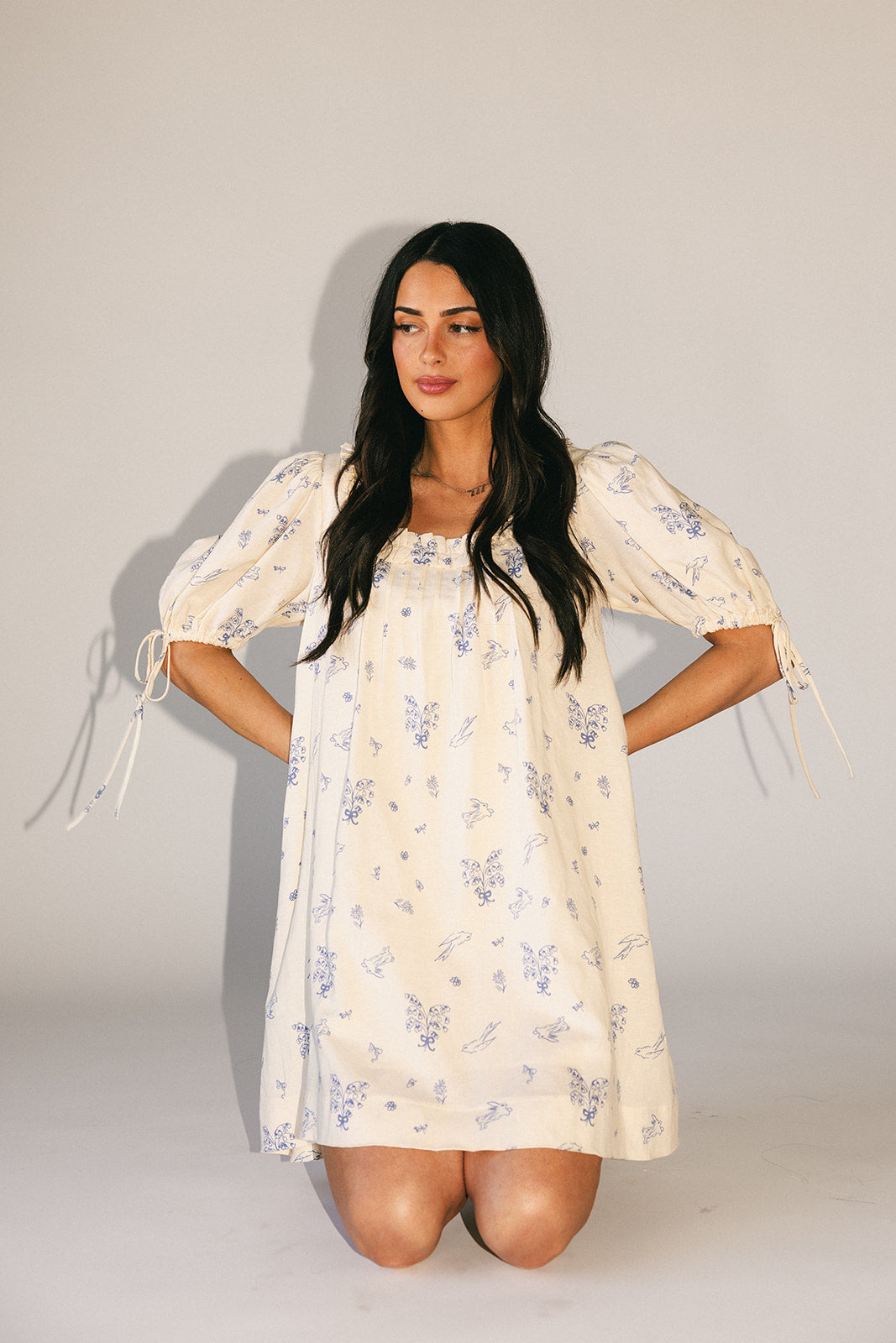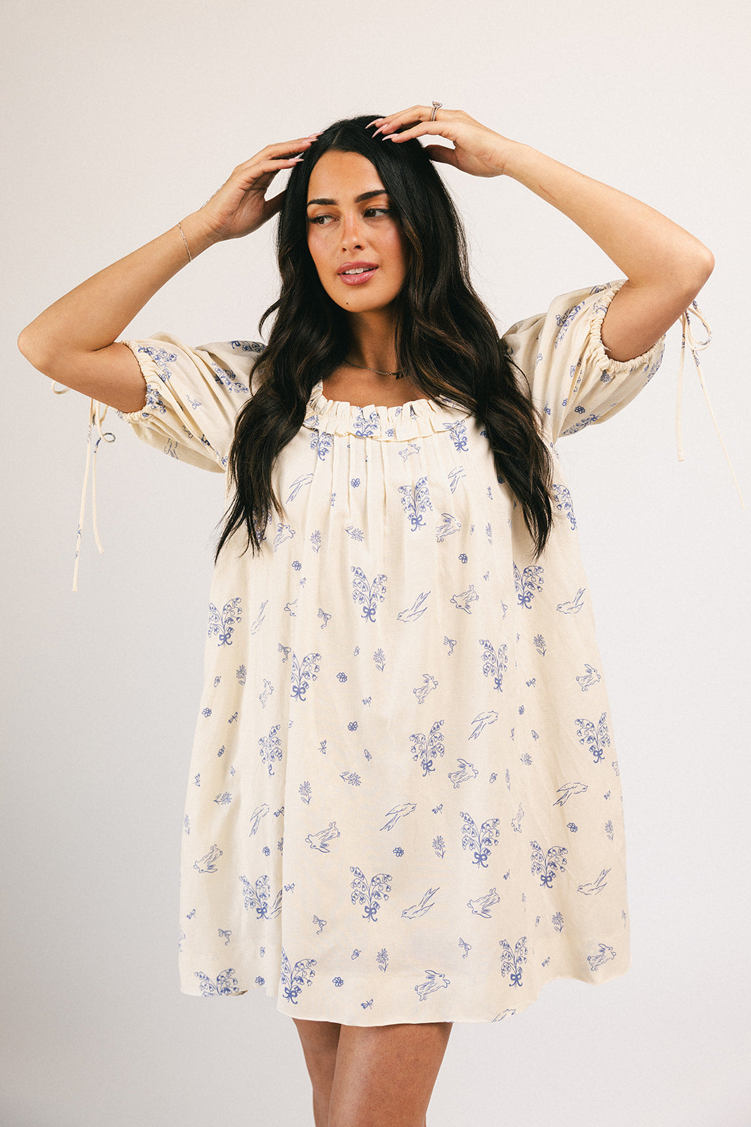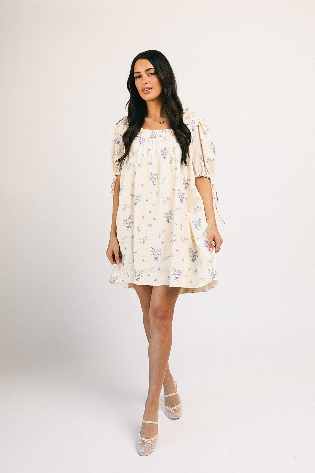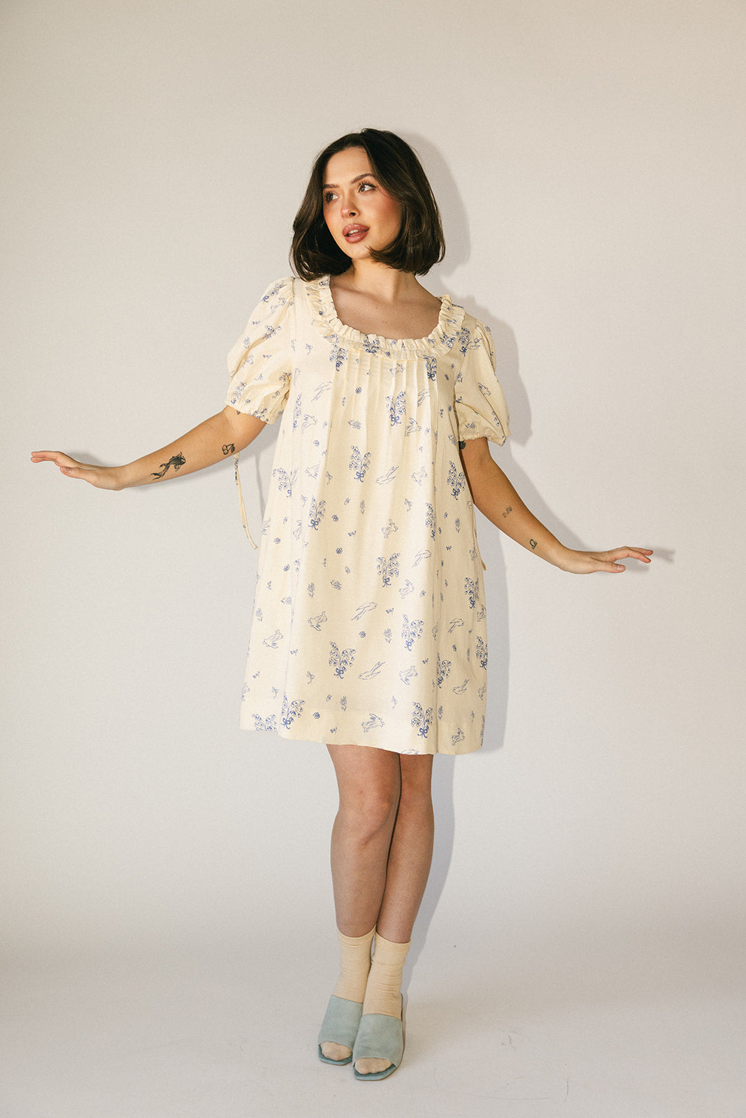 Elegant + förtrollande, denna kortärmade miniklänning är gjord för trädgårdsfester, brunchdejter + spontana vårpyssel. Den har ett sött blommigt kanintryck + en drömlik volangringning. Oavsett om du klär den upp med klackar eller ner med platta skor, är det det perfekta plagget för vår + sommar.