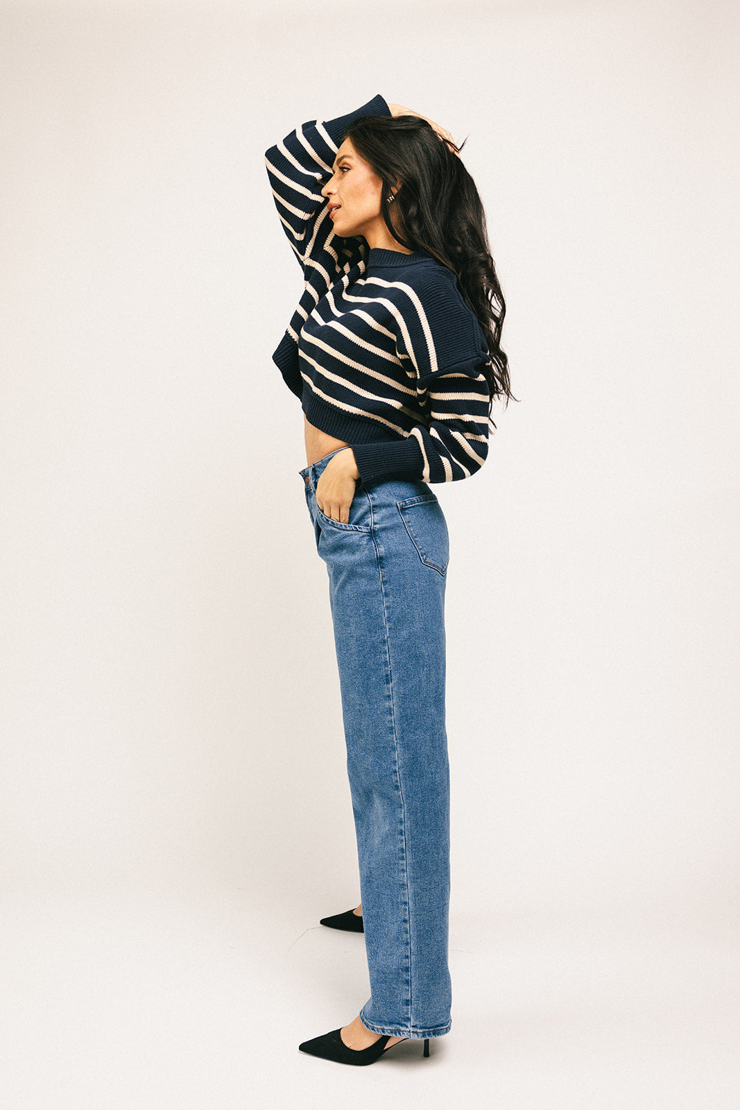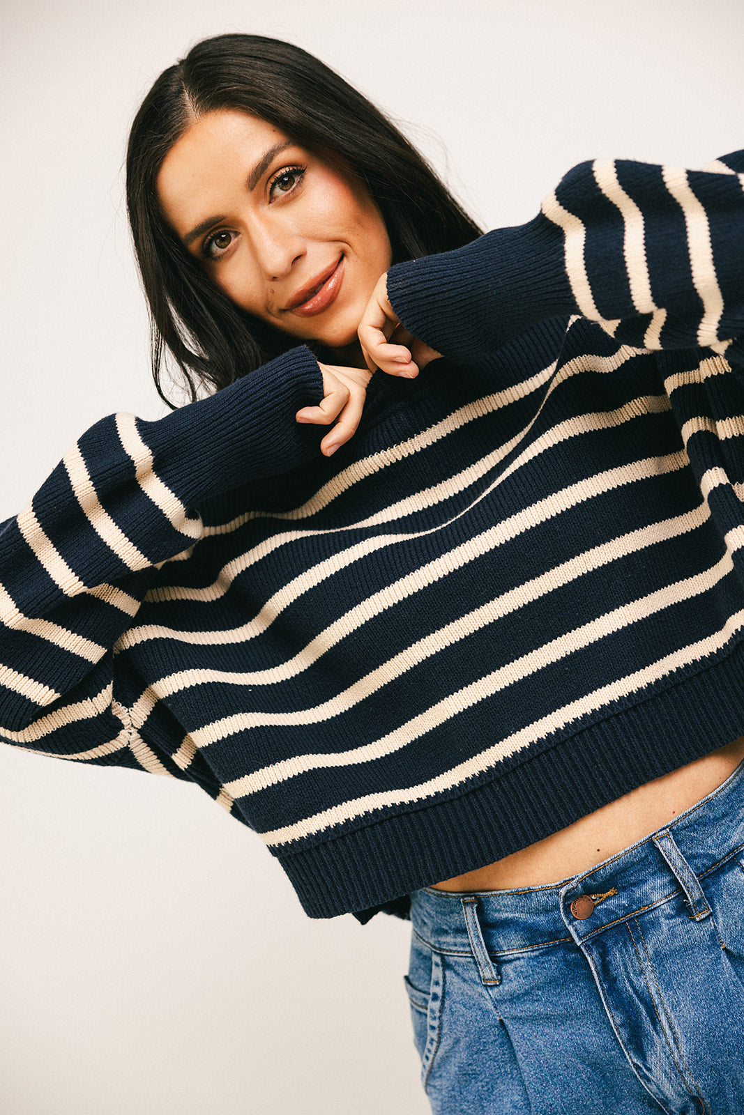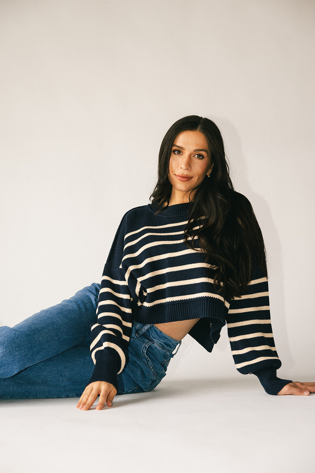 Denna fyrkantiga marinblå randiga tröja garanteras bli din nya favorit. Den avslappnade, beskurna formen ger den den där energin att "bäras överallt", medan de eleganta ränderna ger en antydan av sofistikering. Den perfekta tröjan för att komplettera vilken avslappnad outfit som helst, dejtkvällen eller alla outfits däremellan.