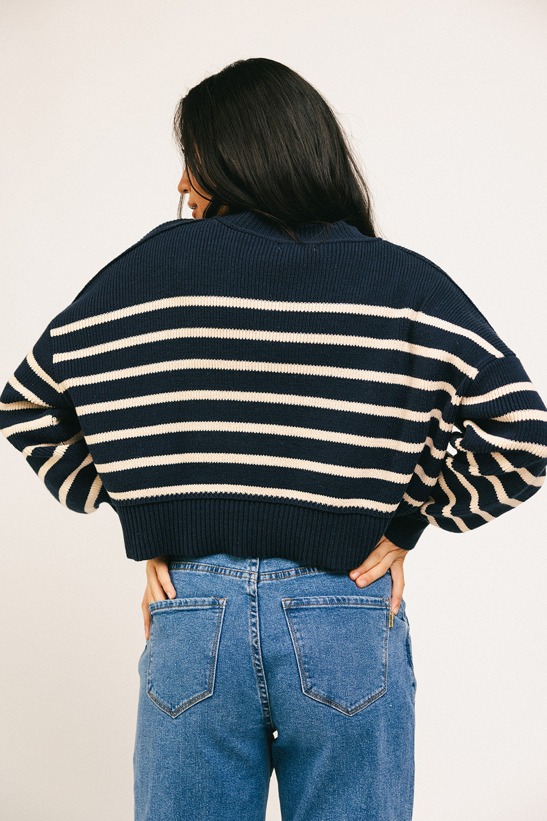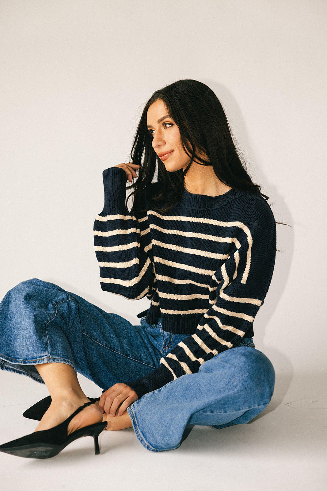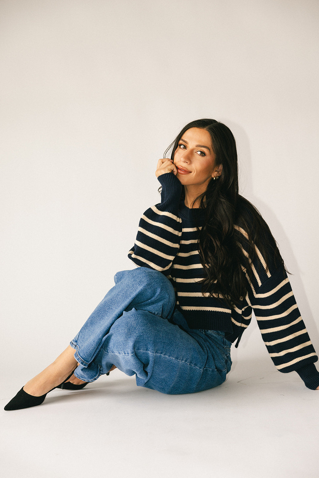 Denna fyrkantiga marinblå randiga tröja garanteras bli din nya favorit. Den avslappnade, beskurna formen ger den den där energin att "bäras överallt", medan de eleganta ränderna ger en antydan av sofistikering. Den perfekta tröjan för att komplettera vilken avslappnad outfit som helst, dejtkvällen eller alla outfits däremellan.