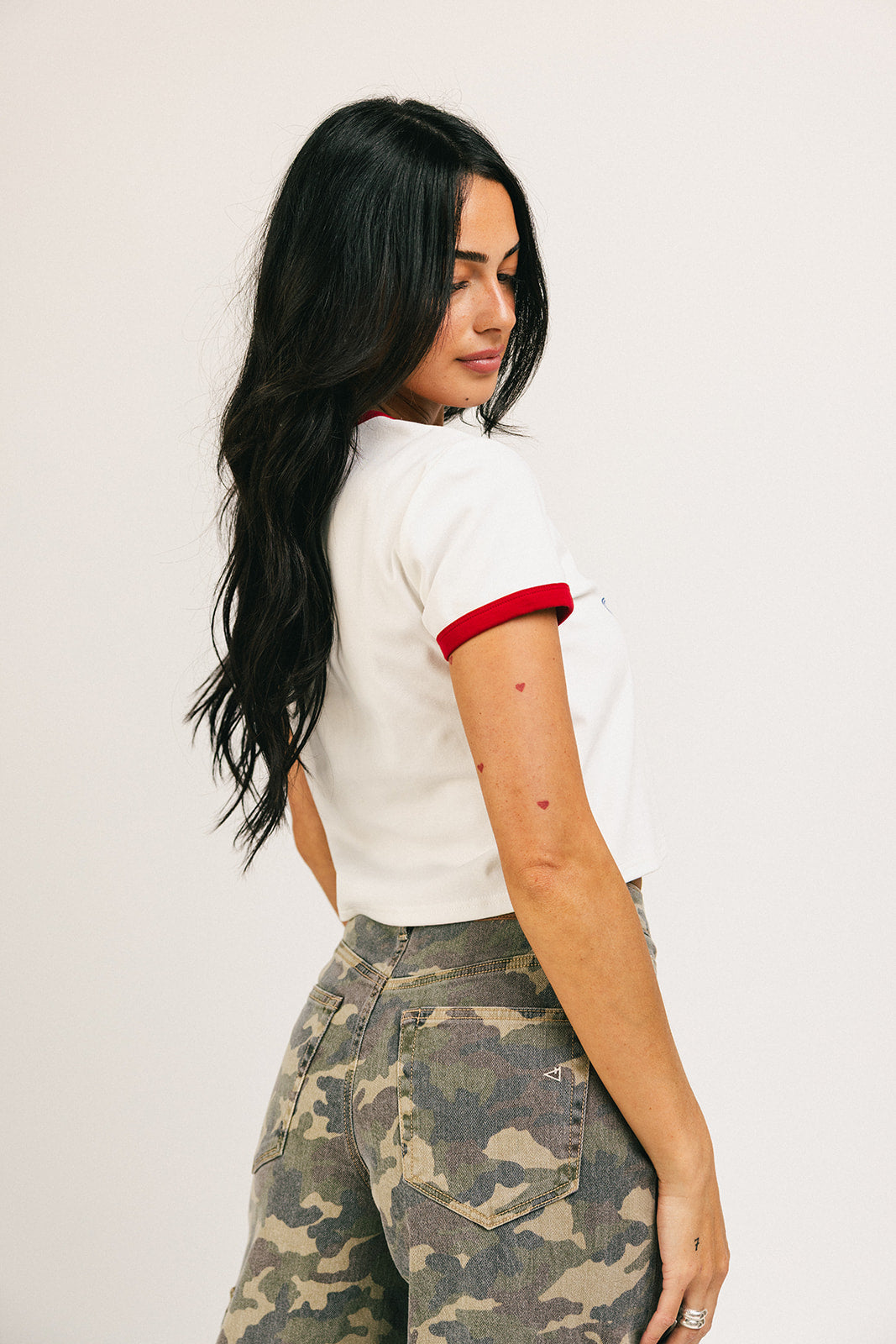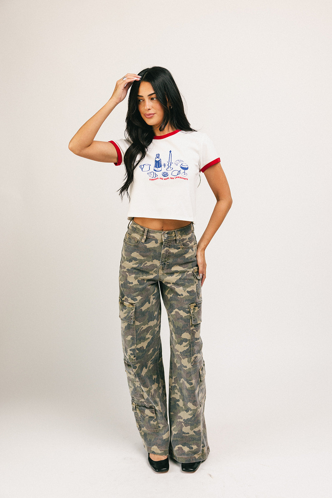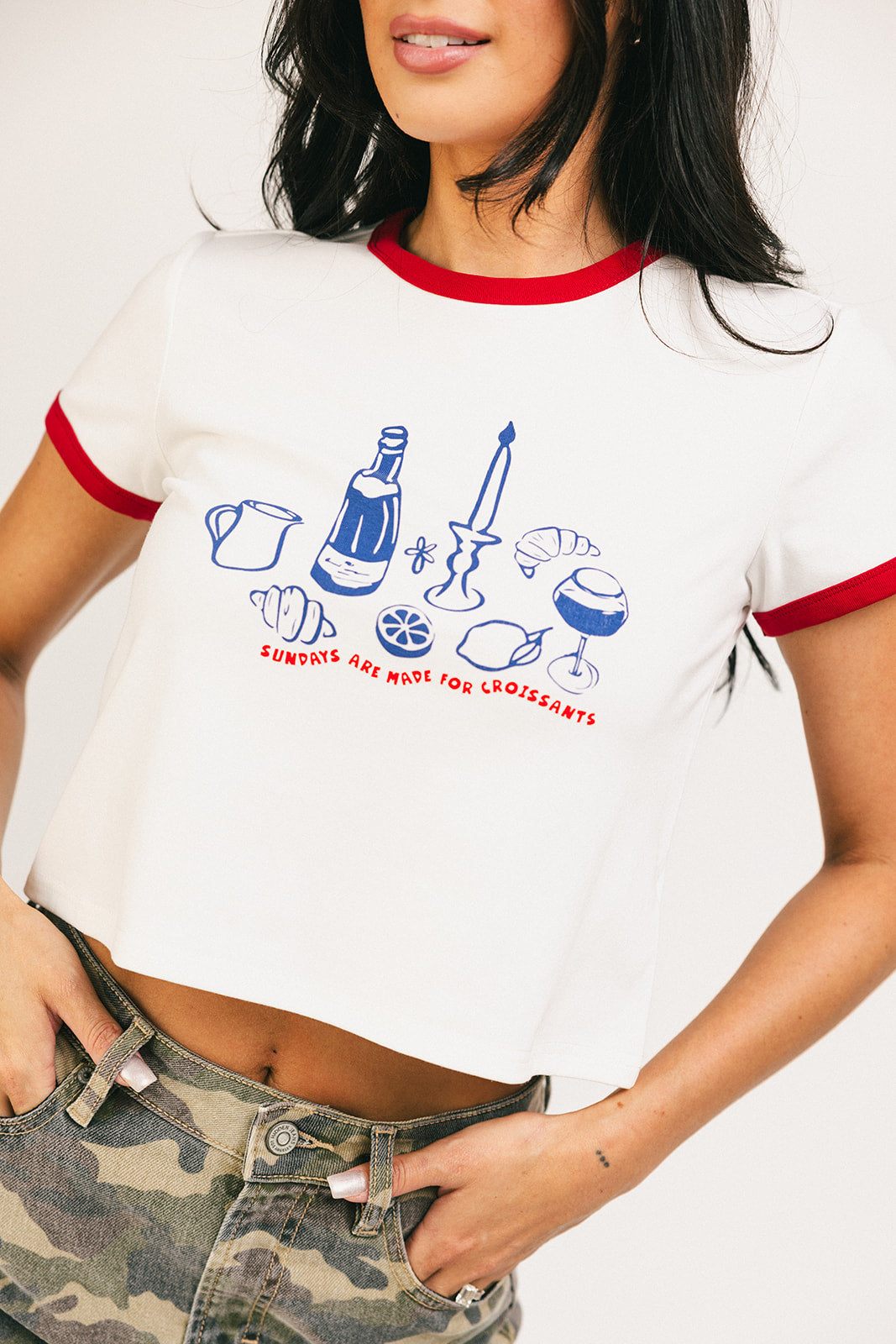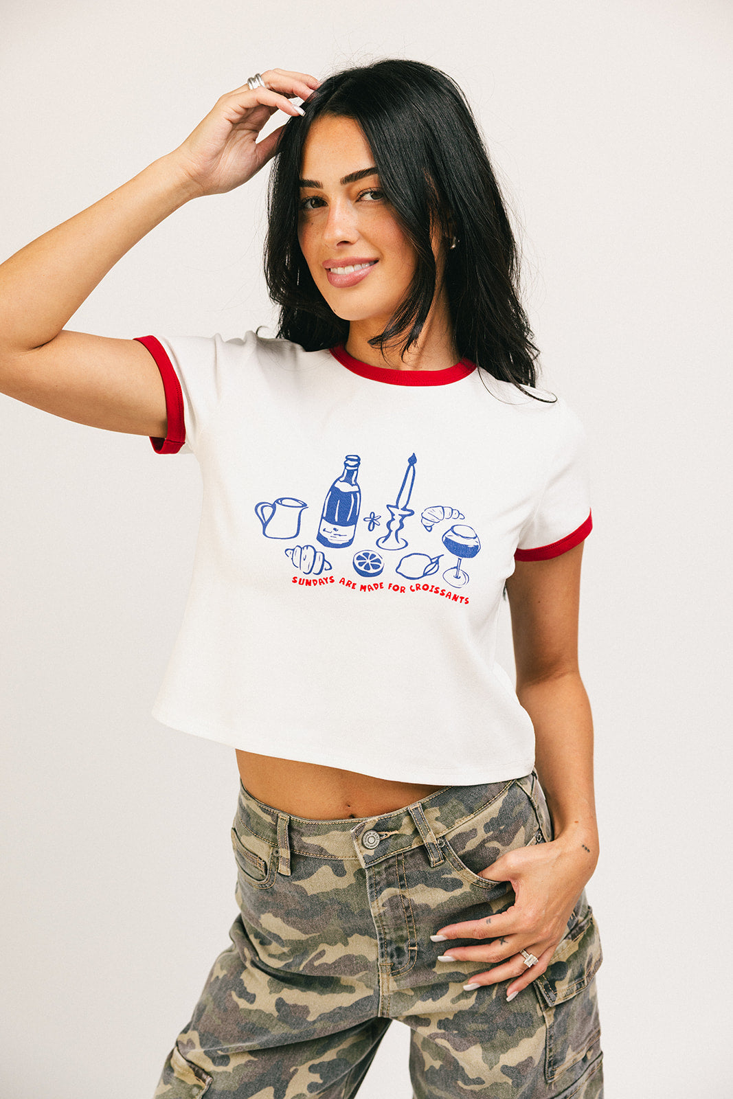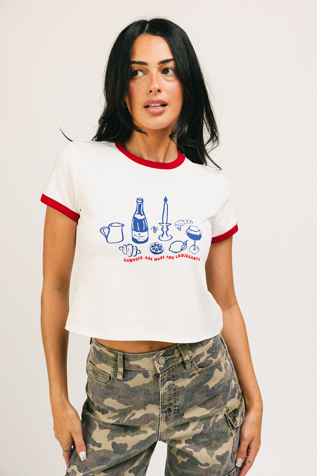 En grafisk t-shirt, men gör den väldigt chic. Denna beskurna babyt-shirt har en bekväm, avslappnad passform + har röda detaljer + en klarblå franskinspirerad illustration. Den perfekta, inte så enkla t-shirten att matcha med jeans, kjolar + shorts hela säsongen.