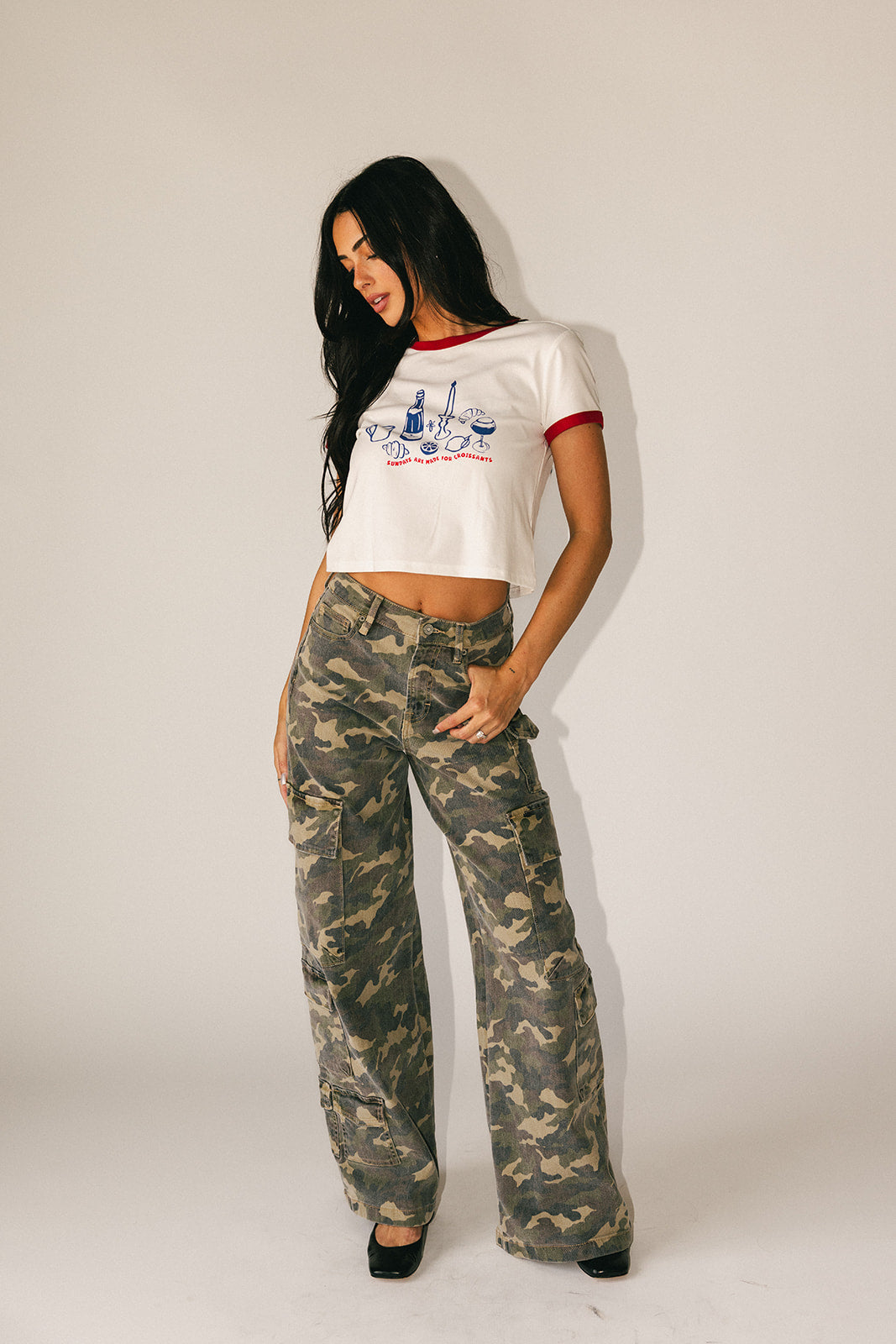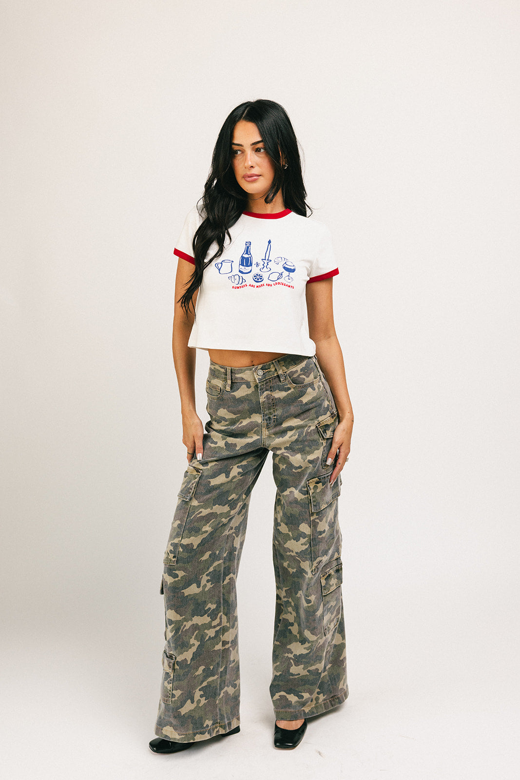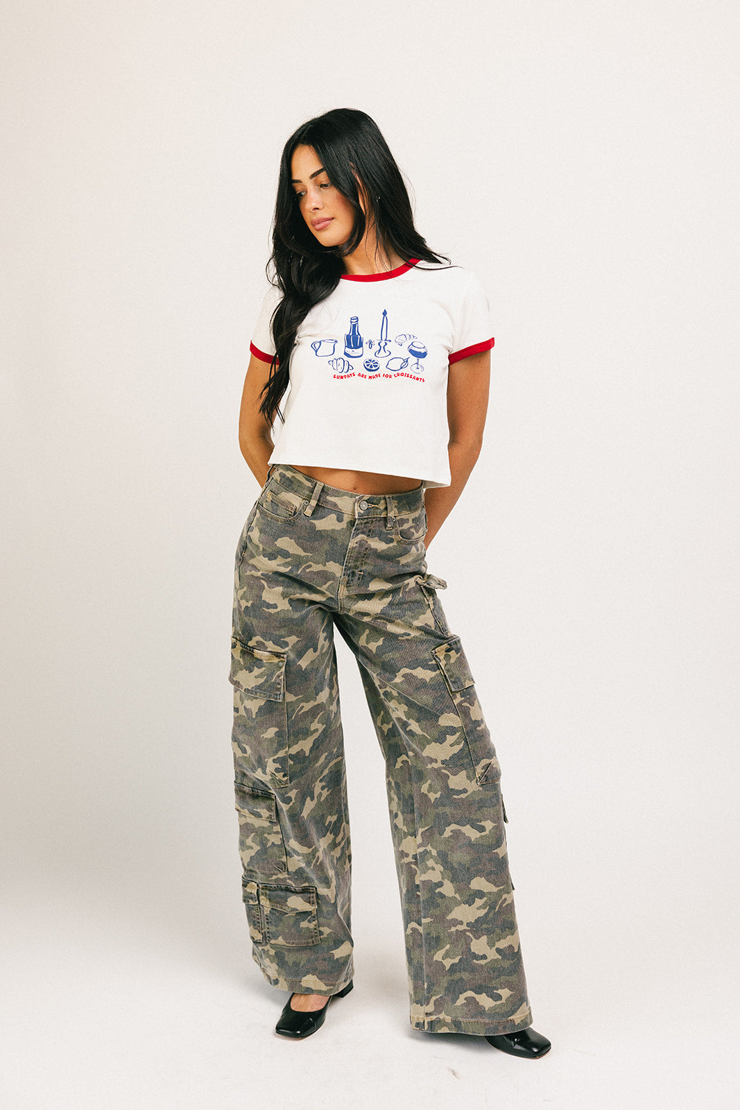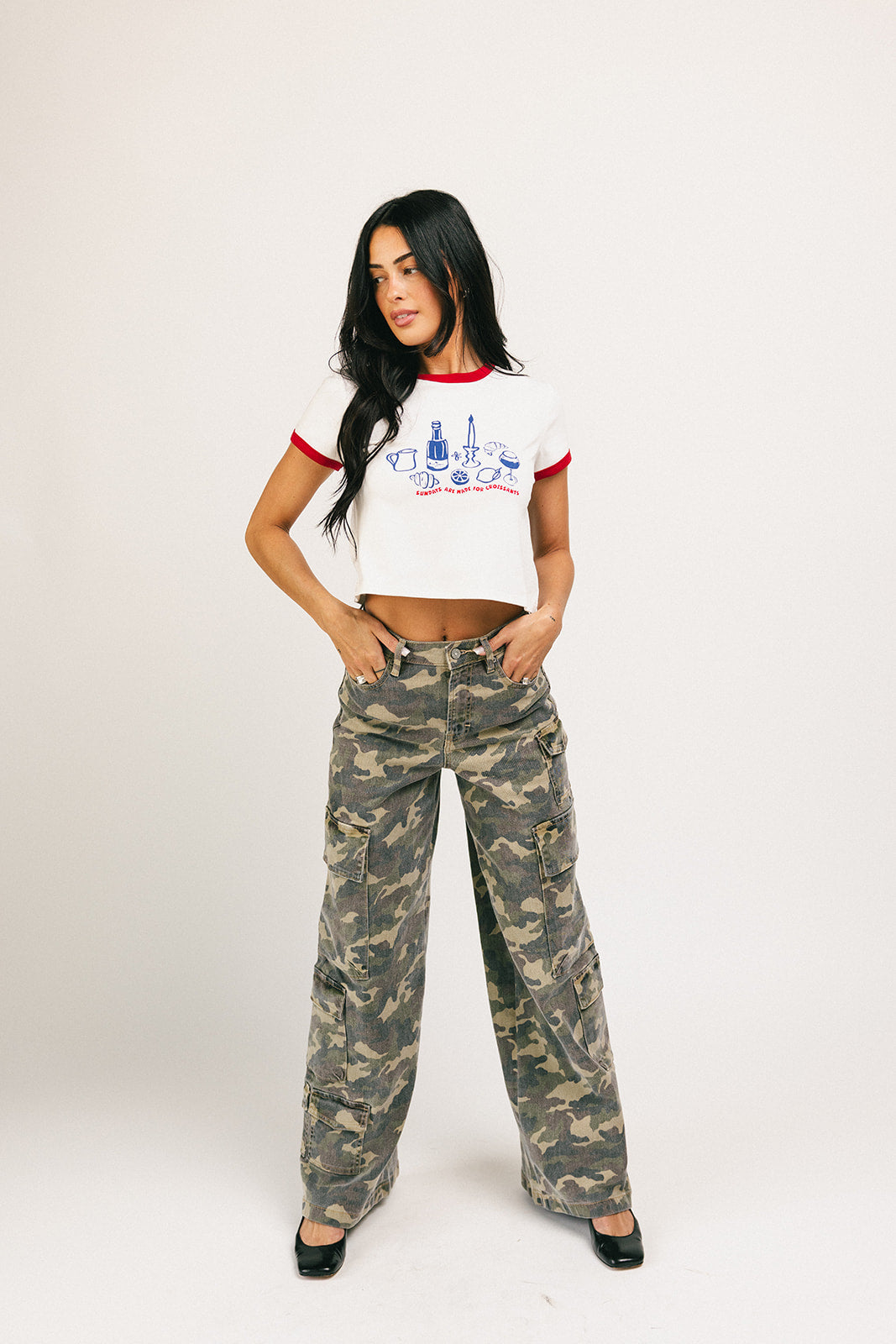 En grafisk t-shirt, men gör den väldigt chic. Denna beskurna babyt-shirt har en bekväm, avslappnad passform + har röda detaljer + en klarblå franskinspirerad illustration. Den perfekta, inte så enkla t-shirten att matcha med jeans, kjolar + shorts hela säsongen.
