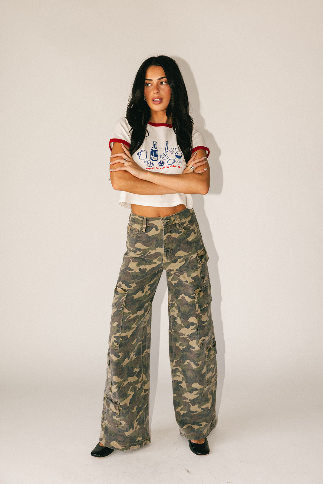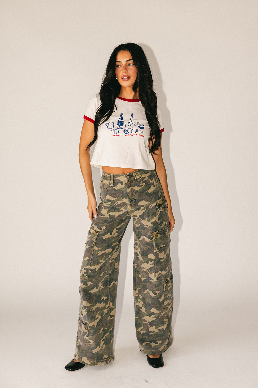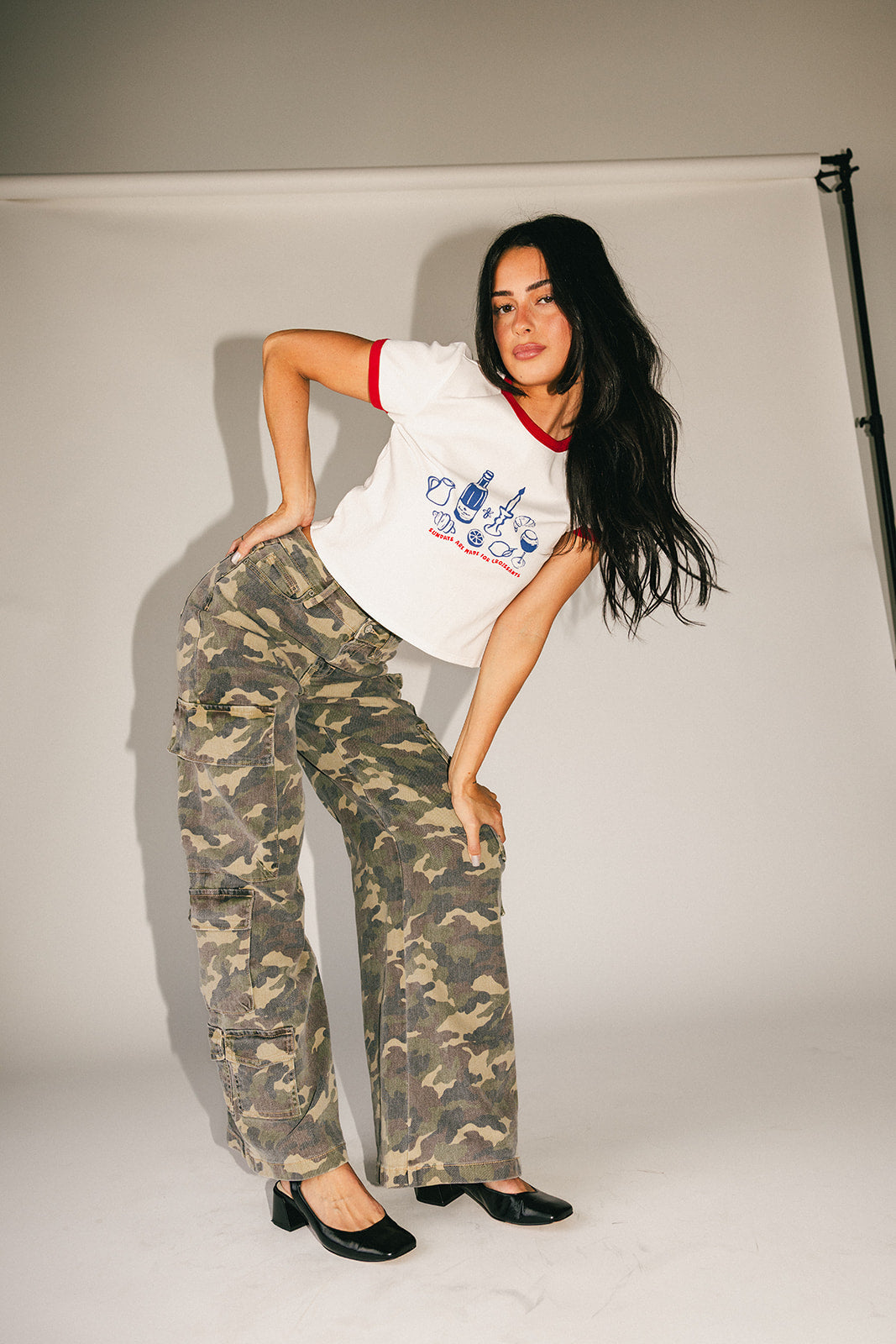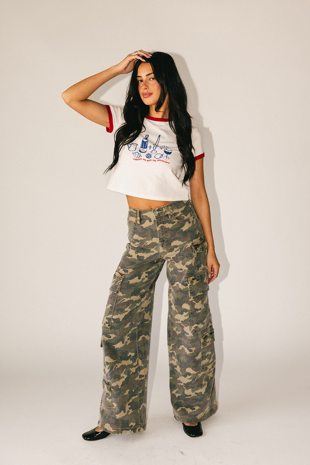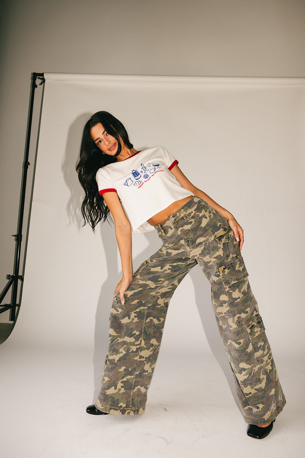 En grafisk t-shirt, men gör den väldigt chic. Denna beskurna babyt-shirt har en bekväm, avslappnad passform + har röda detaljer + en klarblå franskinspirerad illustration. Den perfekta, inte så enkla t-shirten att matcha med jeans, kjolar + shorts hela säsongen.