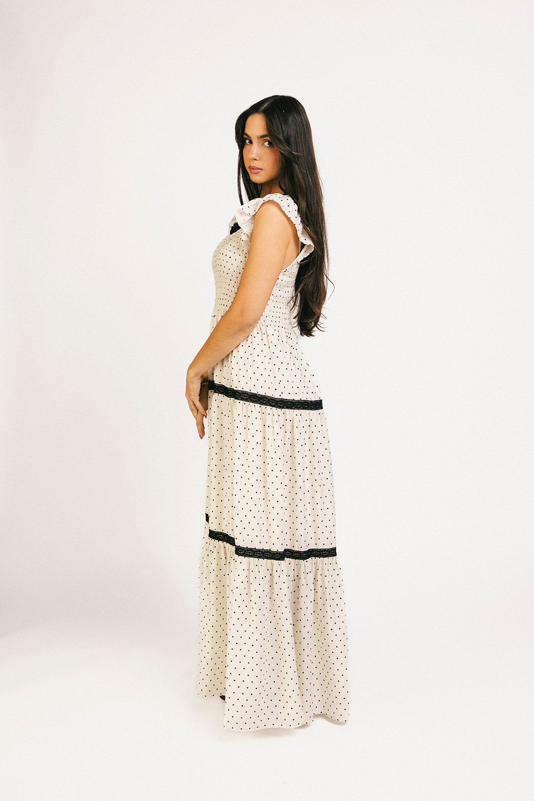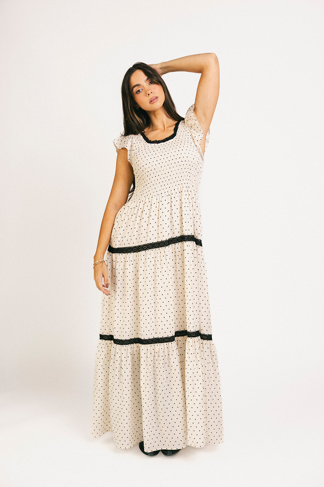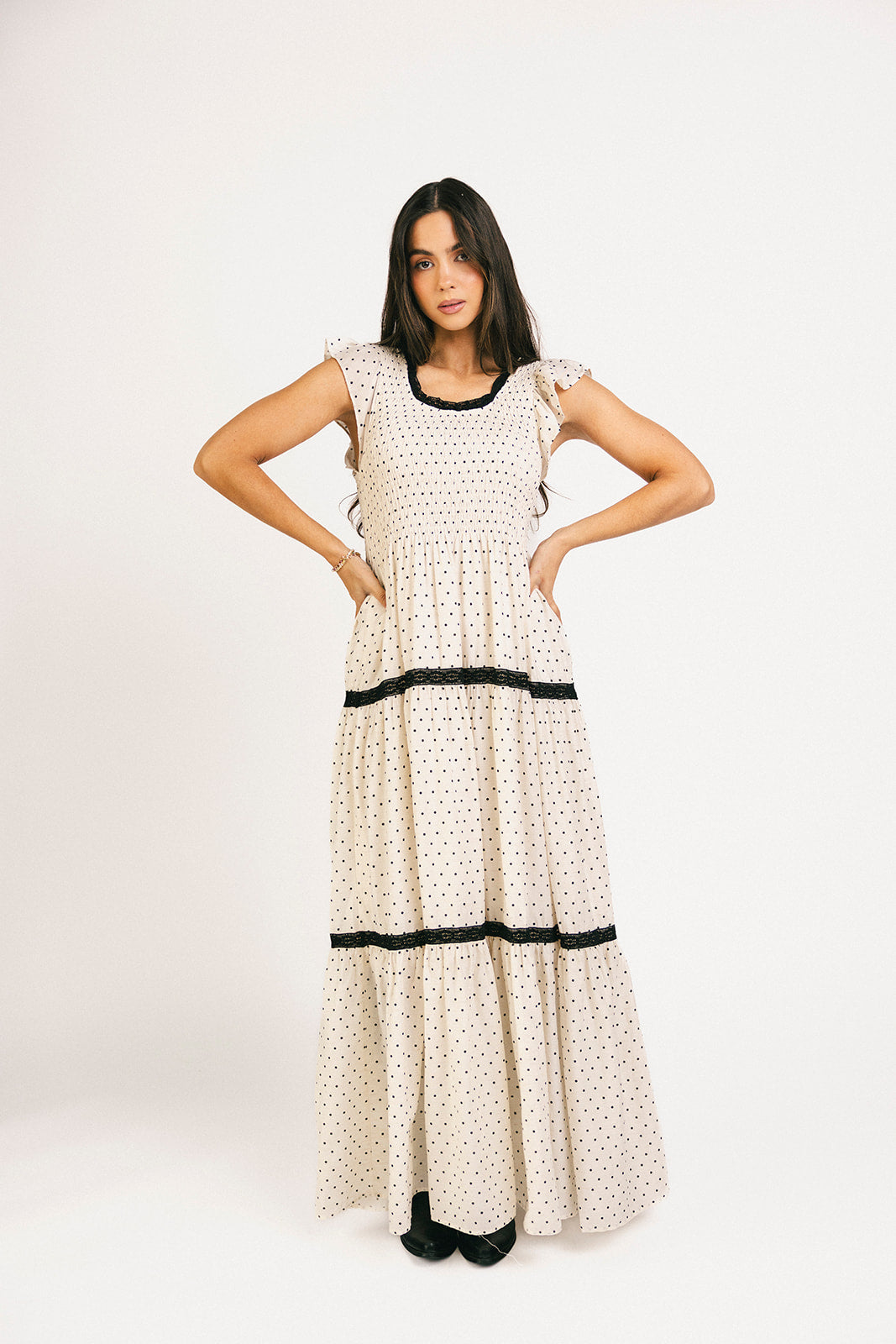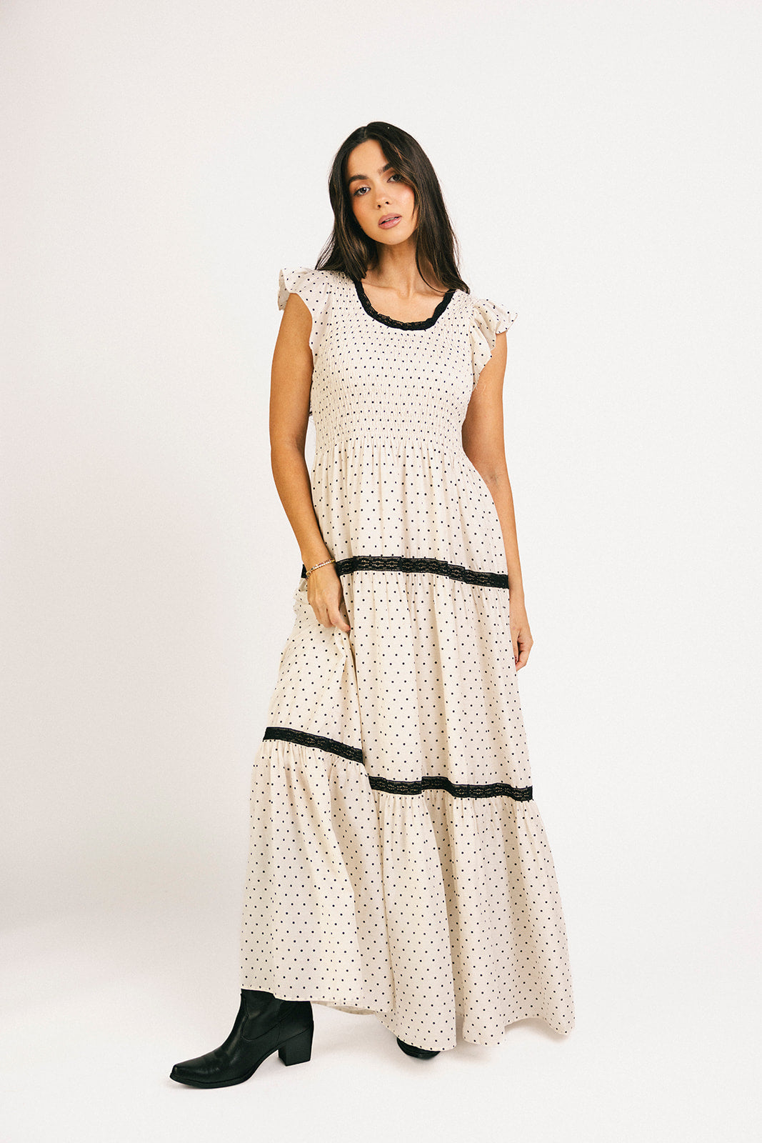 • svarta prickar + naturlig bas // rund halsringning, maxilängd, smockad överdel, utsvängda ärmar, fodrad kjol, spetsdetaljer
