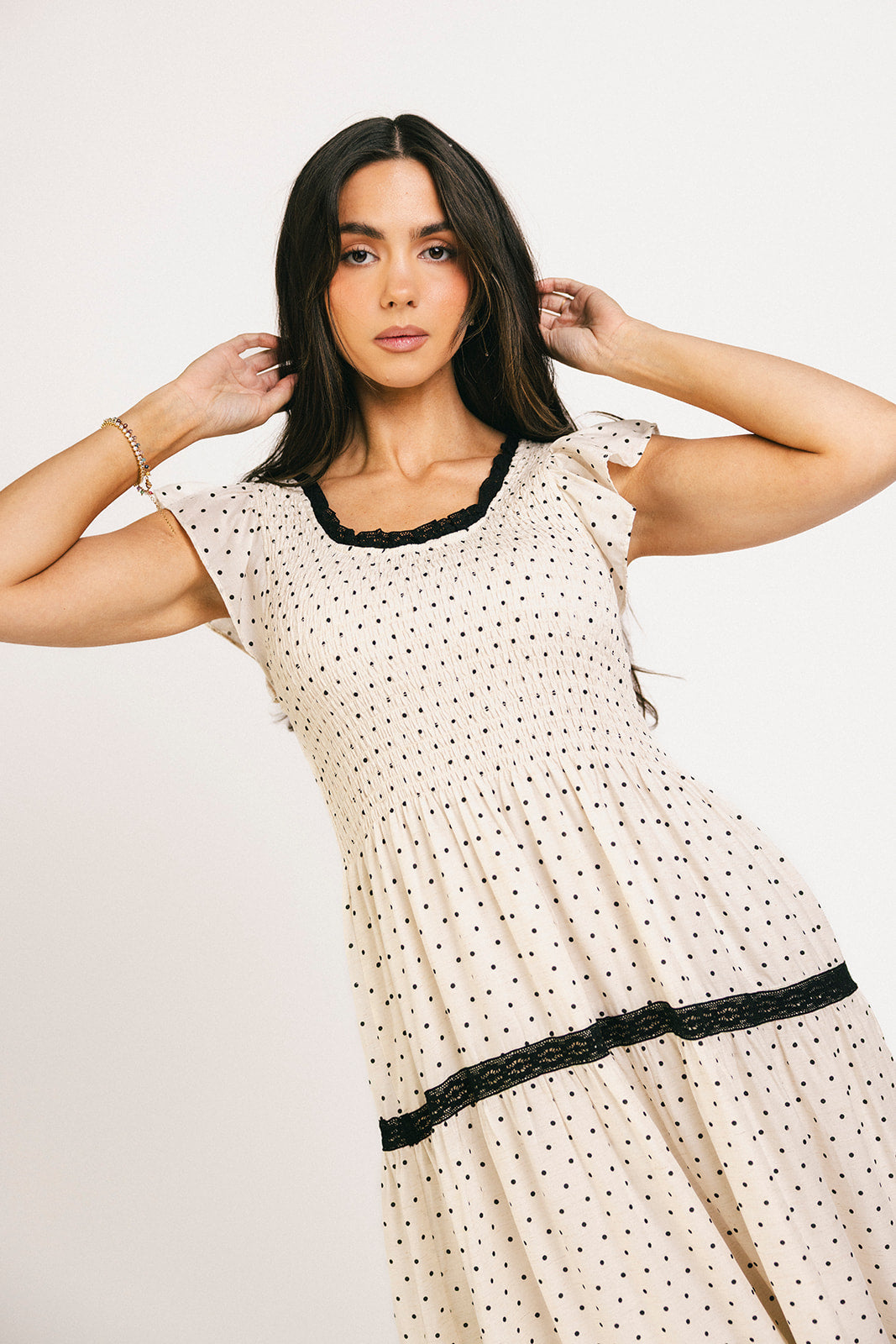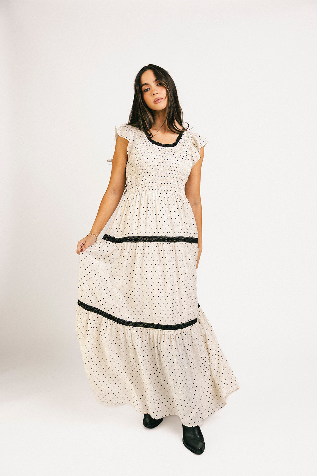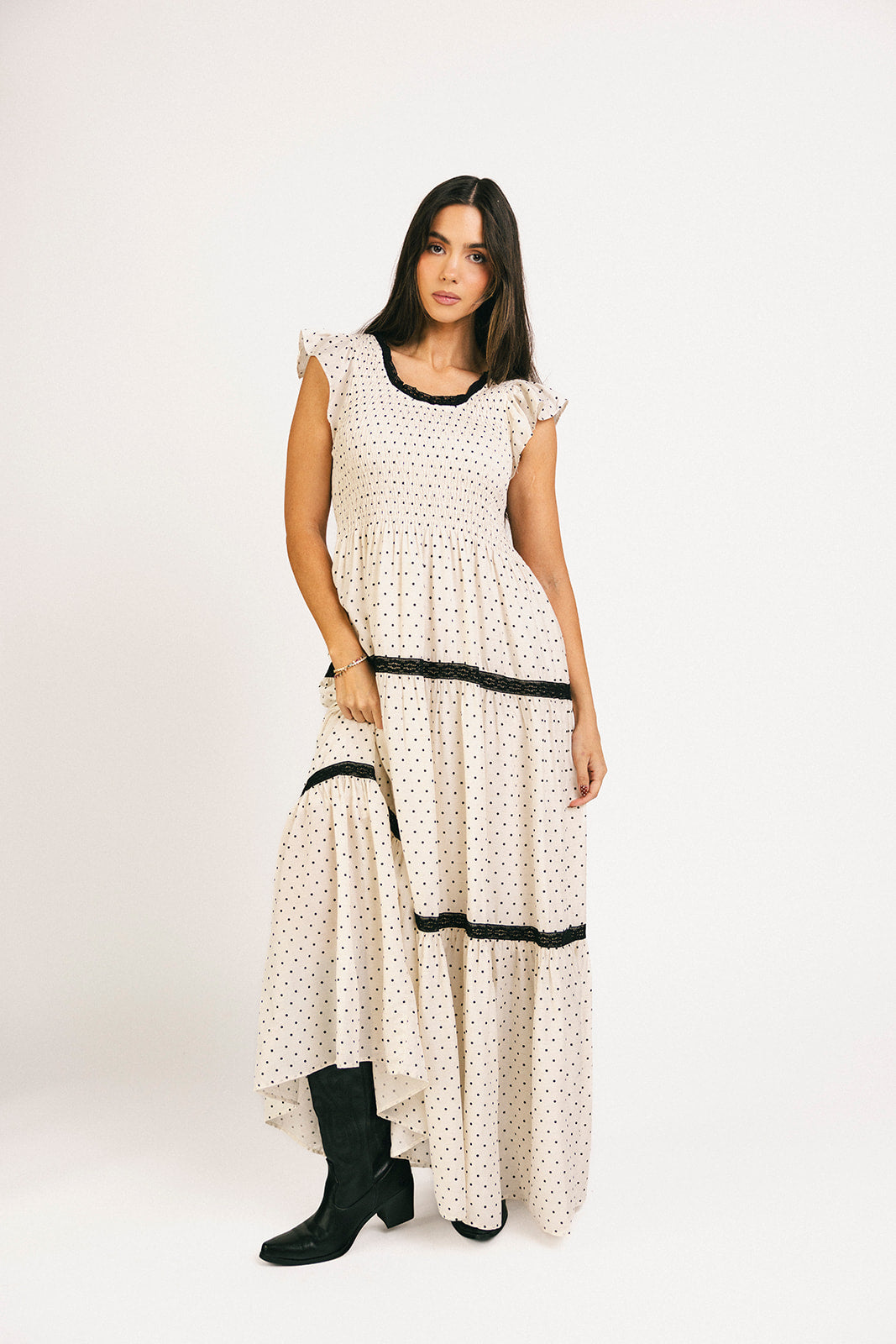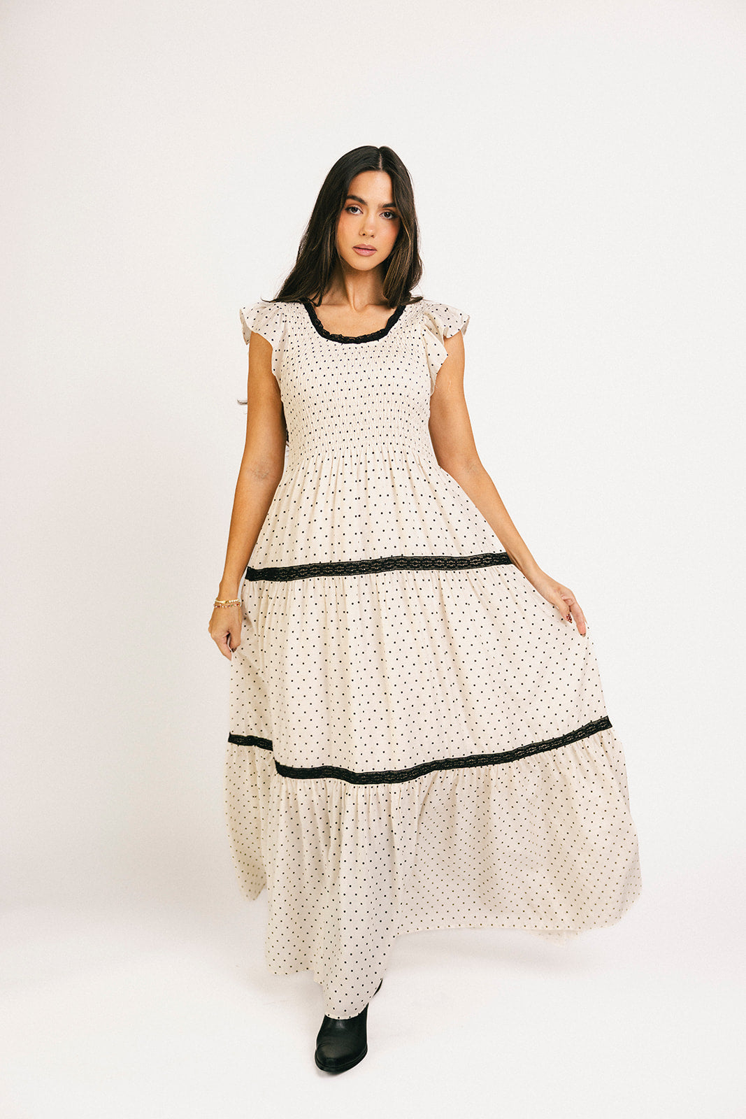 • svarta prickar + naturlig bas // rund halsringning, maxilängd, smockad överdel, utsvängda ärmar, fodrad kjol, spetsdetaljer