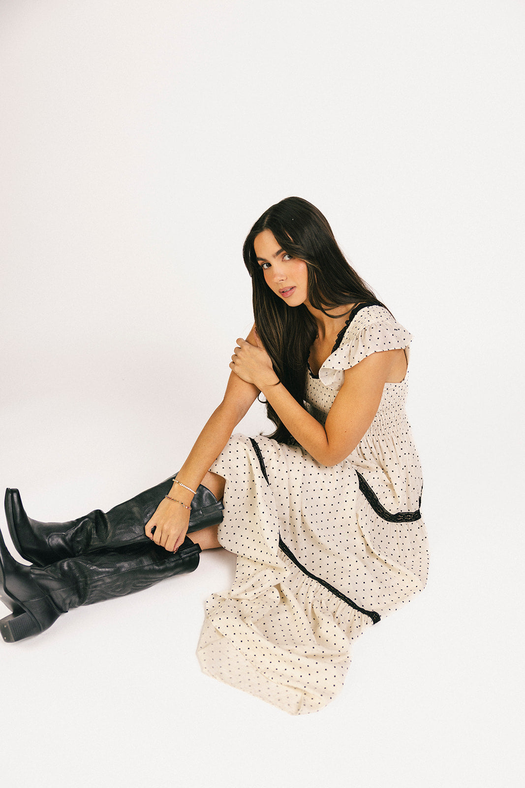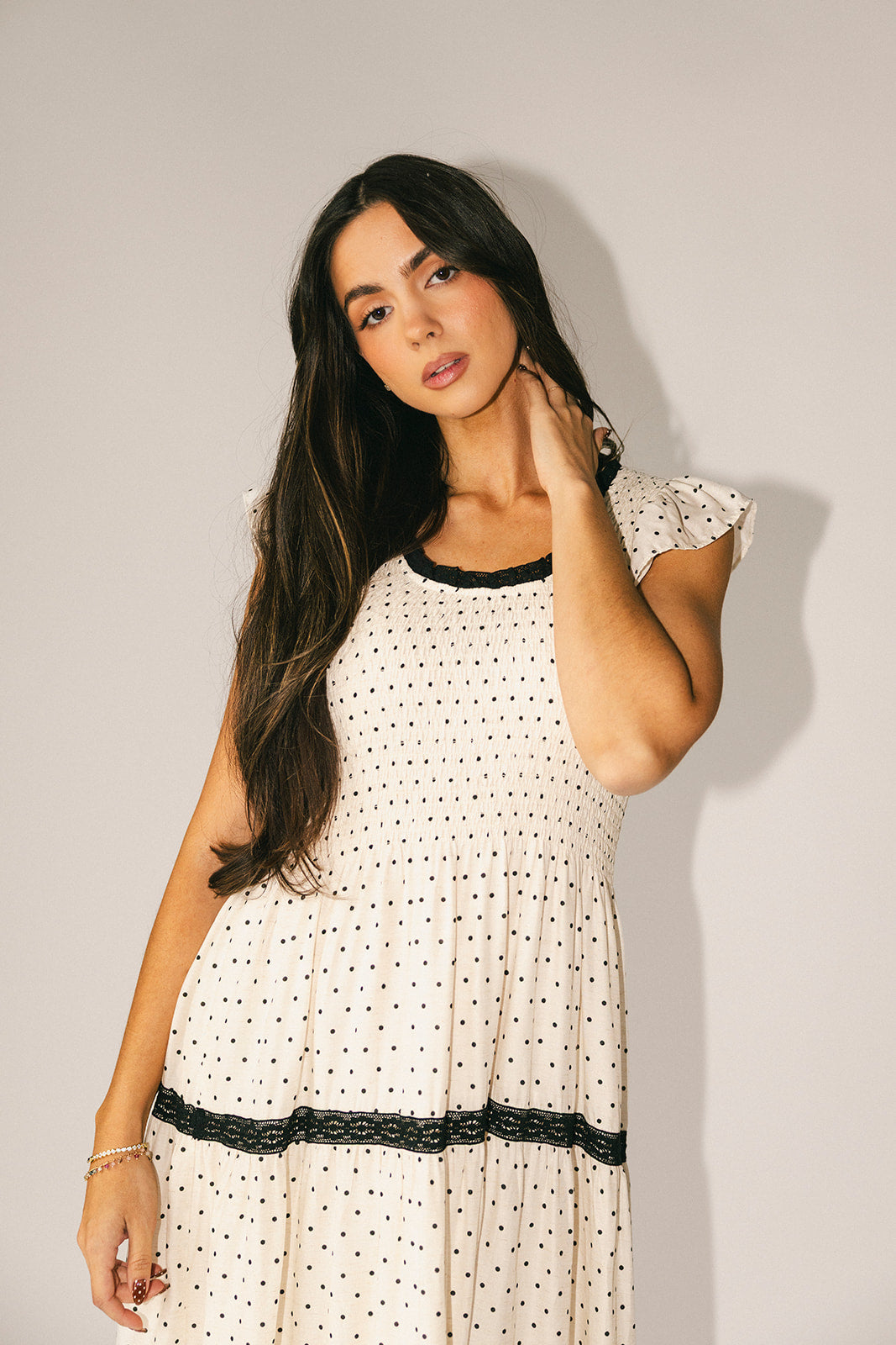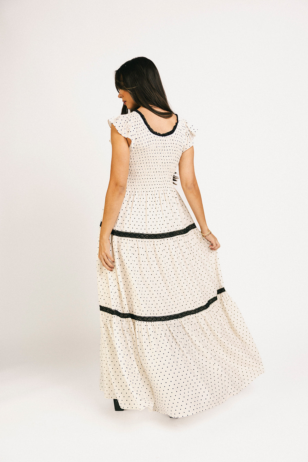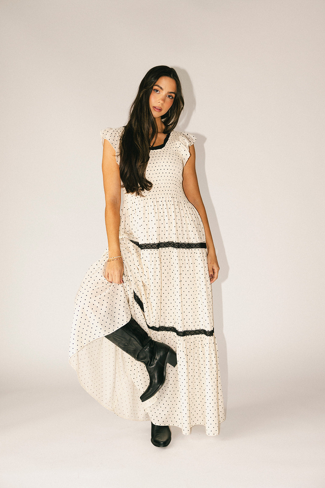 Söt och romantisk – denna maxiklänning med utsvängda ärmar och prickiga kanter tar dig med från brunchdejter till kvällsfester. Med sitt tidlösa mönster och vintageinspirerade silhuett är det den perfekta klänningen för familjefoton, babyshowers och mycket mer.