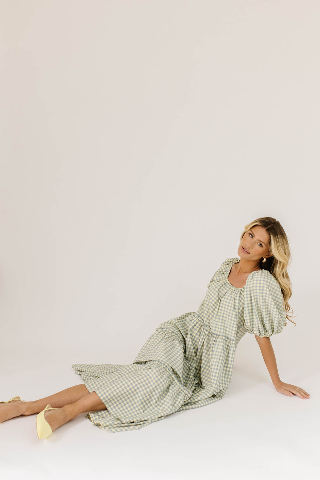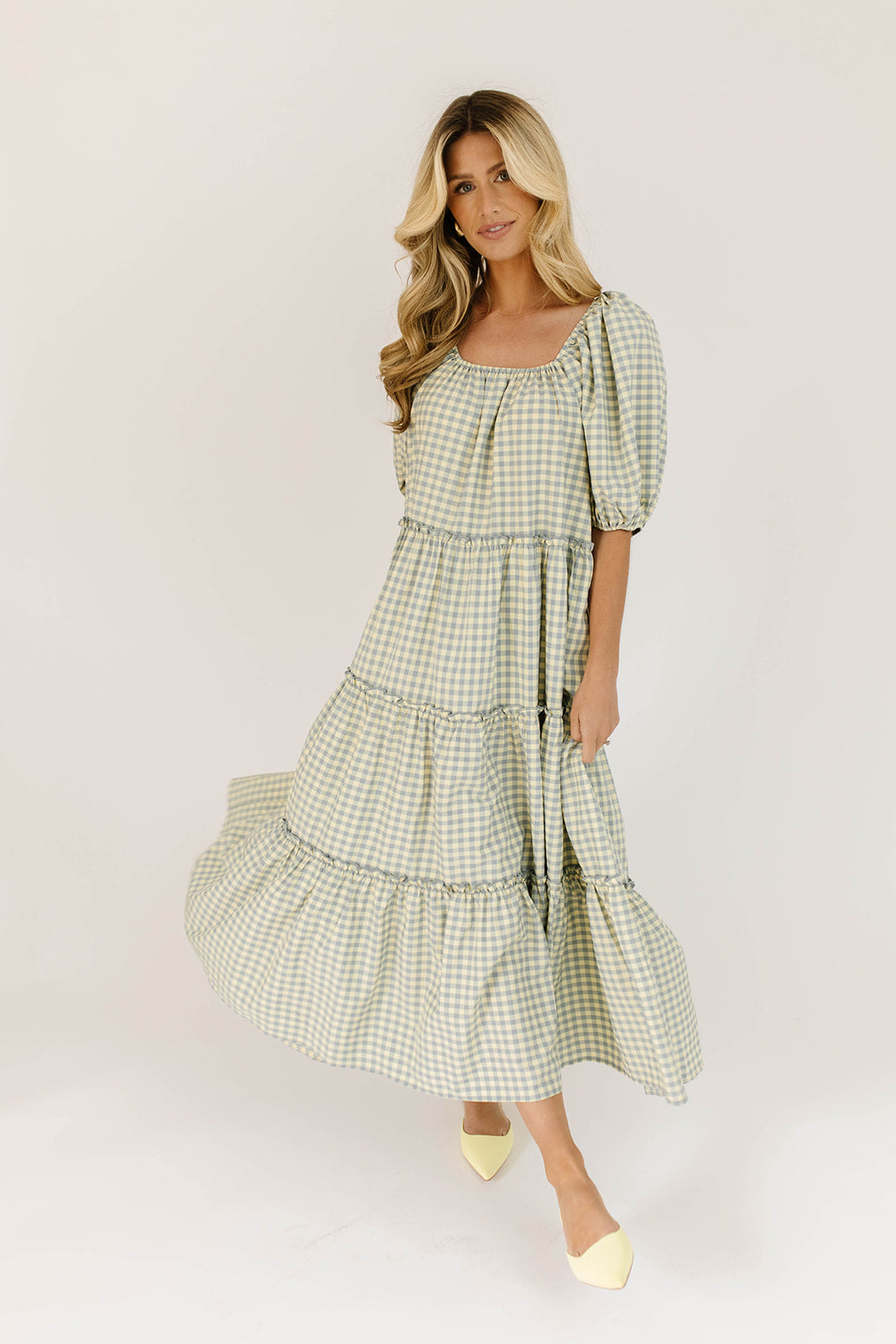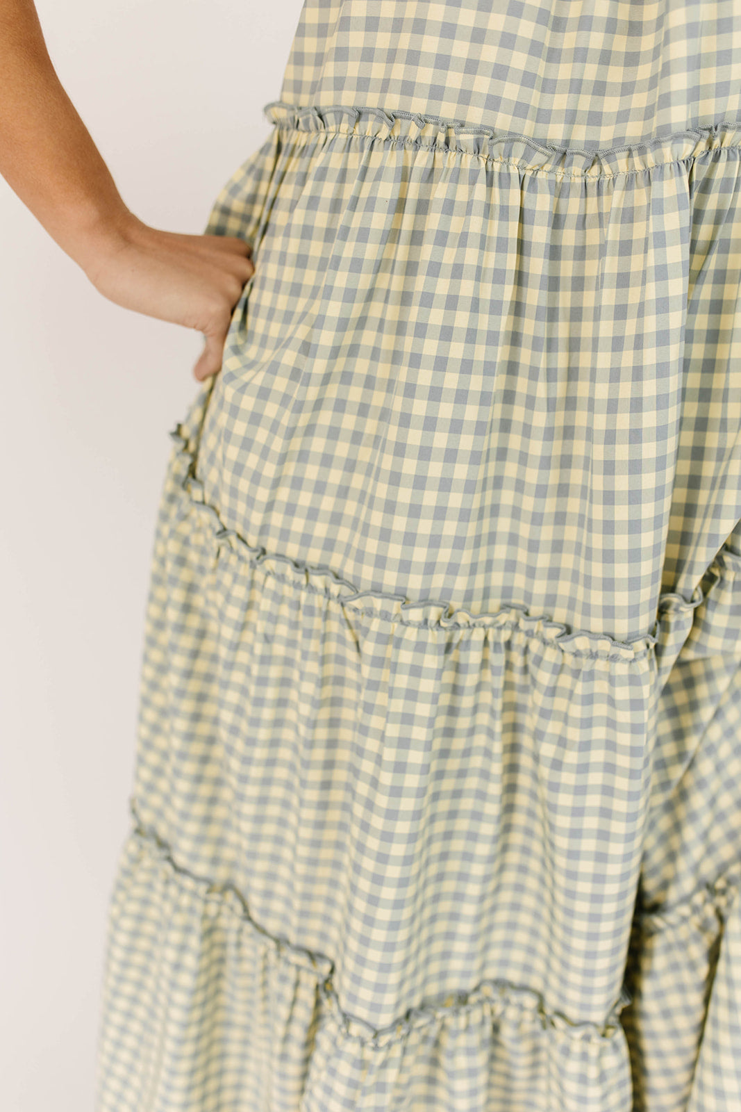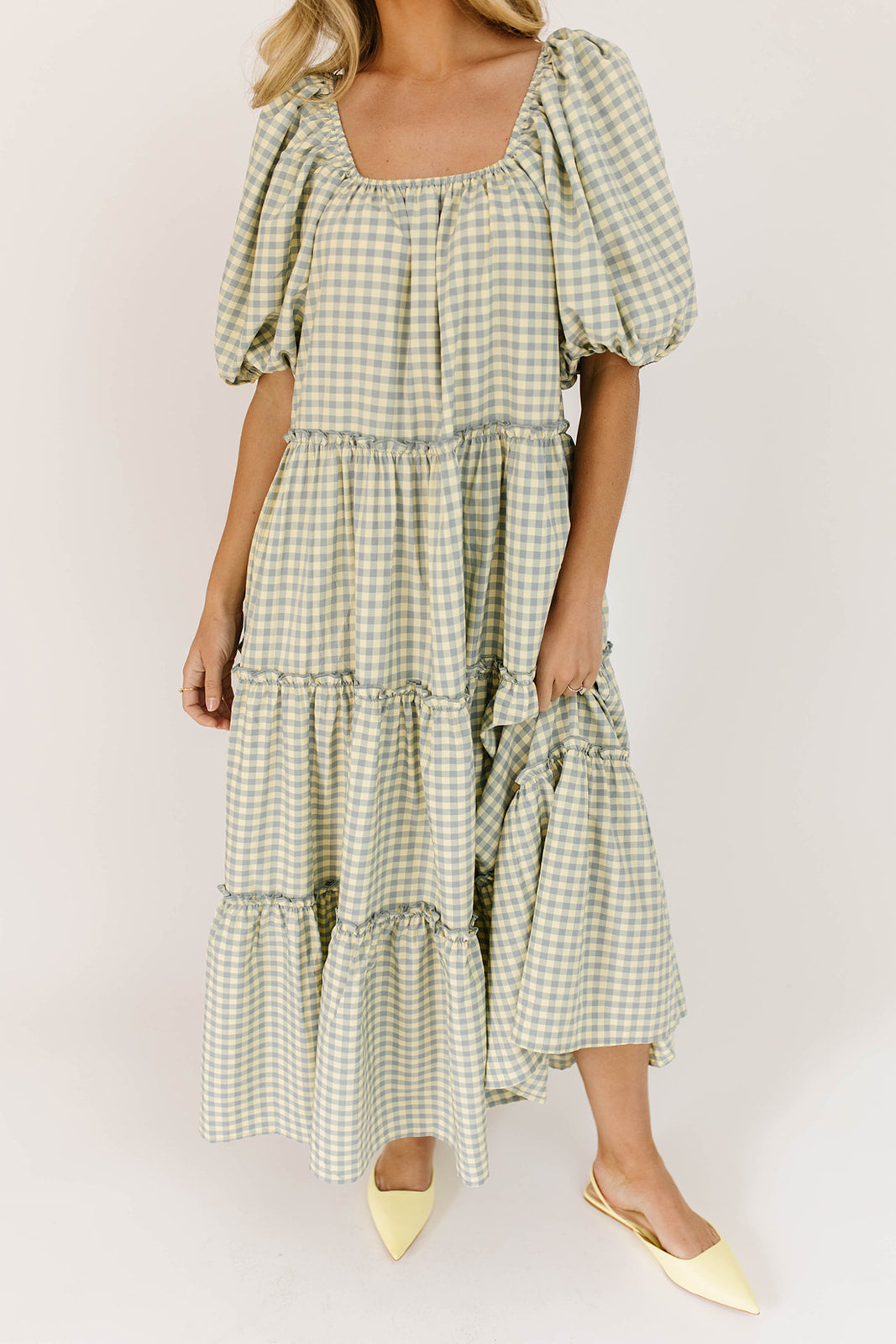 • blå + gul gingham // maxilängd, puffärm, skiktad kjol, elastisk rund halsringning