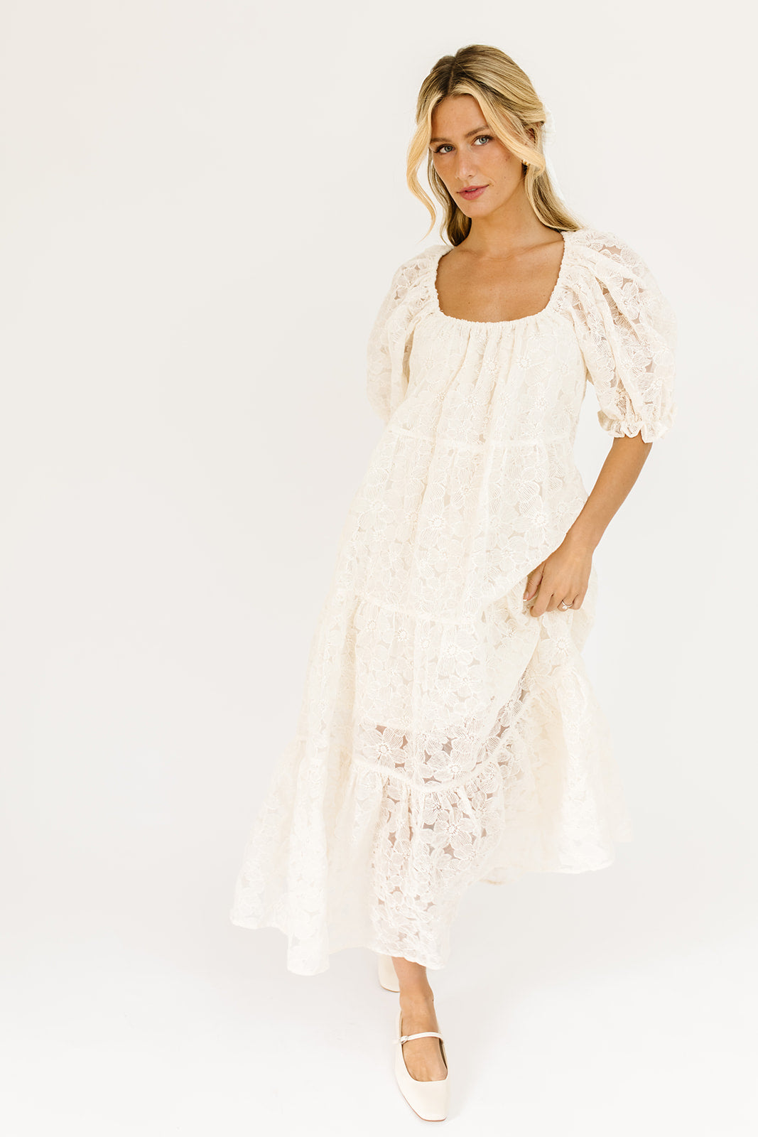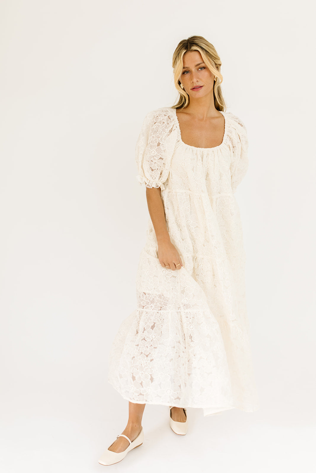 En krämfärgad maxiklänning med puffärmar som är böljande, flörtig och fantastisk. Den perfekta maxiklänningen för alla tillfällen, den har en avslappnad silhuett + spetsiga puffärmar + en stretchig rund halsringning. Du kan klä upp den med klackar för dejtkvällar + middagsbjudningar, eller med sneakers för avslappnade tillfällen + helgärenden.