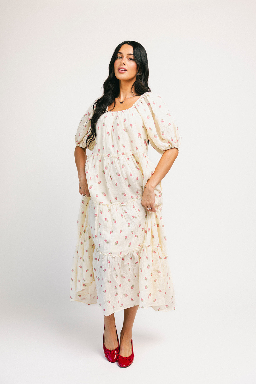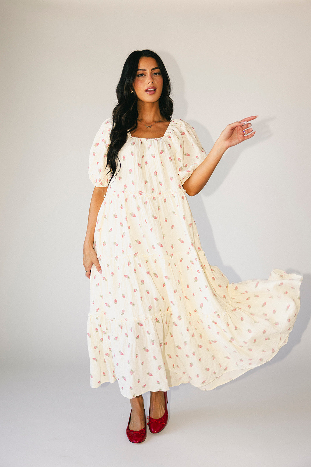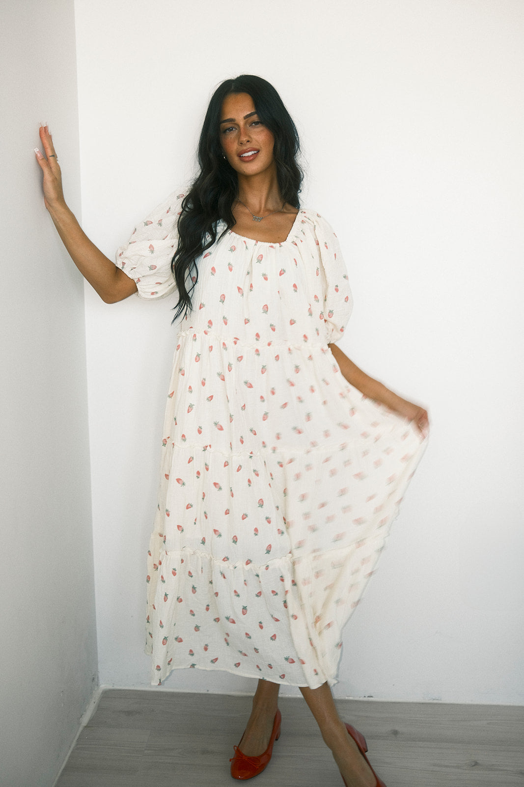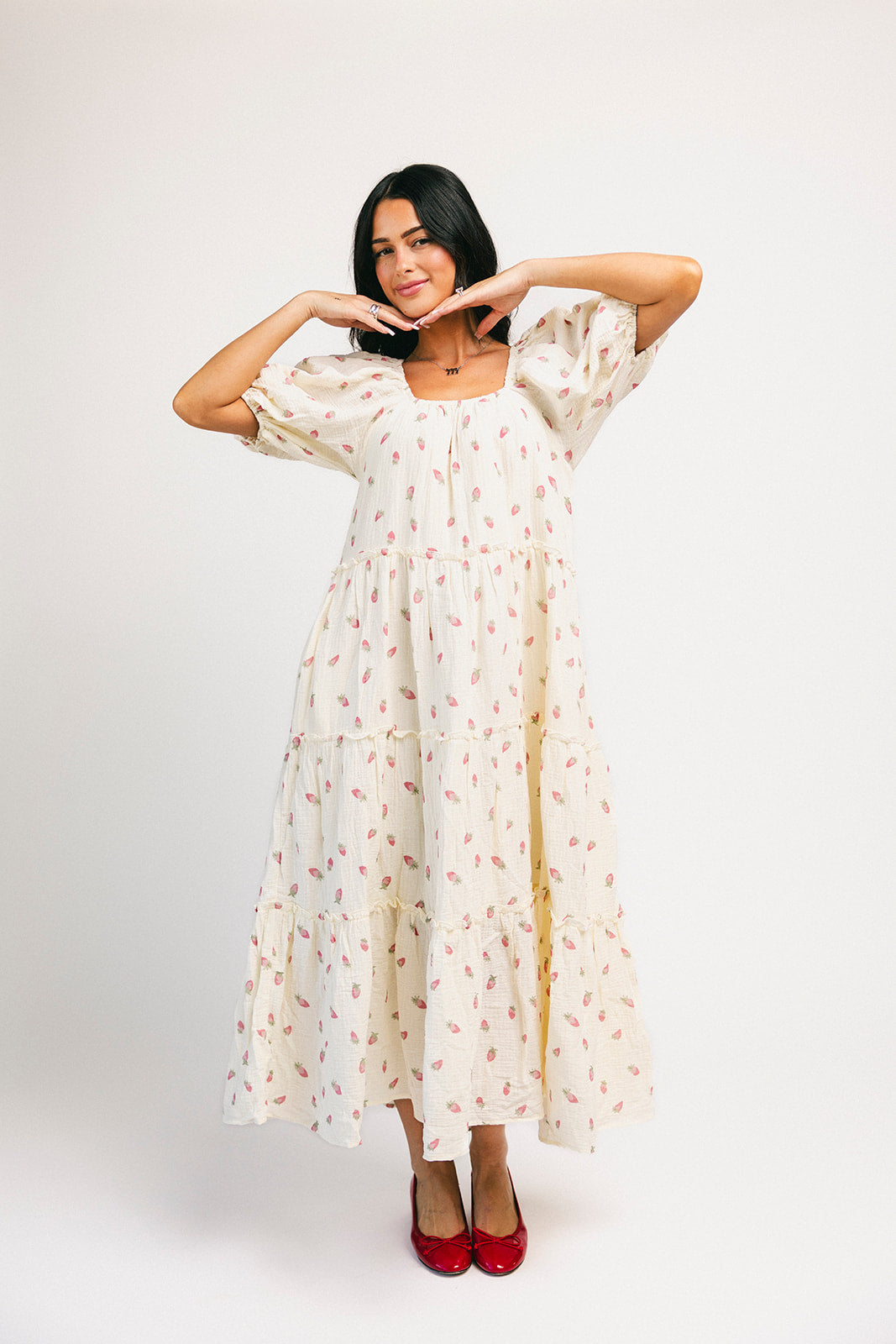 Från familjebilder till helgärenden, vår exklusiva Zoco Daymaker är den bästa "inte så enkla" klänningen. Med ett sött jordgubbstryckt mönster är denna maxiklänning med puffärmar gjord för varje säsong, situation och tillfälle.