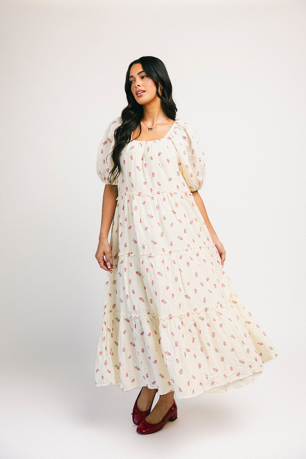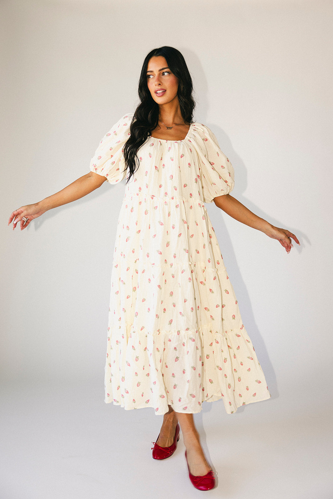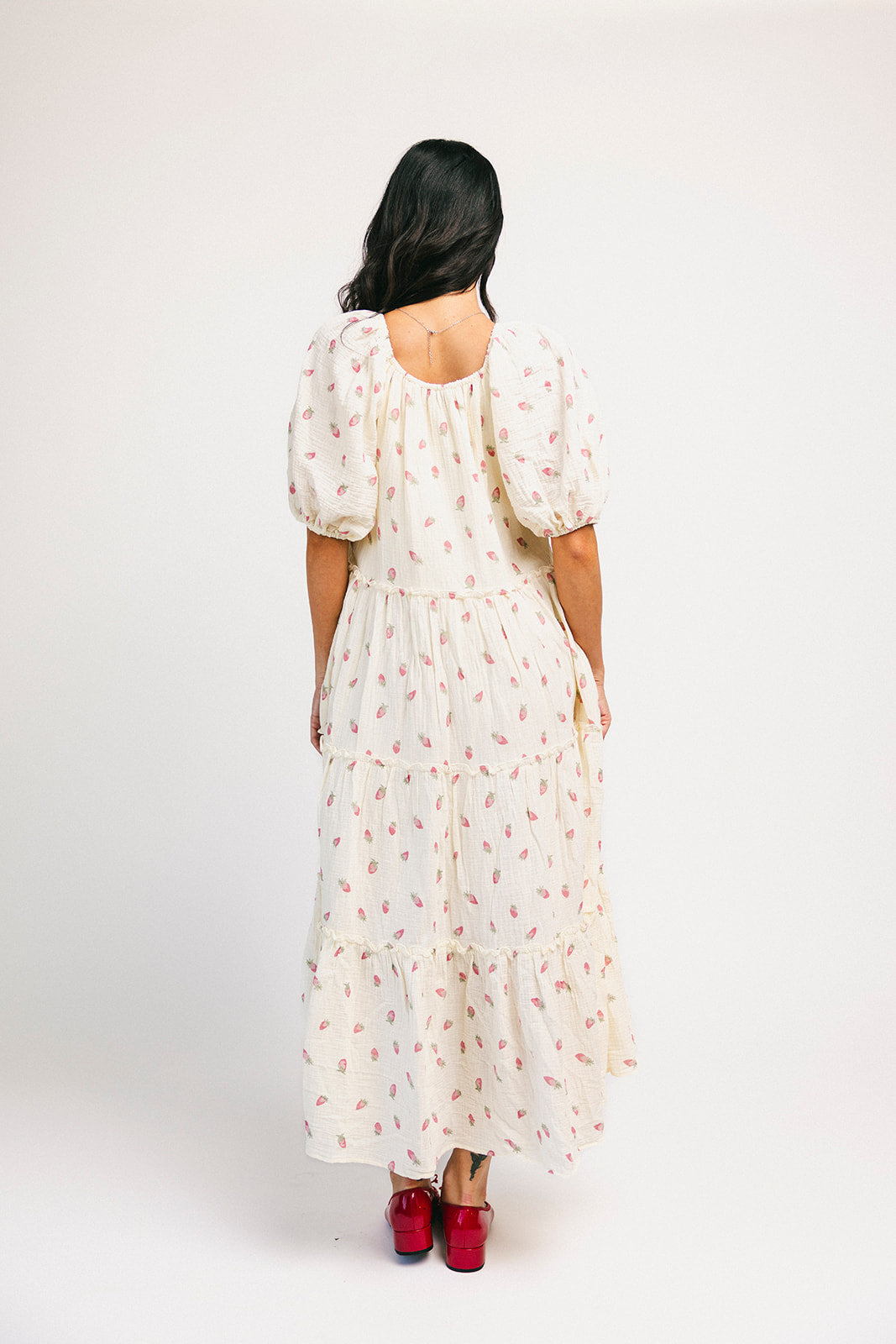 Från familjebilder till helgärenden, vår exklusiva Zoco Daymaker är den bästa "inte så enkla" klänningen. Med ett sött jordgubbstryckt mönster är denna maxiklänning med puffärmar gjord för varje säsong, situation och tillfälle.