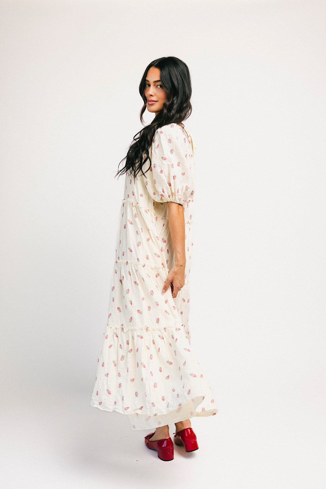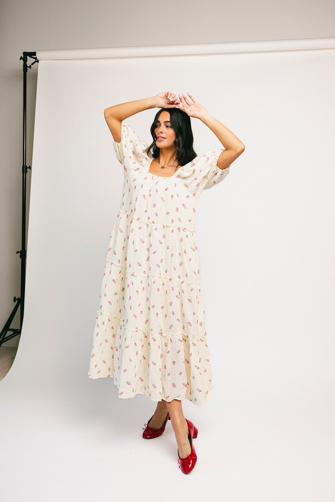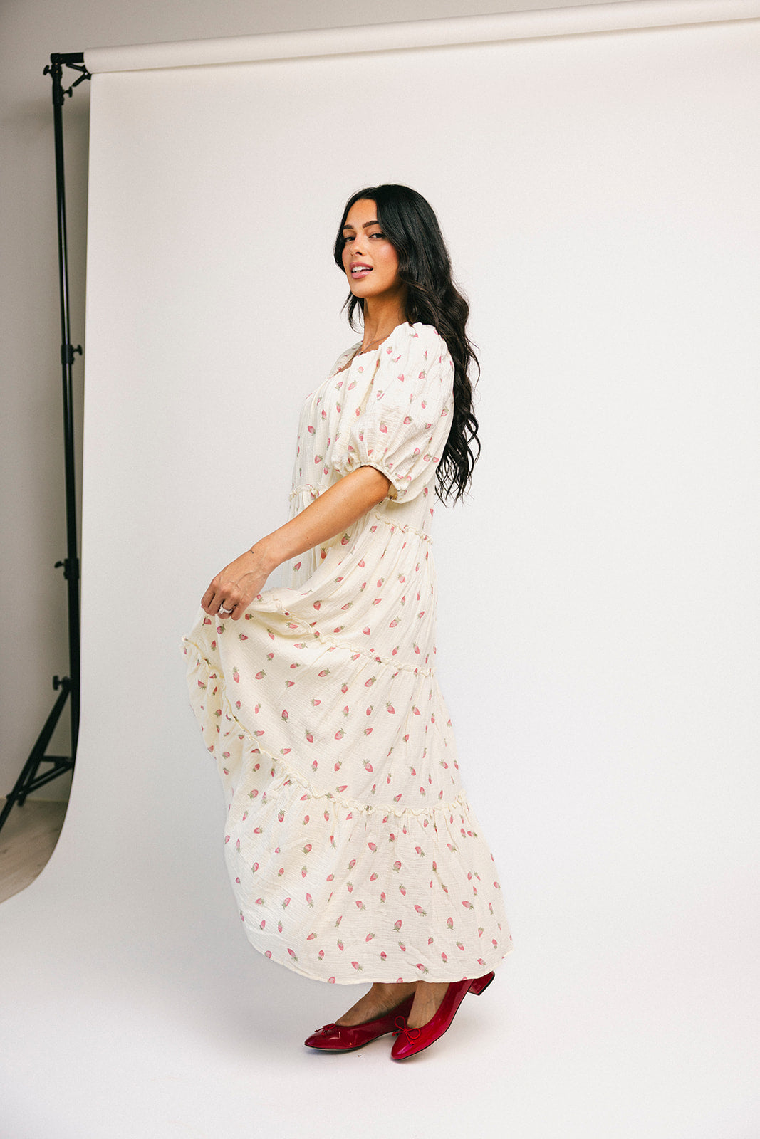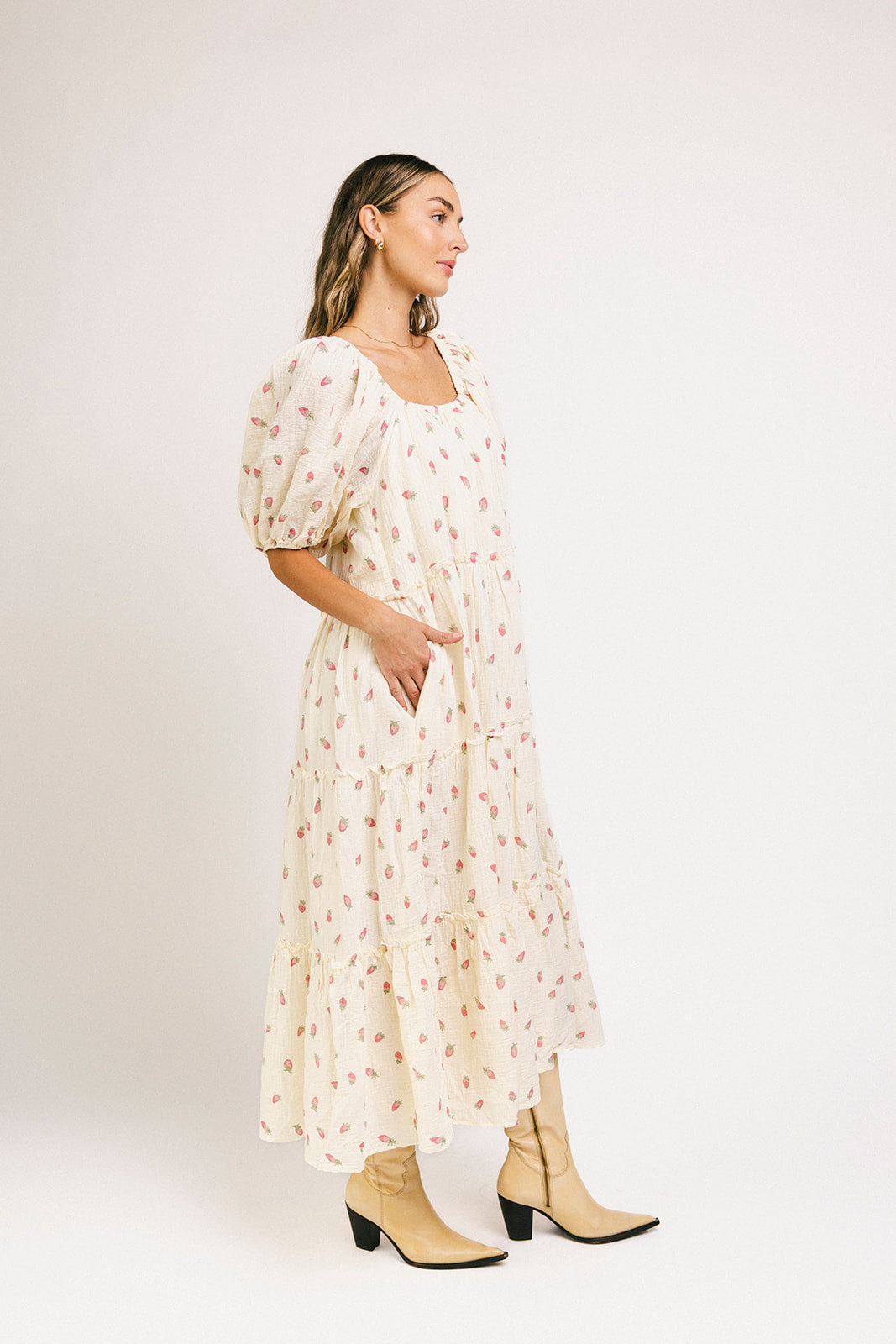 Från familjebilder till helgärenden, vår exklusiva Zoco Daymaker är den bästa "inte så enkla" klänningen. Med ett sött jordgubbstryckt mönster är denna maxiklänning med puffärmar gjord för varje säsong, situation och tillfälle.