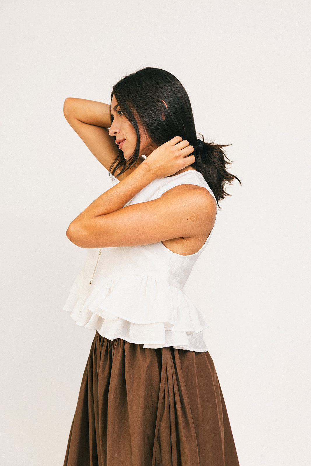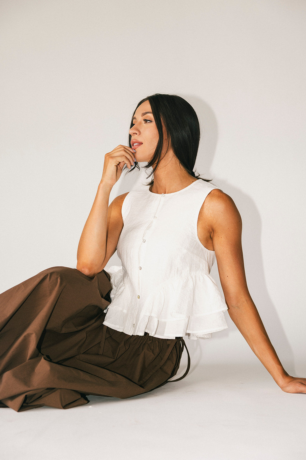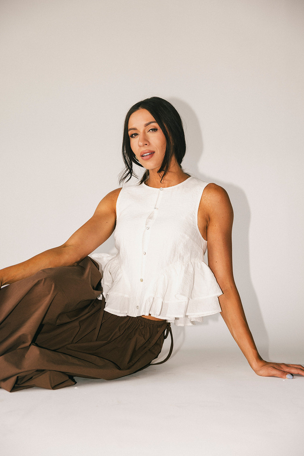 Förhöj direkt vilken outfit som helst med detta vita volanglinne. En vardagstopp med lite extra, den har en luftig silhuett + en skiktad volangkant i nederkanten. Vi älskar att matcha den med jeans + sneakers, eller klä upp den med en maxikjol + ballerinaskor.