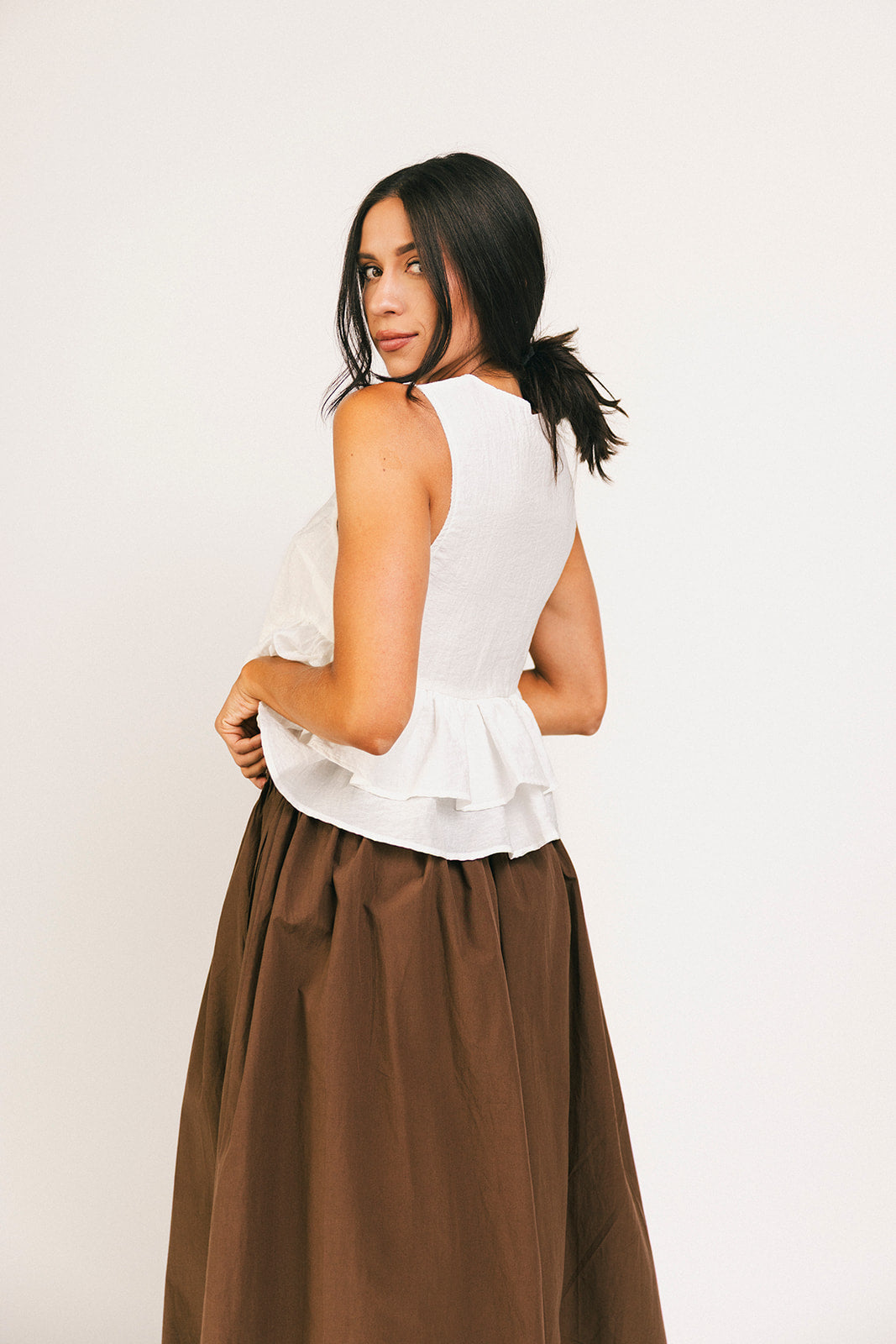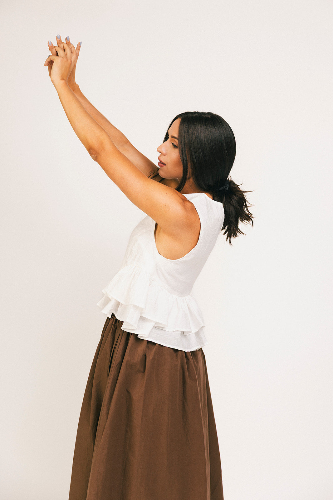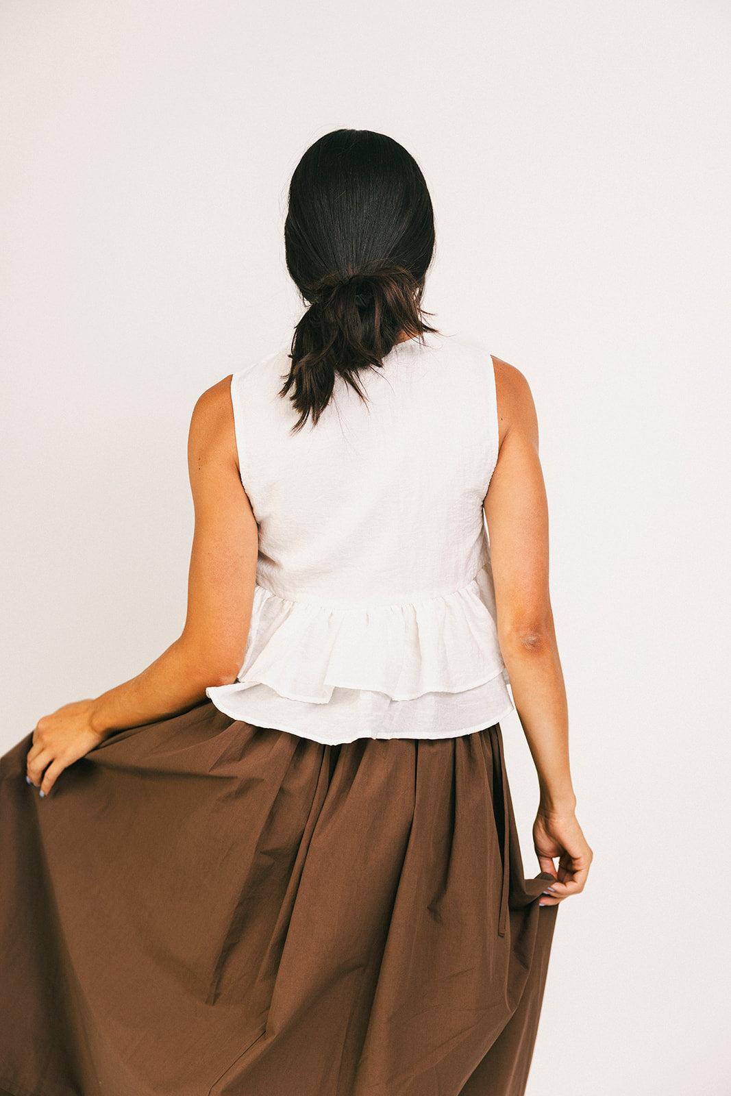 Förhöj direkt vilken outfit som helst med detta vita volanglinne. En vardagstopp med lite extra, den har en luftig silhuett + en skiktad volangkant i nederkanten. Vi älskar att matcha den med jeans + sneakers, eller klä upp den med en maxikjol + ballerinaskor.
