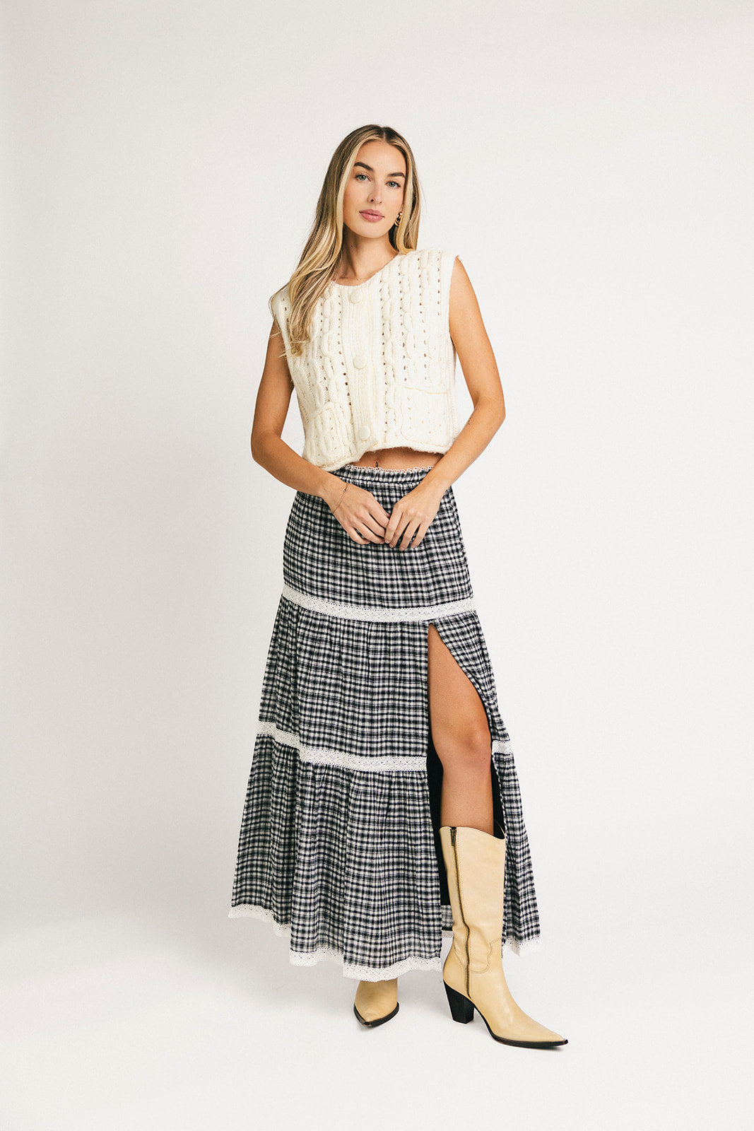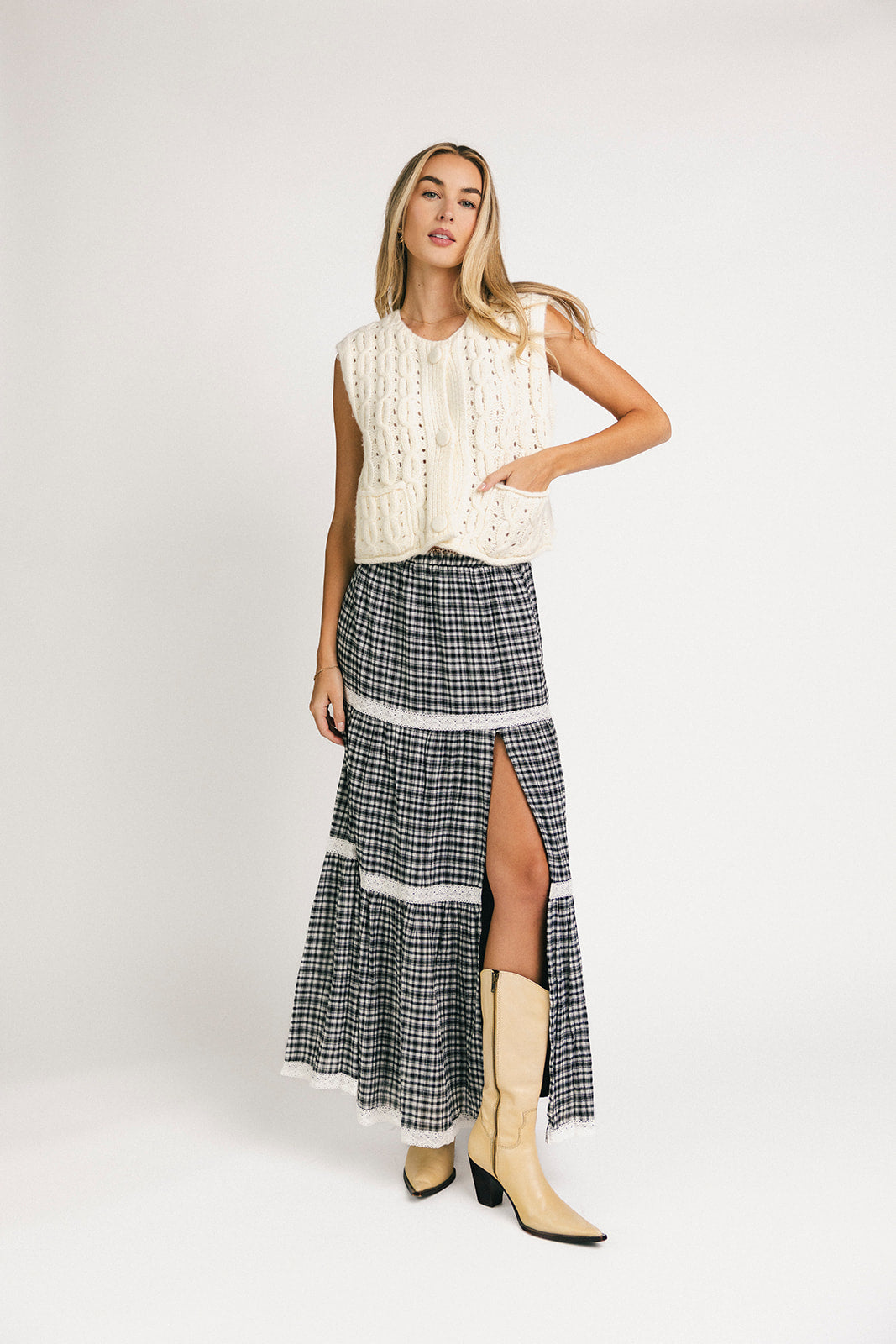 En grovstickad väst med supersöta detaljer. Den har en löst knäppt silhuett + en rå, rullad fåll. Med sin lätt beskurna passform + vintageinspirerade design passar denna kabelstickade väst bra till allt från kjolar till jeans.