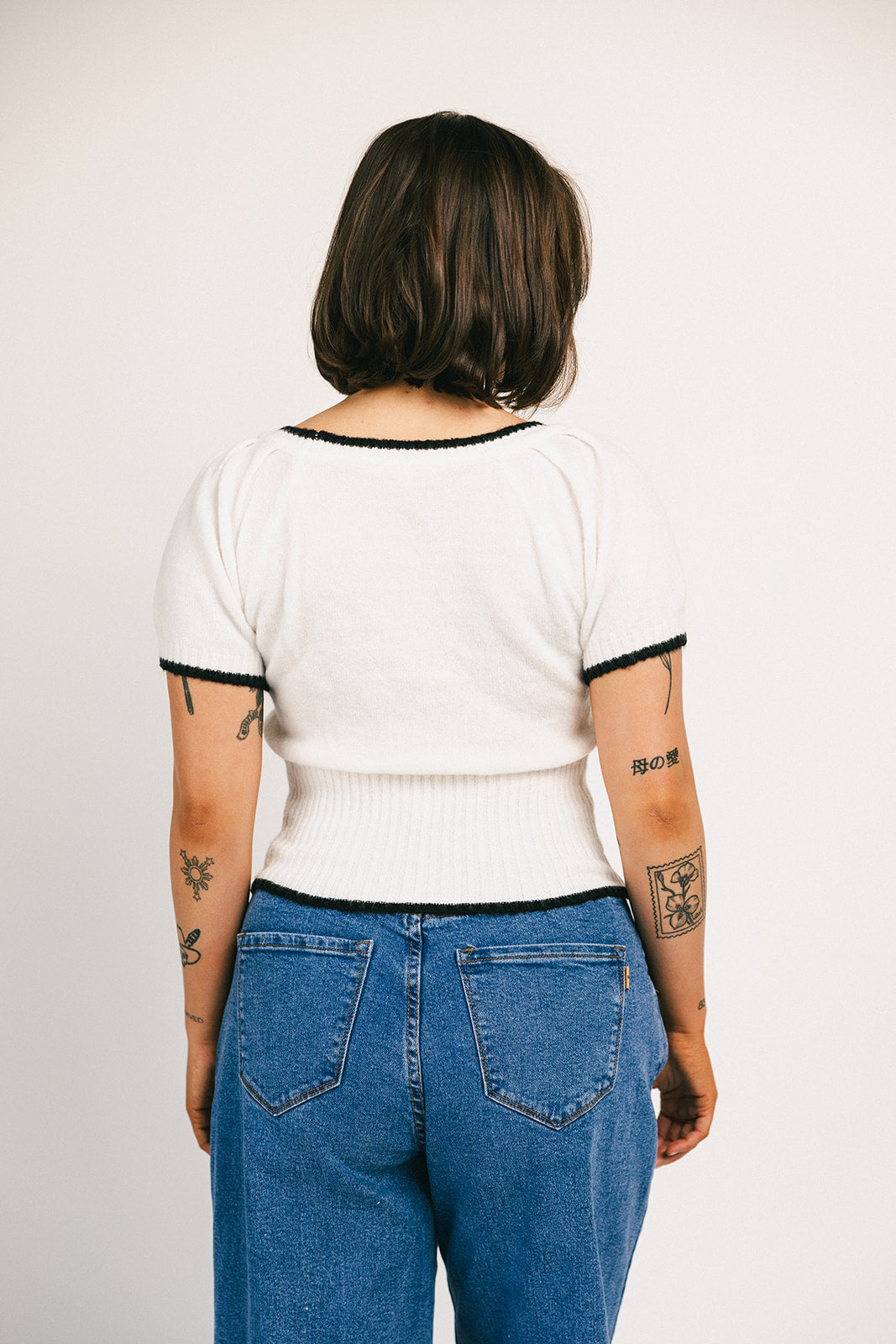 • vit // rund halsringning, puffärmar, ribbstickad mudd i midja, halsringning och ärmslut, svarta detaljer vid halsringning, fåll och ärmslut
