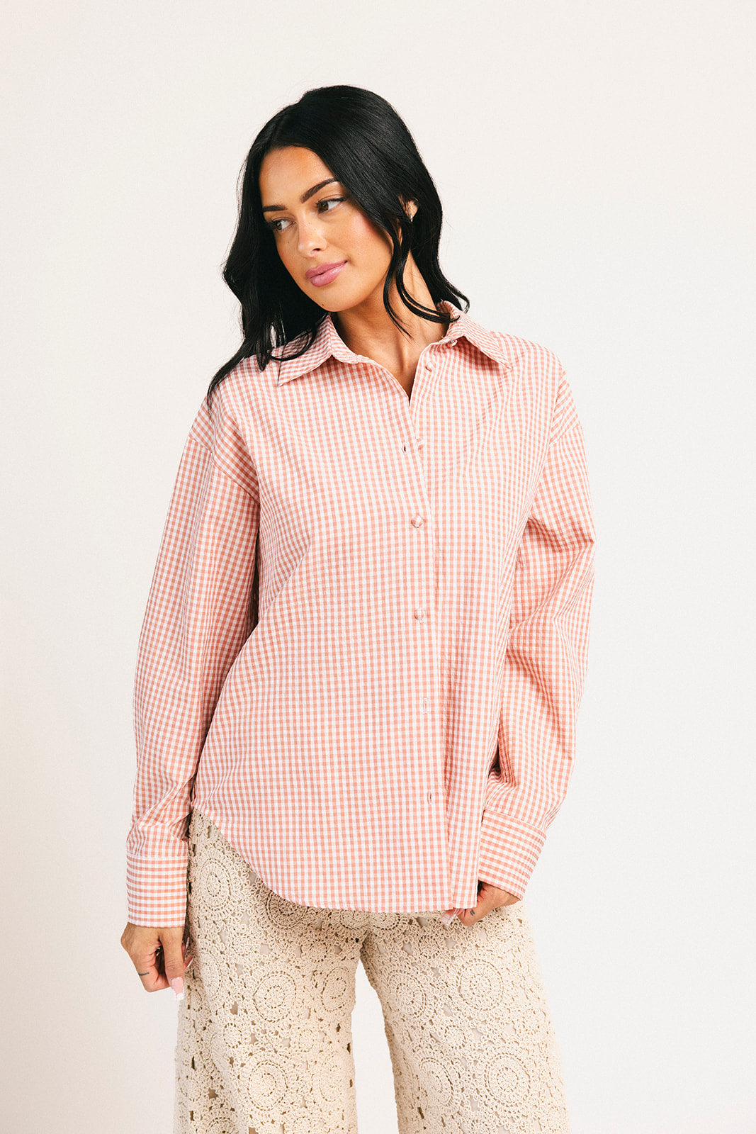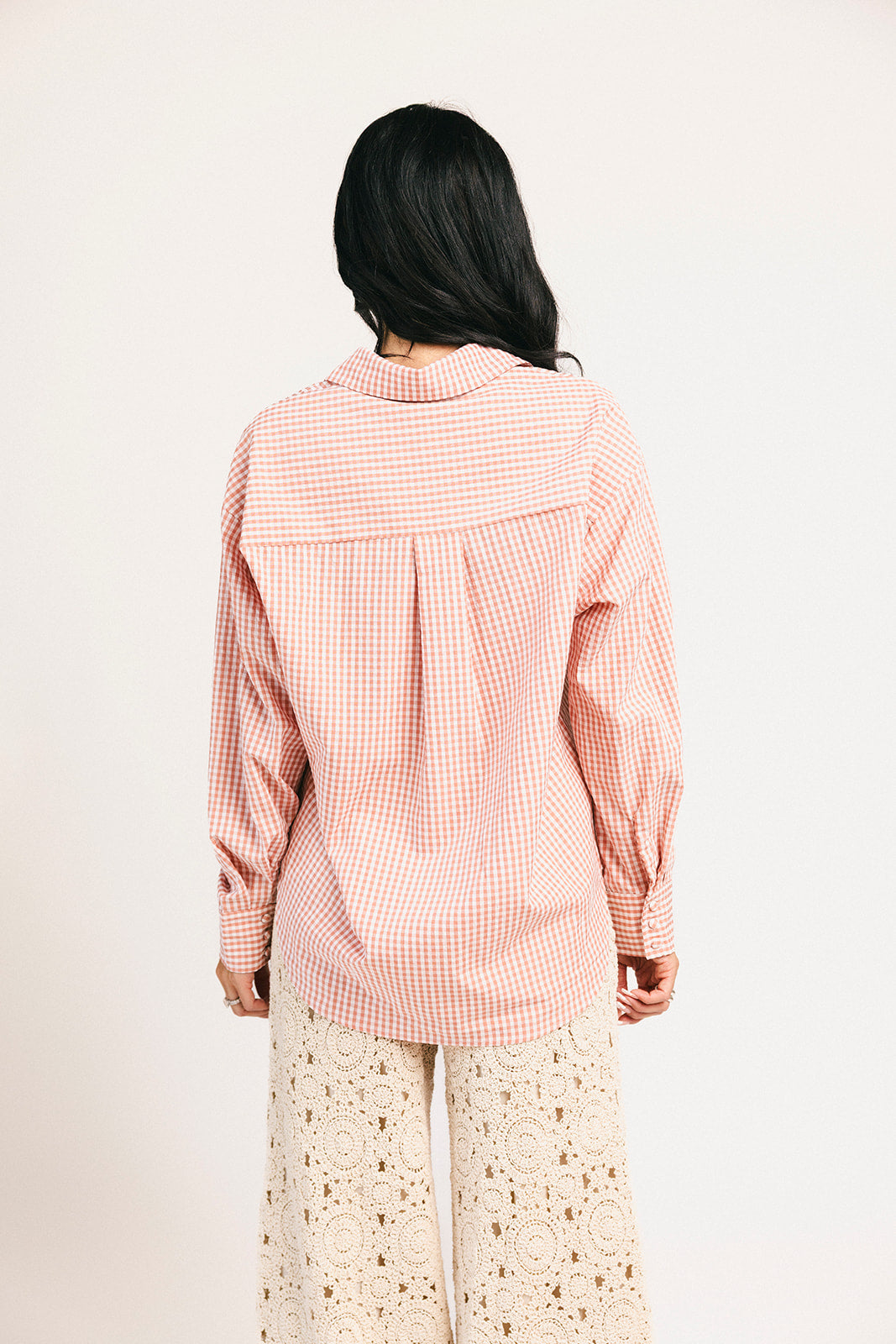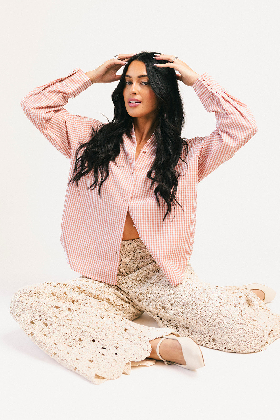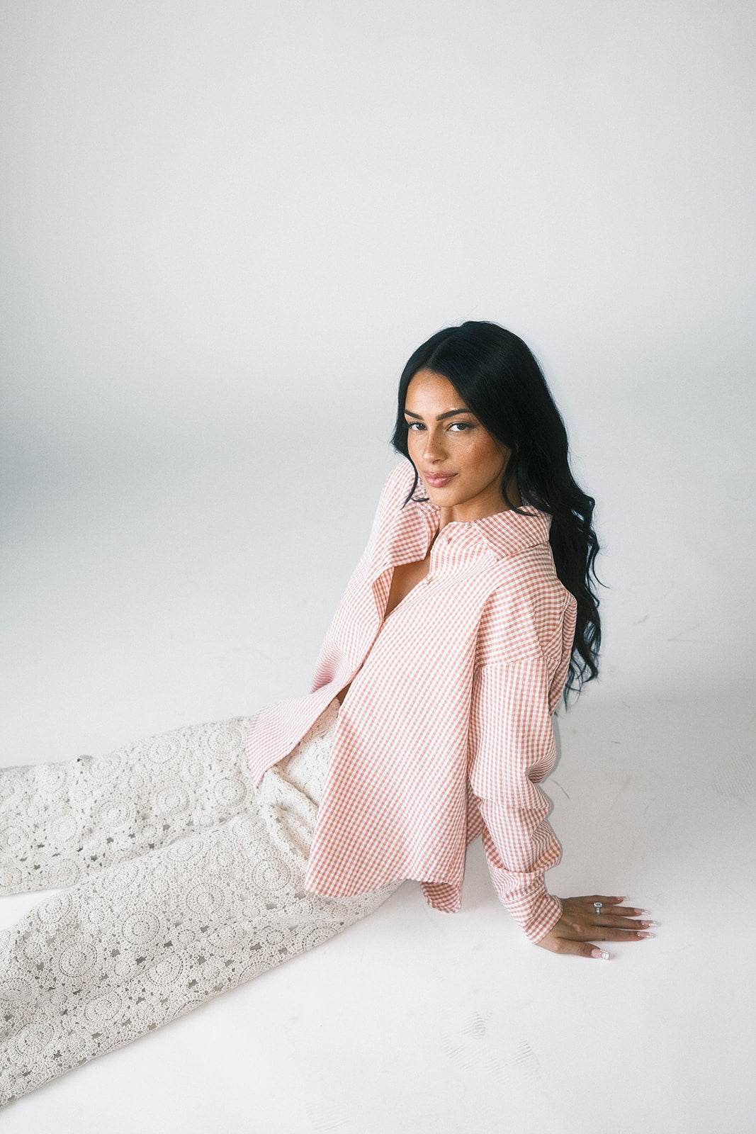 Full av vintage-vibbar är denna rosa skjorta med knäppning i gingham-mönster ett must för hela säsongen. Den har en lätt boxig passform med rundad fåll och eleganta nedsänkta axlar. Oavsett om du bär den med knäppning och en tröja + jeans eller över ett linne + shorts, är det ett enkelt plagg du kan styla året runt.