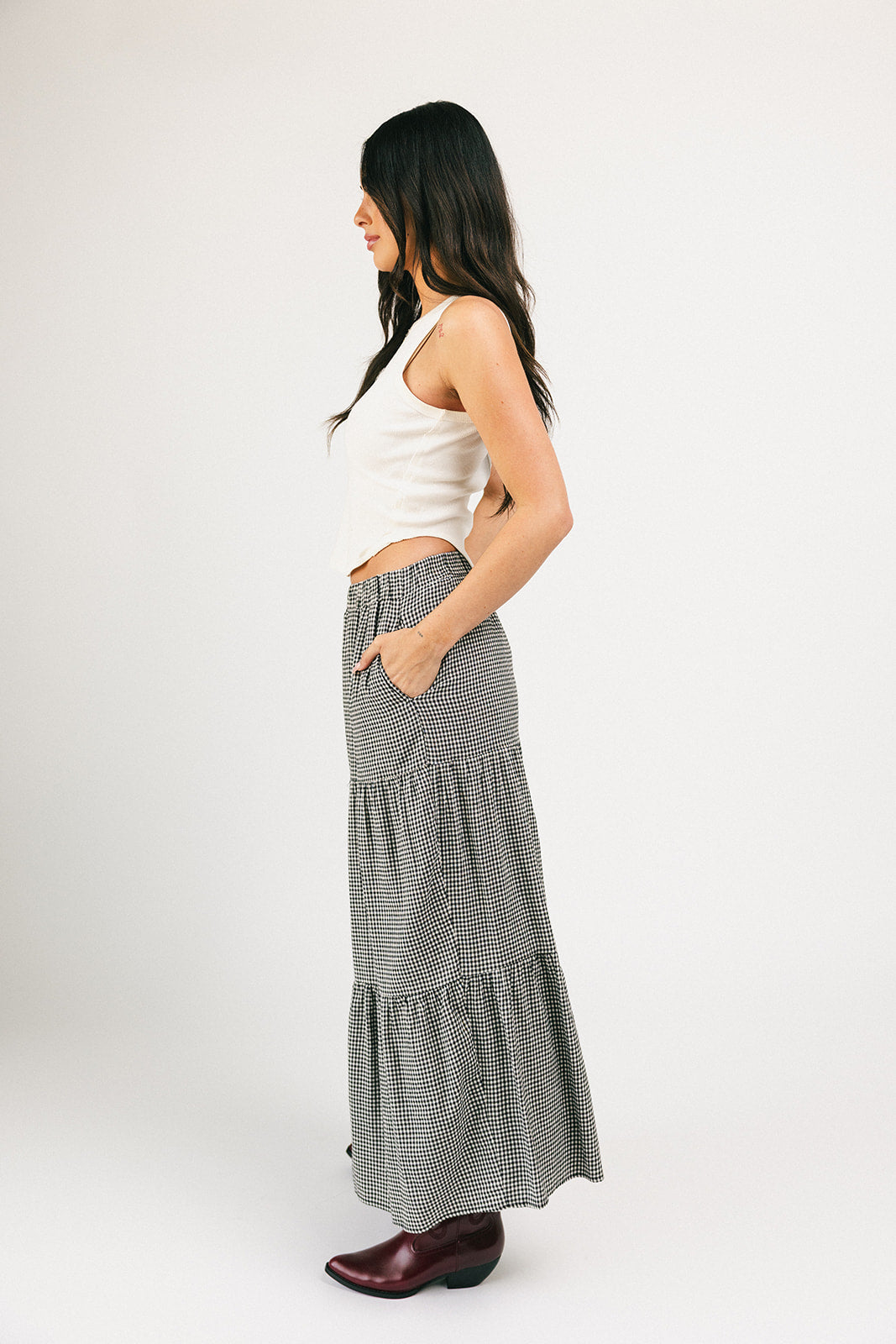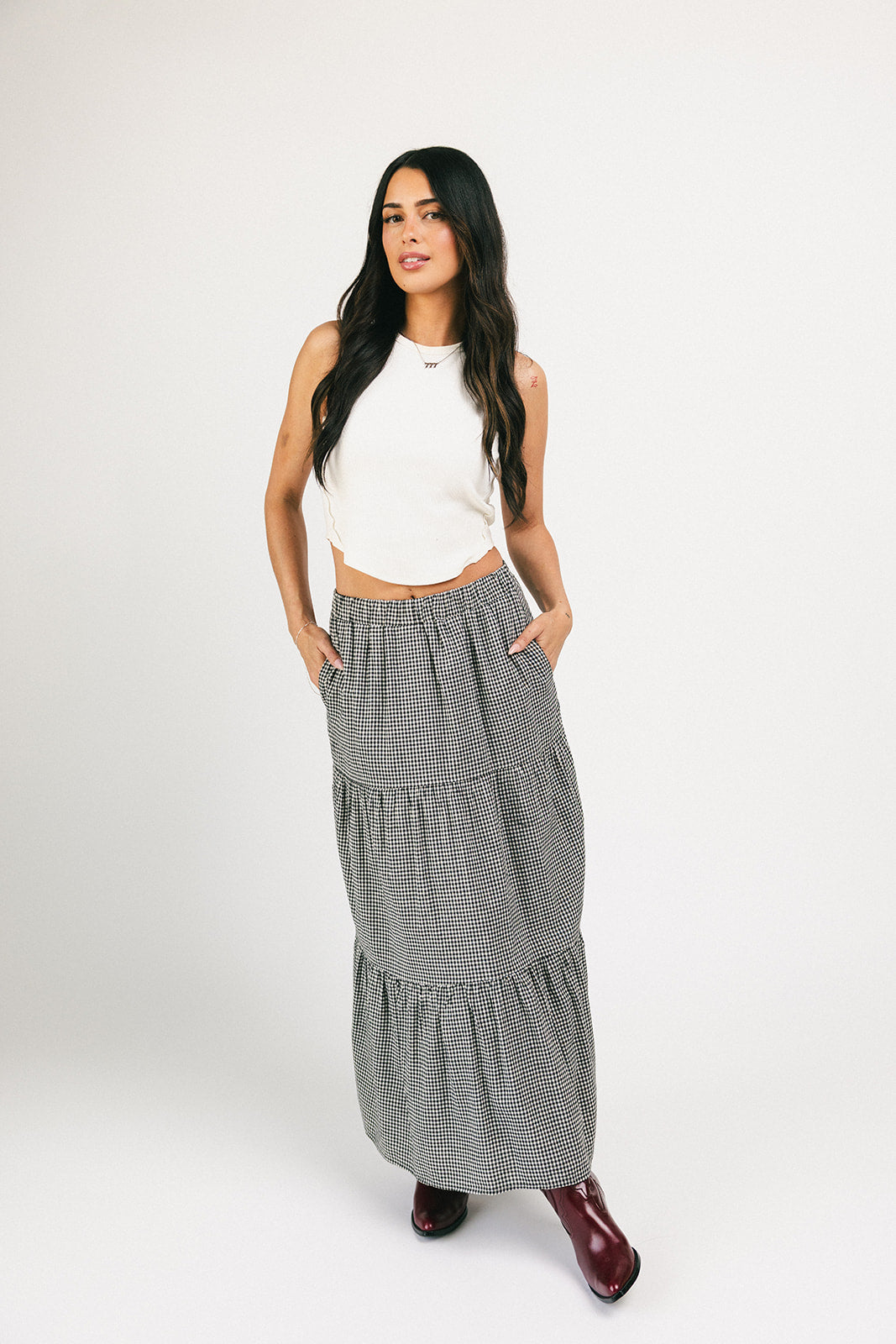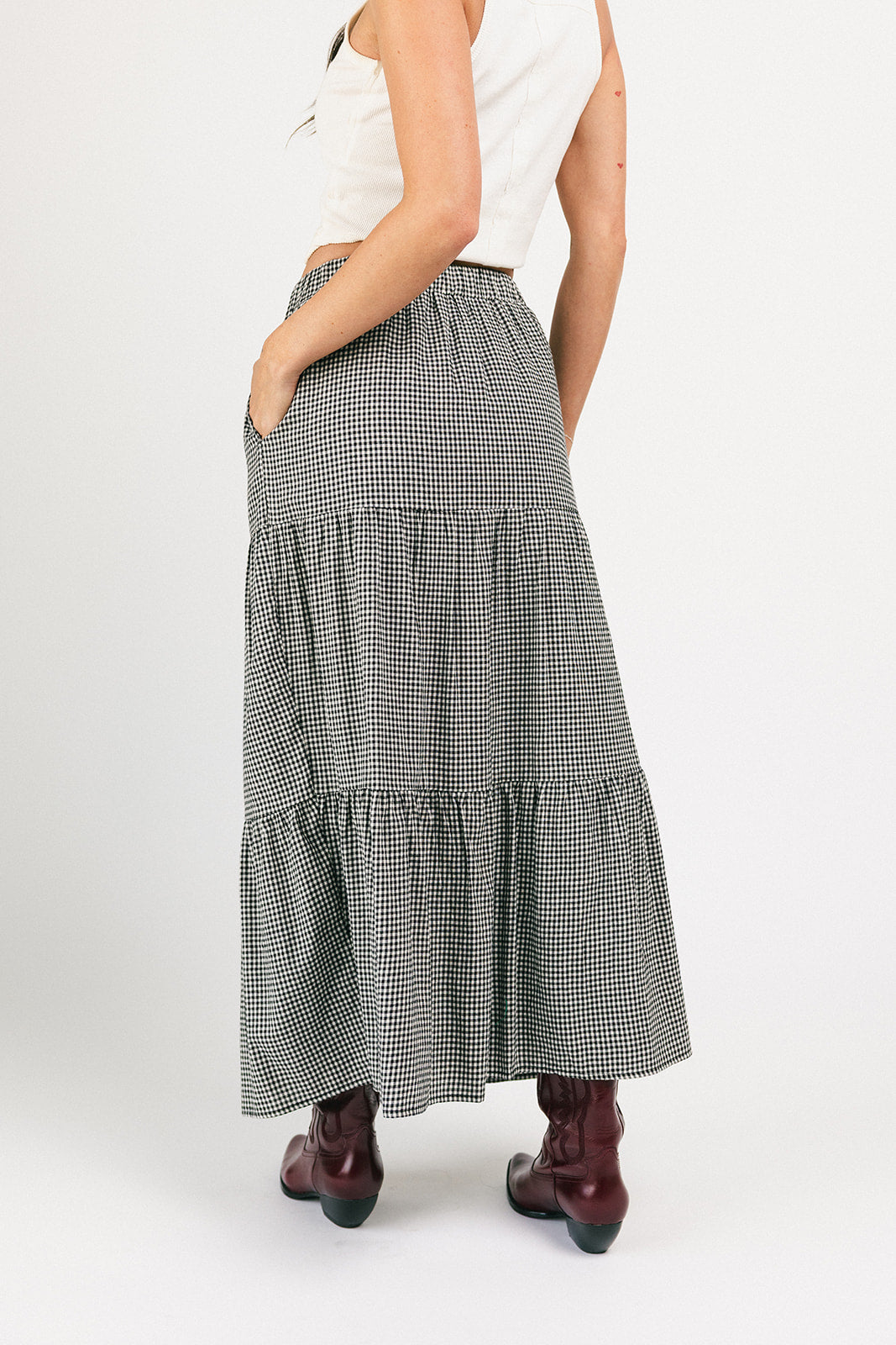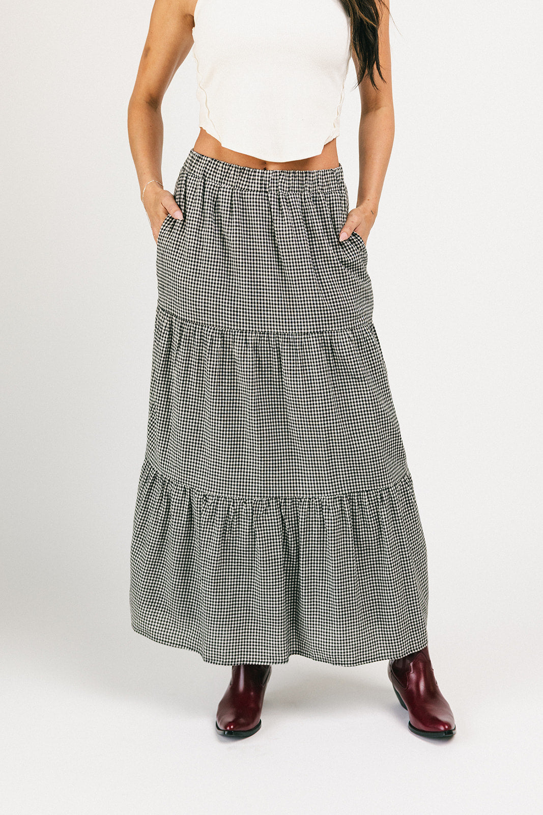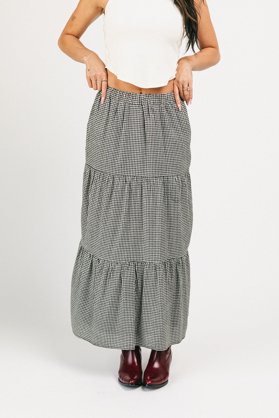Denna gingham-maxikjol har en elegant, skiktad silhuett och en bekväm resår i midjan. En tidlös must-have, den typen av kjol som kompletterar vilken outfit som helst och ser riktigt bra ut när du gör det. Klä upp den med en blus och stövlar, eller avslappnad med ett linne och sneakers.