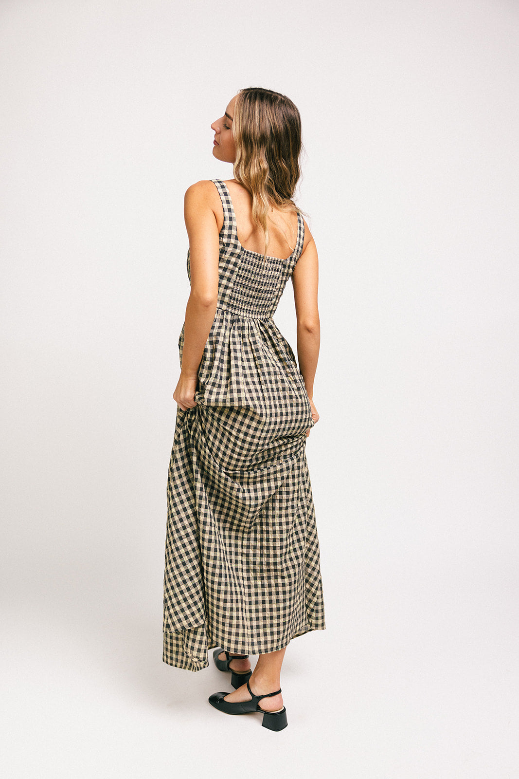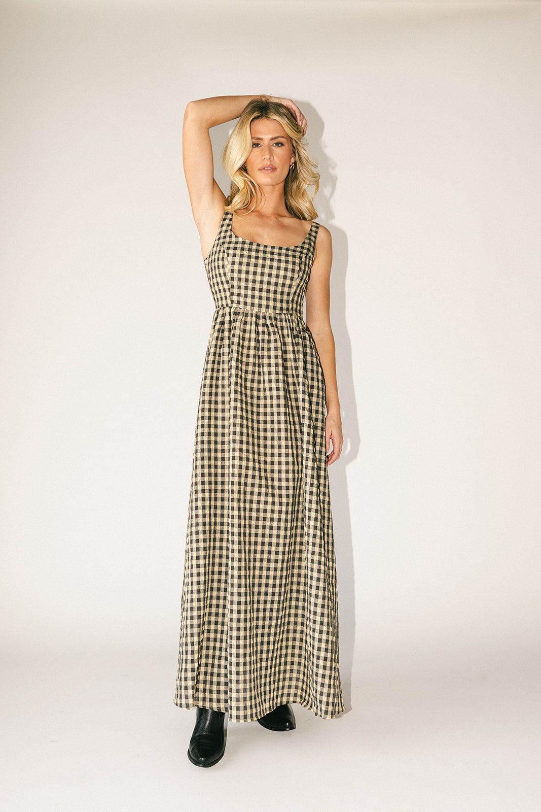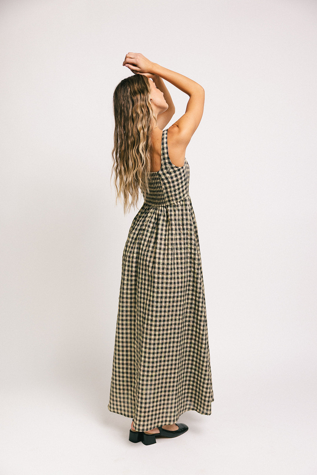 • naturrutig // maxilängd, fyrkantig halsringning, smockad ryggpanel, dragkedja i sidan, fodrad livstycke, sömmar i livstycket