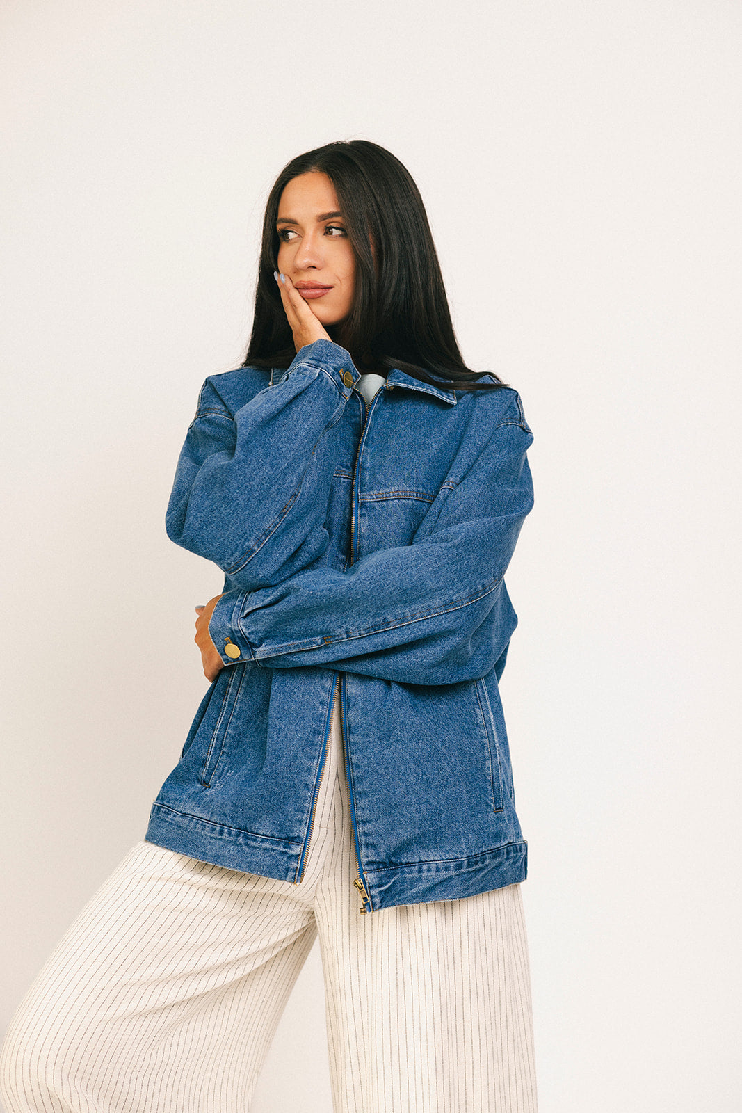 • denim // krage, arbetsfickor, dragkedja fram, nedsänkt axel, mudd, sliten passform