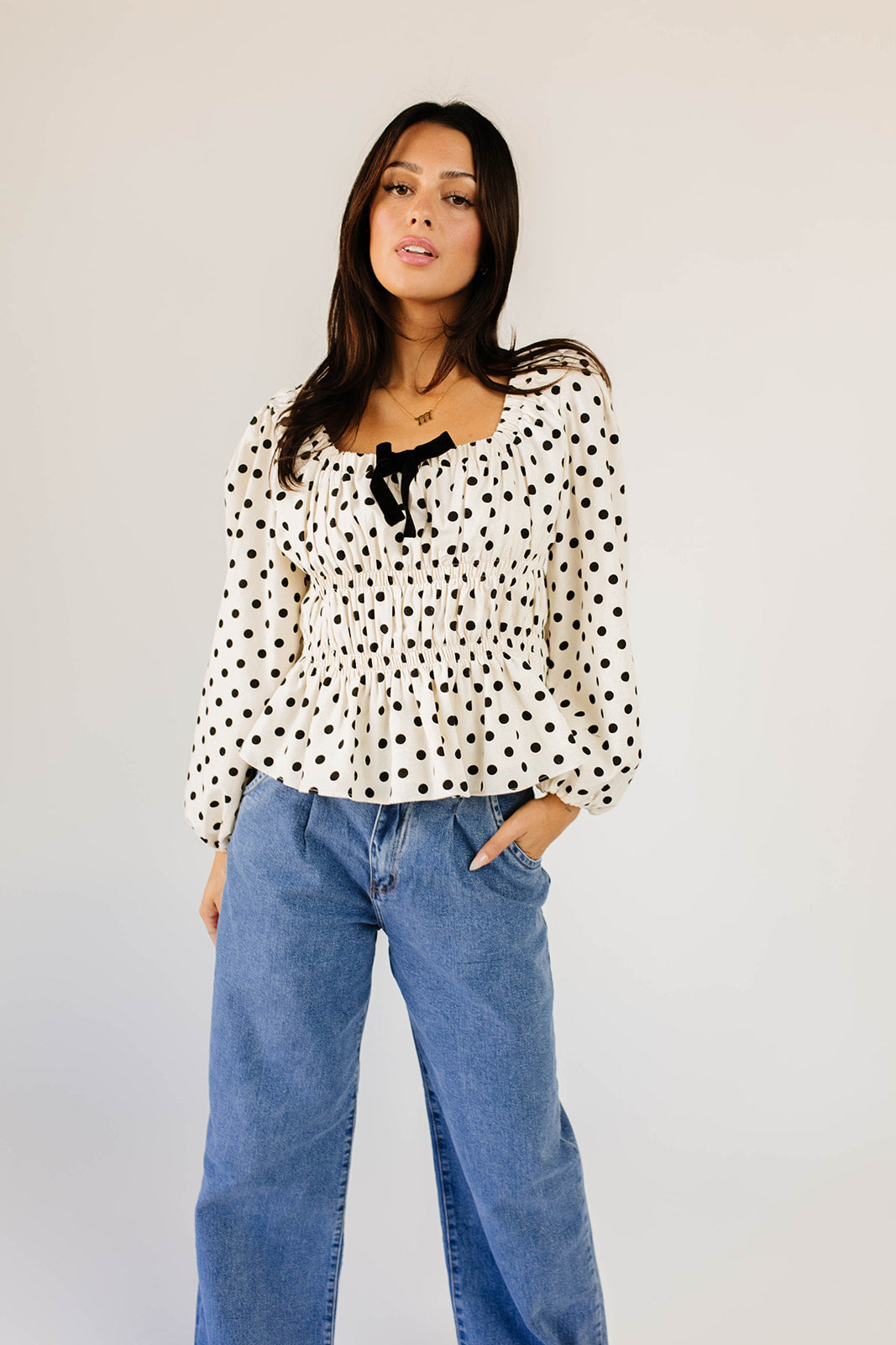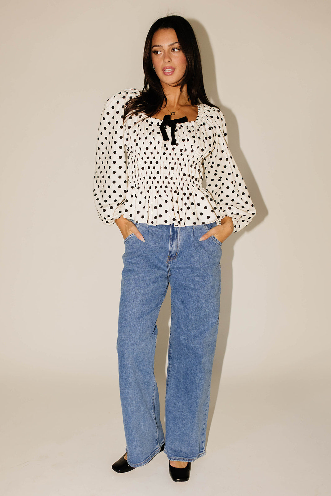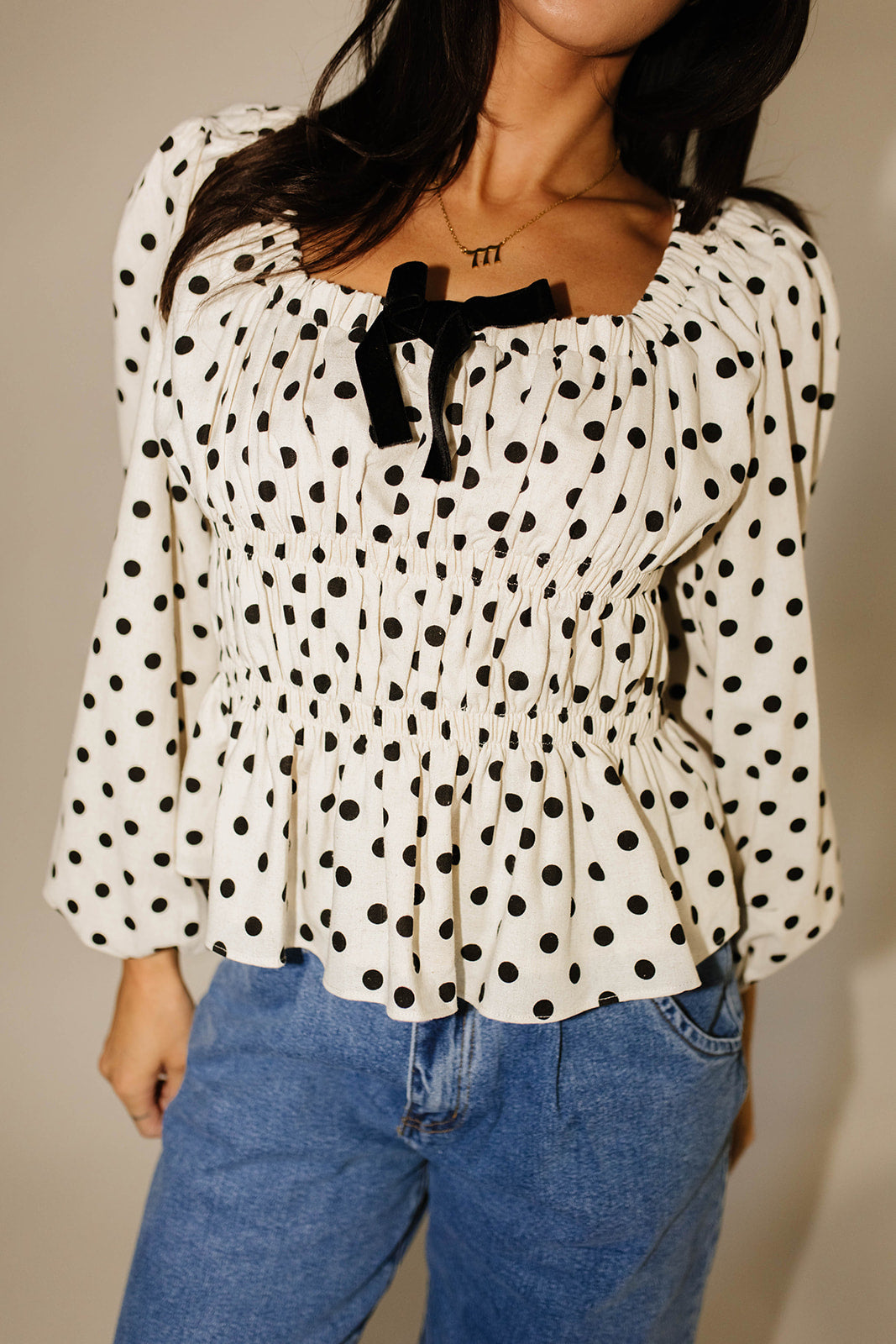Den perfekta kombinationen av sött och sofistikerat – denna prickiga långärmade topp är en tidlös klassiker. Med långa ballongärmar och en fin svart sammetsrosett är den det perfekta, eleganta basplagget för att klä upp sig för dejtkvällar eller avslappnade för avslappnade utflykter.