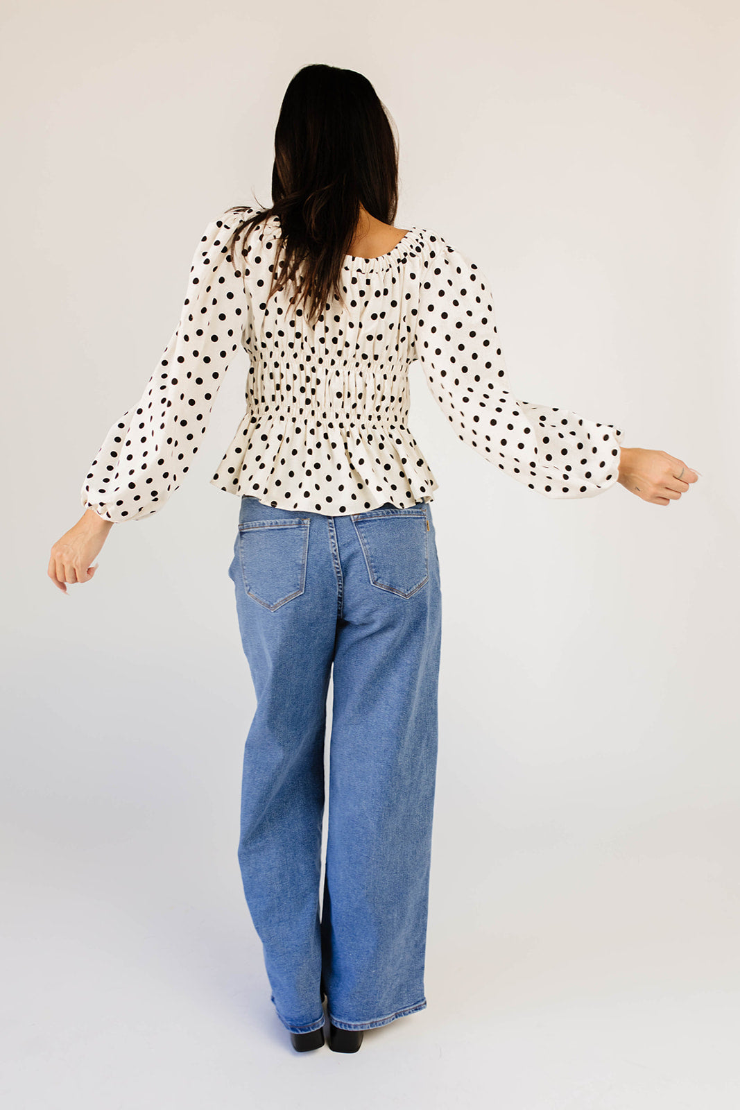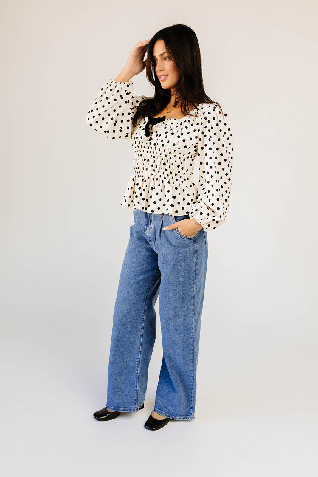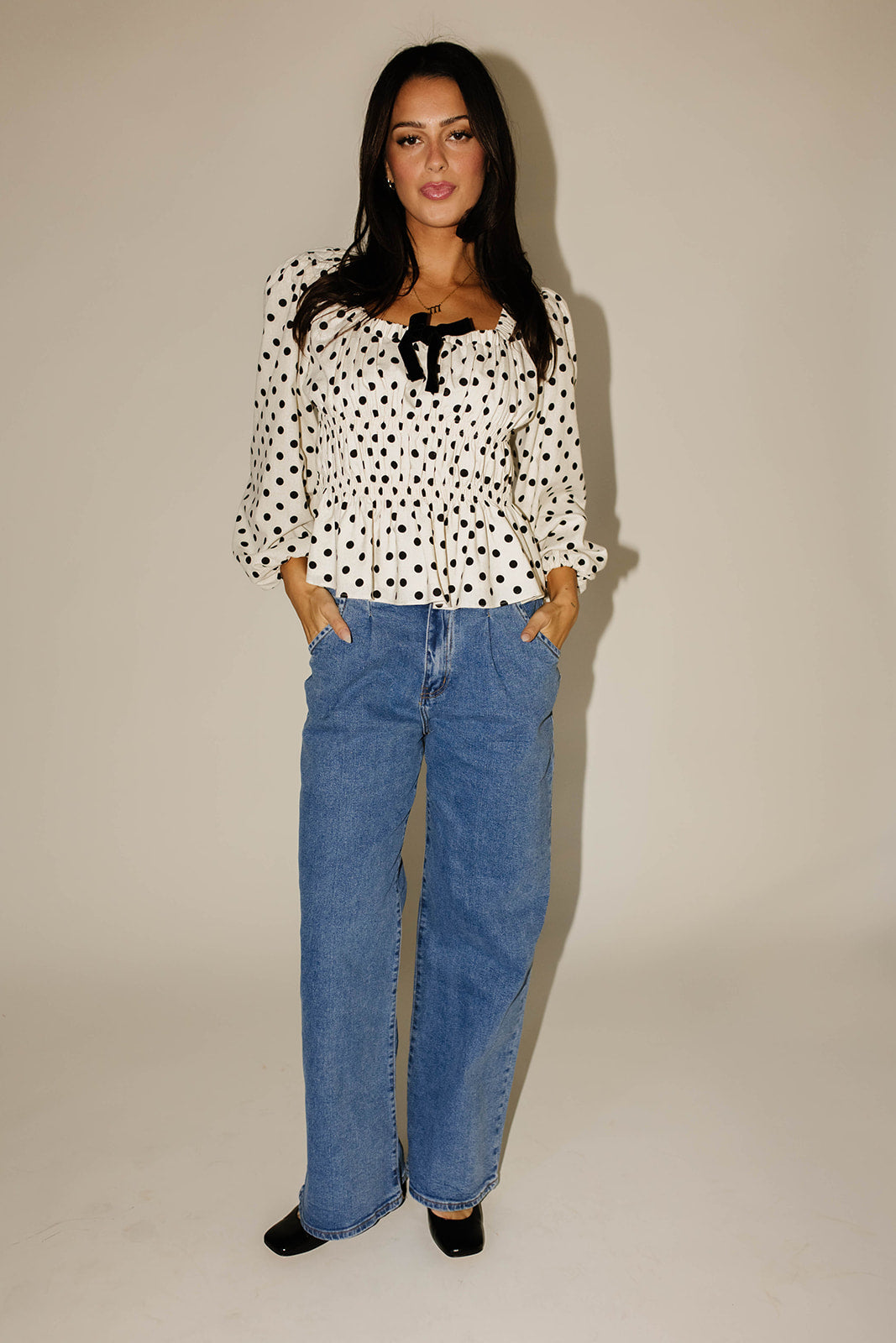 Den perfekta kombinationen av sött och sofistikerat – denna prickiga långärmade topp är en tidlös klassiker. Med långa ballongärmar och en fin svart sammetsrosett är den det perfekta, eleganta basplagget för att klä upp sig för dejtkvällar eller avslappnade för avslappnade utflykter.
