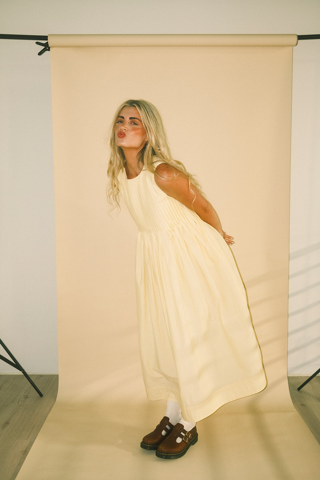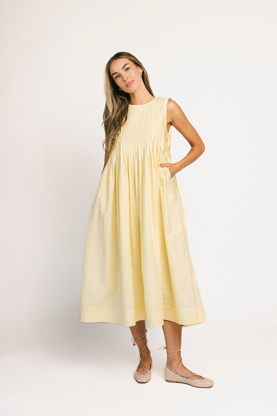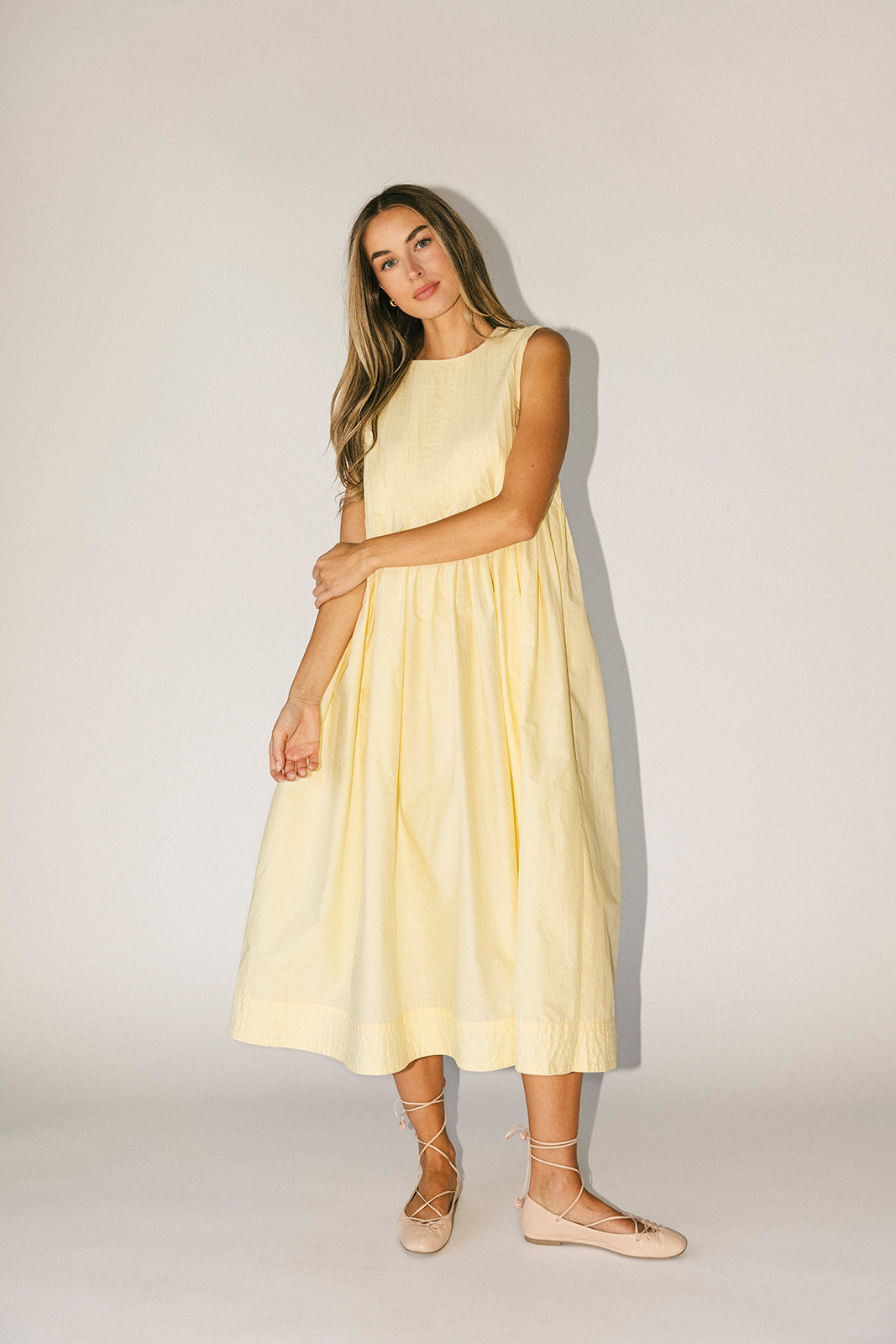 En verkligt speciell klänning vi drömde upp bara för dig – denna smörgula skönhet är lika delar polerad + praktisk. Med sin klassiska a-linjeformade silhuett + bekväma, luftiga tyg ser den lika bra ut som den känns. Den perfekta midiklänningen för fina middagar, vardagliga fester + alla "på-och-gå"-situationer.