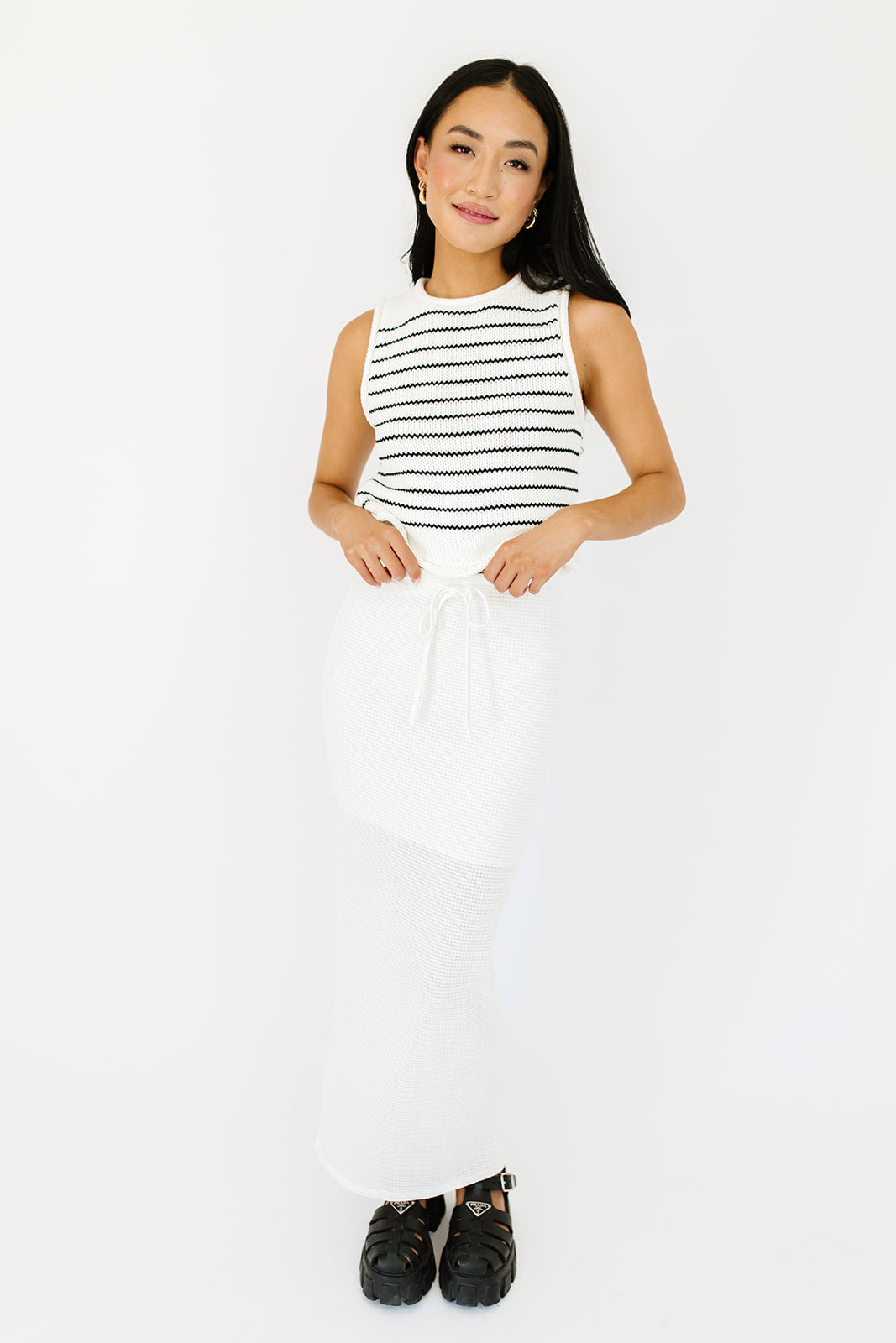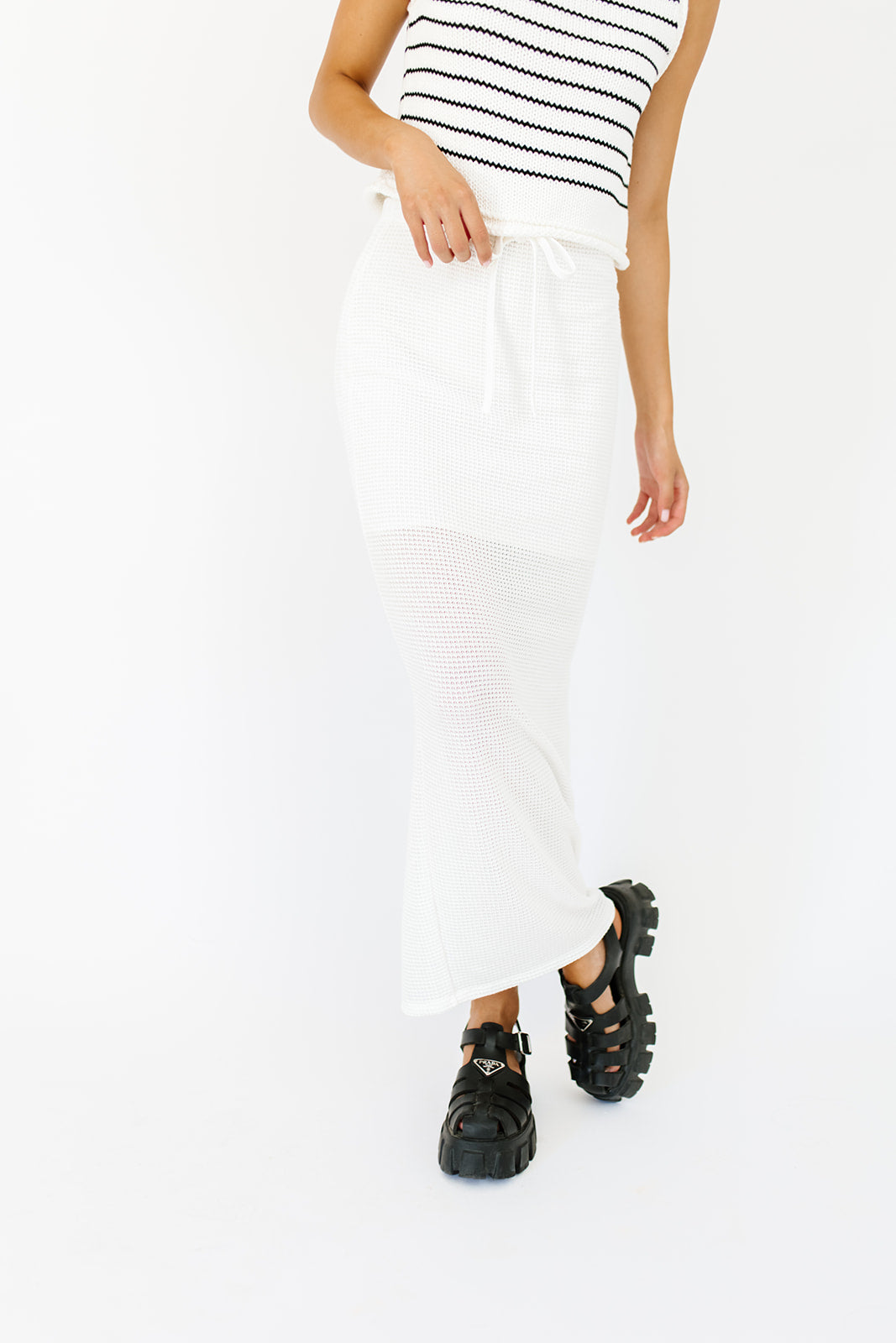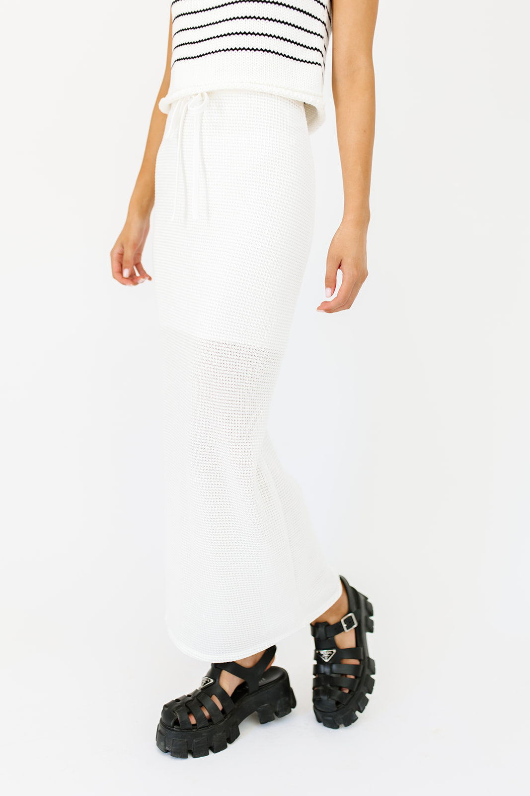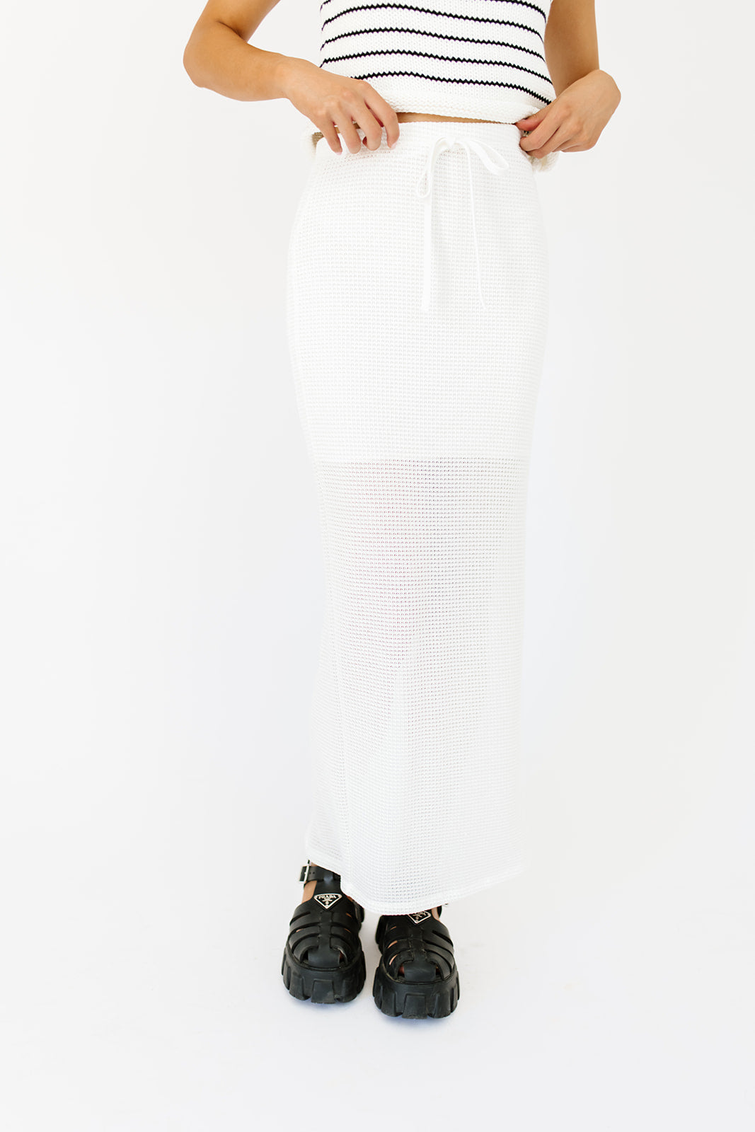 • vit // maxilängd, resår i midjan, knytband fram, slits i sidan, fodrad till knäet